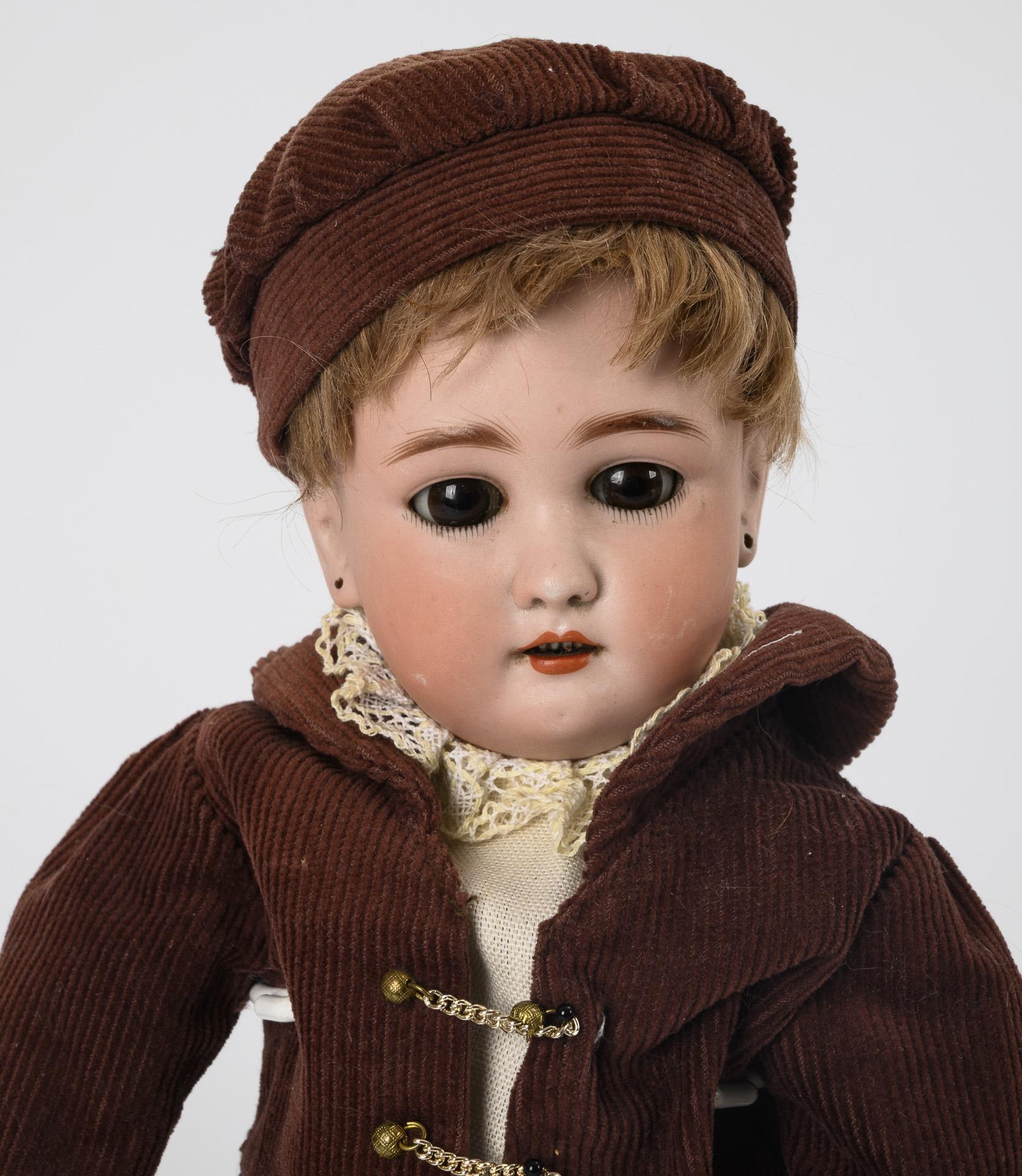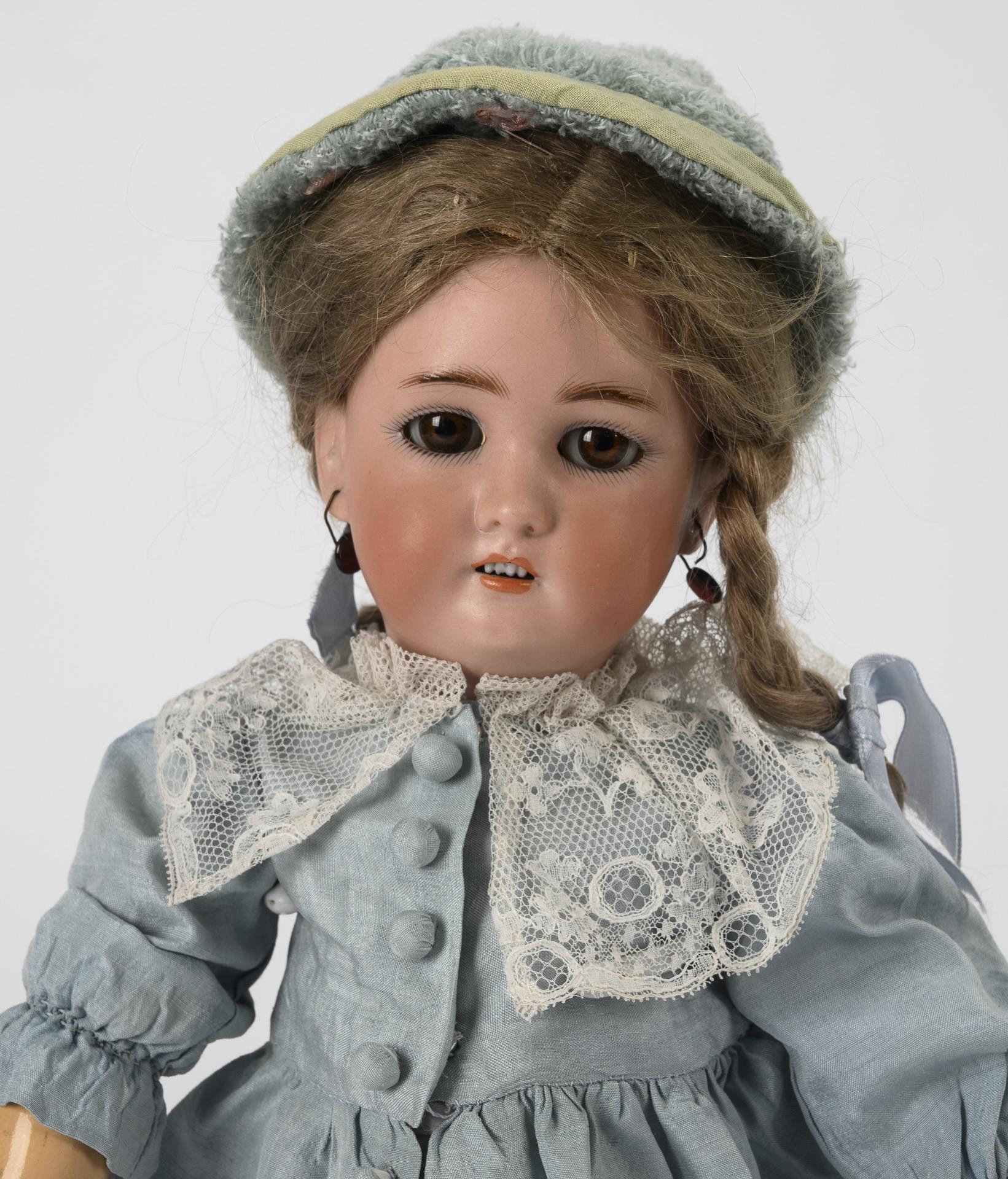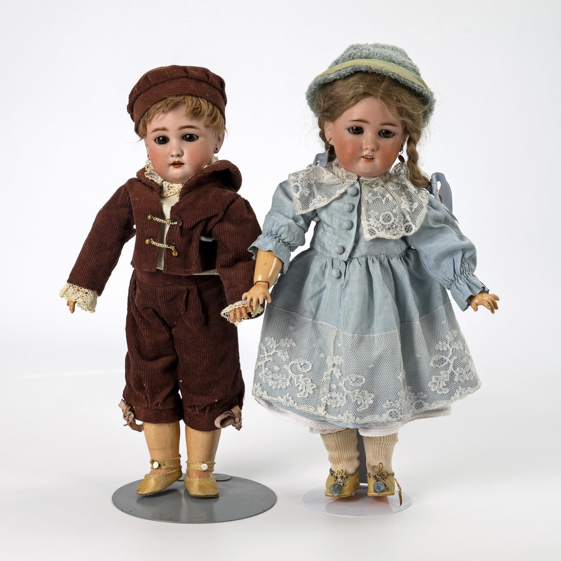 Beide mit Kurbelkopf, braunen Schlafaugen, Ohrlöchern, blonder Mohairperücke und 15-teiligem Gliederkörper. Mädchenpuppe mit hellblauem Kleid, Hut und cremefarbenen Wachstuchschuhen, L 39 cm. Junge mit brauner Cordkleidung, passender Mütze und weißen Stoffschuhen, L 38 cm. Köpfe durchleuchtet: Mädchen ohne Defekte, Knabe mit Haarriss-Spinne am Hinterkopf und Farbdefekt am rechten Fuß.