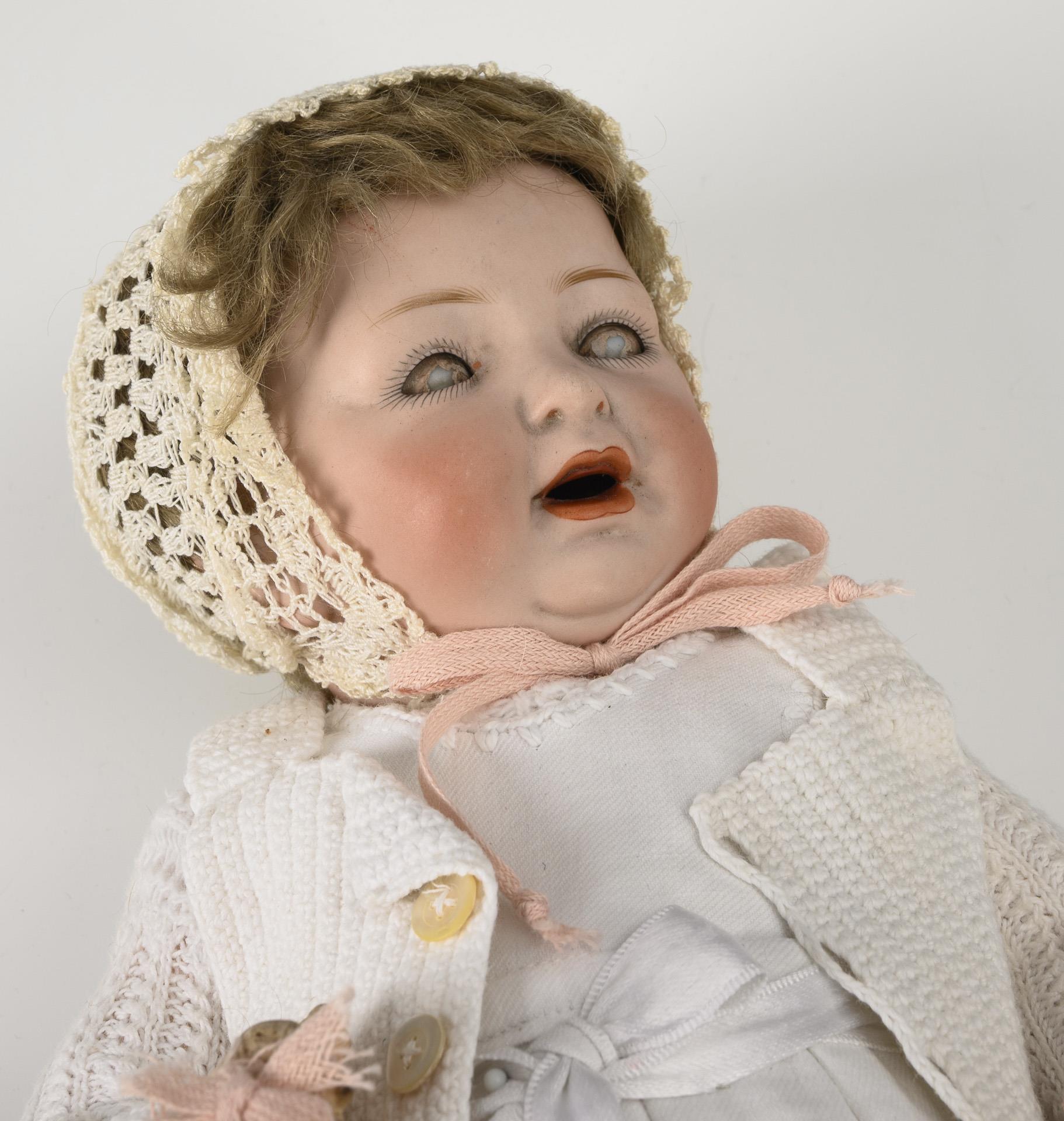 Kurbelkopf, fest vergipster Deckel, braune Schlafaugen, offener Mund, blonde Mohairperücke. 5-teiliger Sitzbabykörper. Weiße Kleidung mit Häubchen. L 30 cm. In alter brauner Holzwiege mit weißem Bettzeug, 25 x 41,5 x 27,5 cm. Chips an der Halskurbel. Körper partiell rissig und retuschiert, 2 Finger rechts bestoßen.