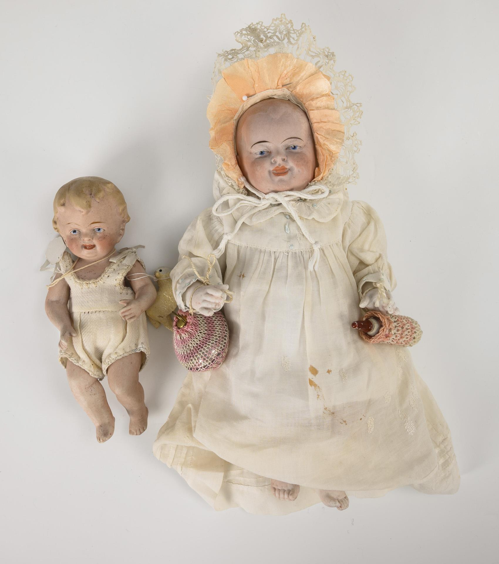 Beide Puppen mit festem Kopf, gemalten blauen Augen, modellierten Haaren und 5-teiligem Sitzbabykörper, jeweils weiß bekleidet. Baby (L 25 cm) mit Flasche und Wärmflasche, blondes Kleinkind (L 17 cm) mit Flasche und Holzschaf. Hellgrauer Trousseau mit Altersspuren und Reparaturstellen. Altersspuren, Kleinkind mit kleinen Bestoßungen.