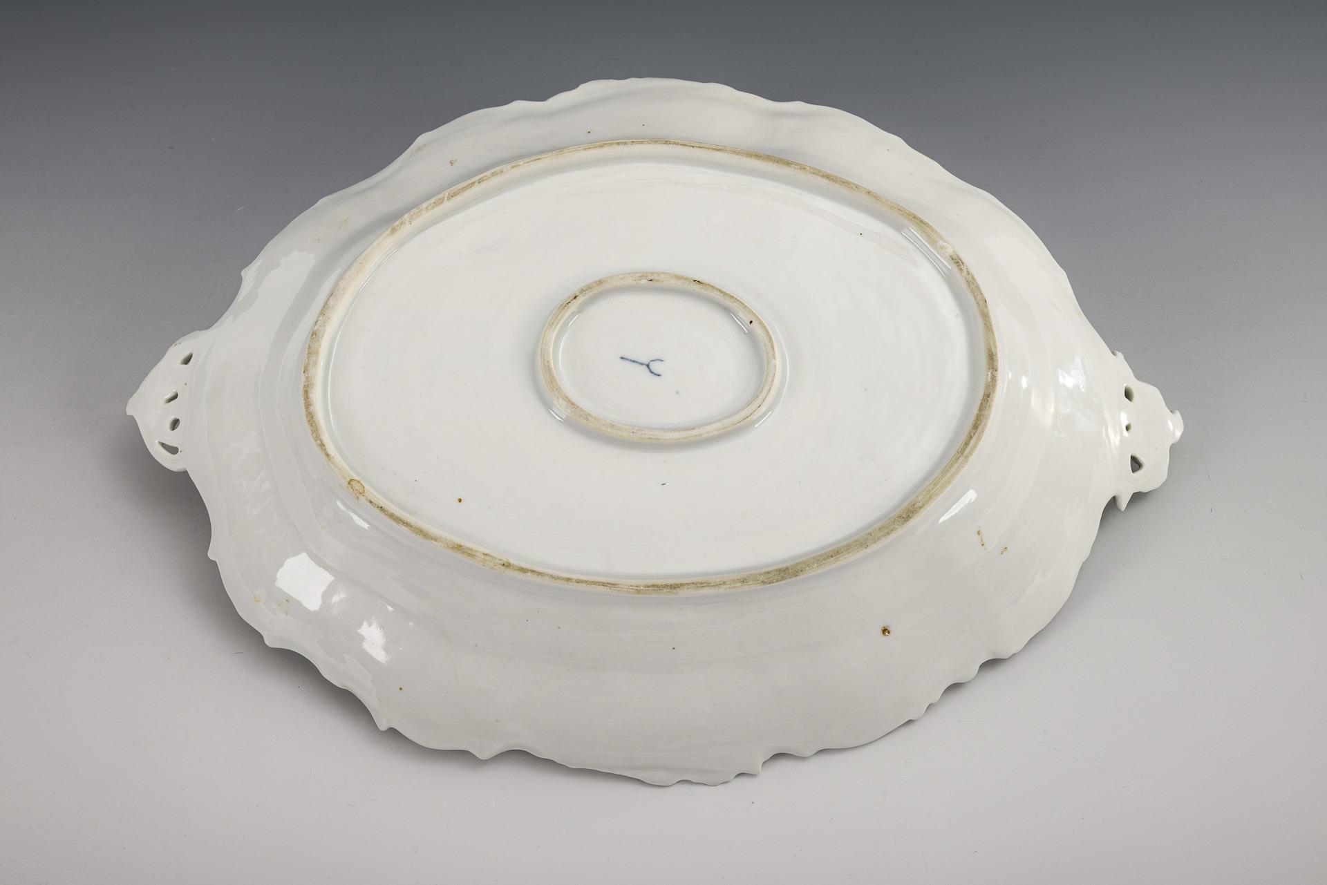 Ovale Schale mit Rocaille- und Korbrelief sowie zwei Rocaillehandhaben. Im Spiegel ein Blumenbukett umgeben von Streublümchen. 1 Handhabe bestoßen.