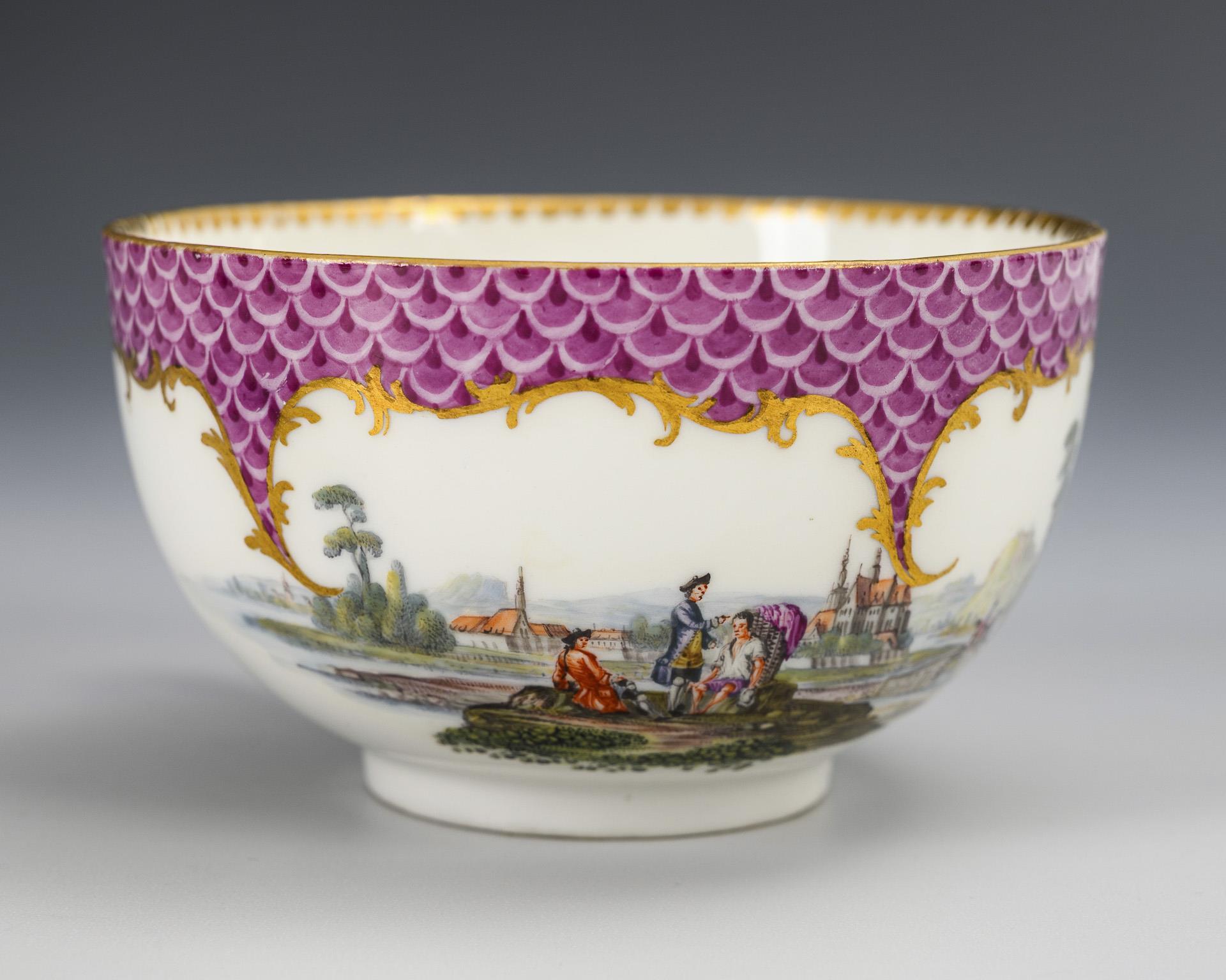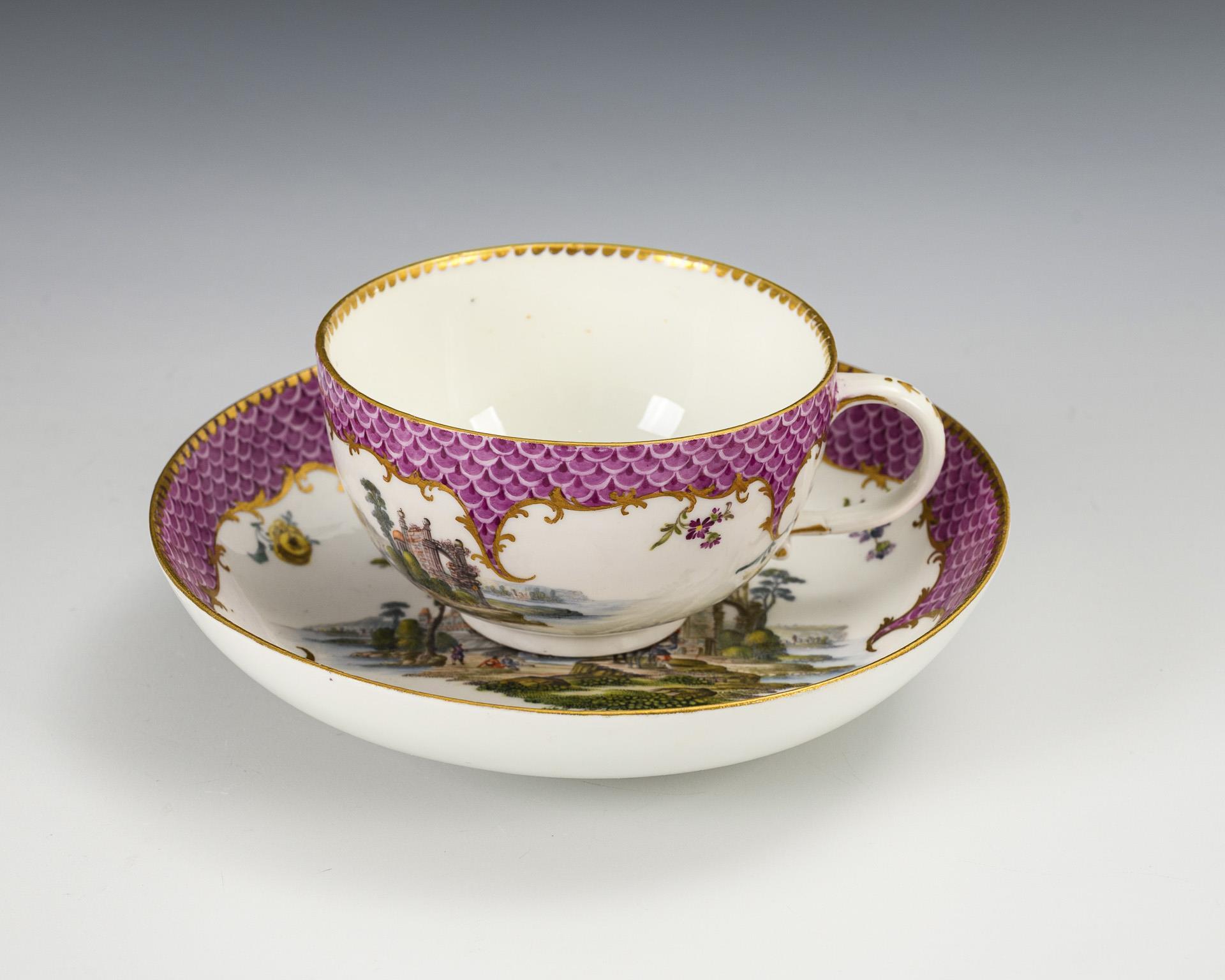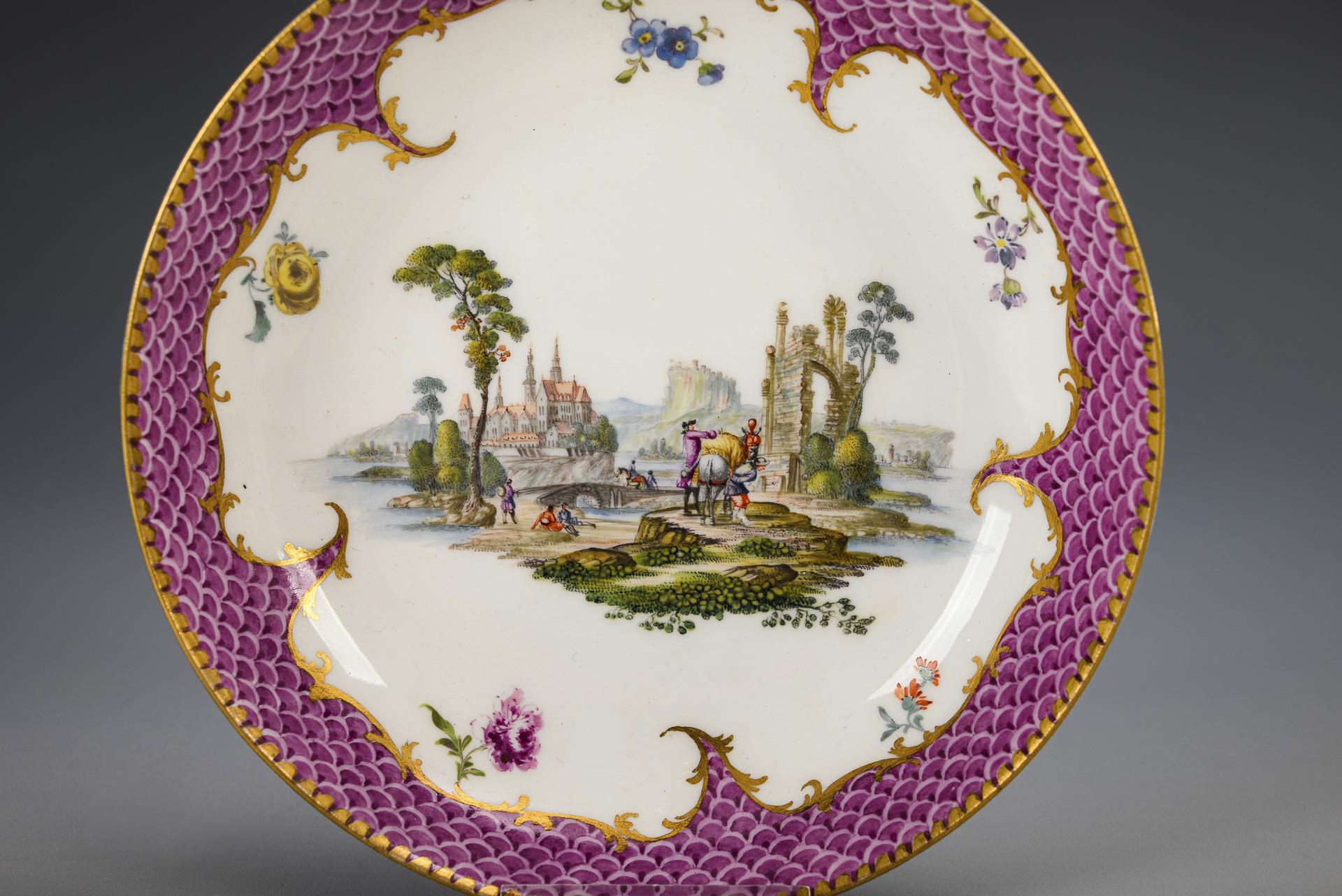 Bauchige Tasse mit Ohrenhenkel. Purpurfarbene Schuppenbordüre. Auf der Tasse sowie im Spiegel der Untertasse eine fein gemalte Flusslandschaft mit Schlössern, Ruinen und Handelsleuten. Kurzer Brandriss im Henkel (nicht durchgehend).