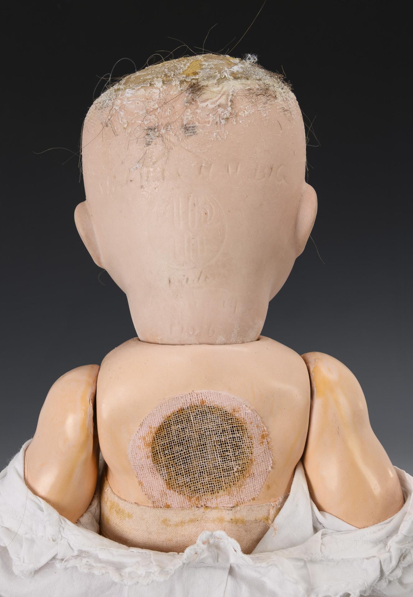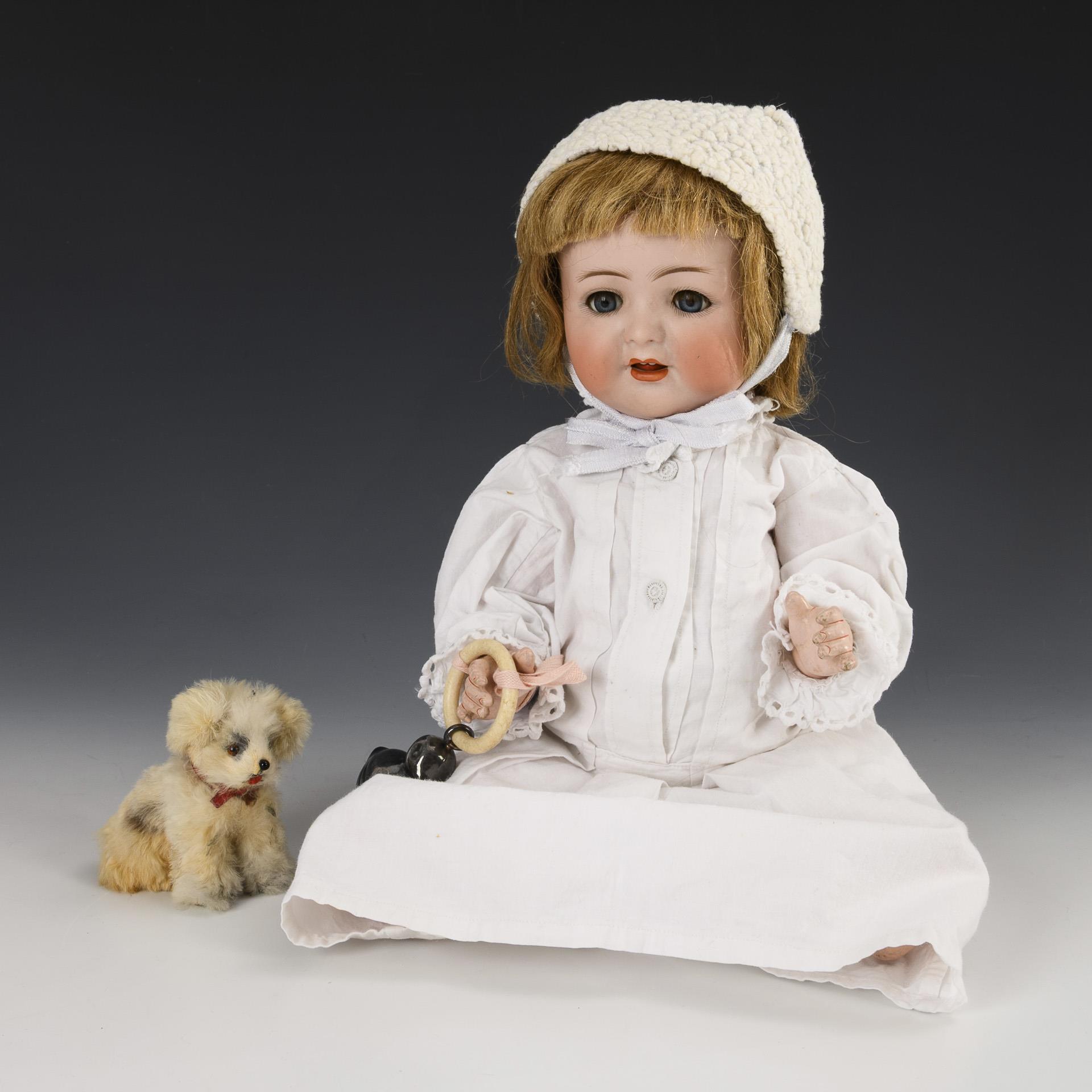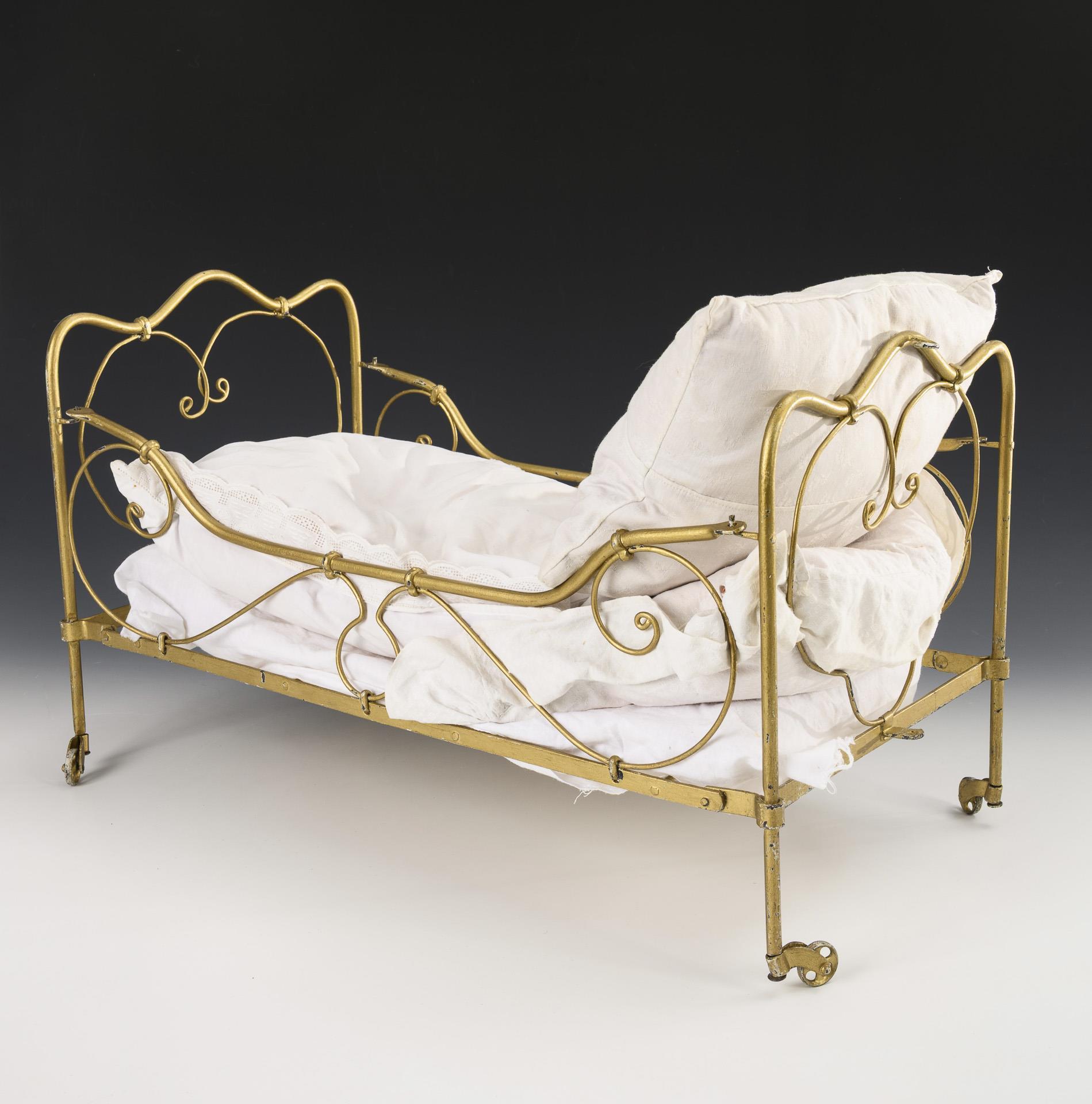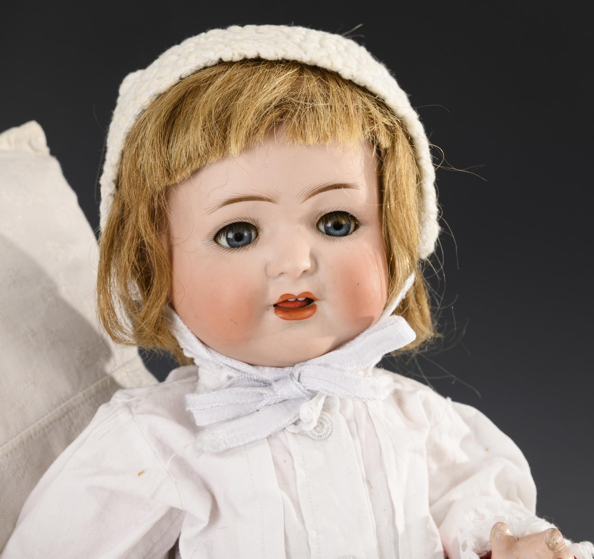 Kurbelkopf mit fest verklebtem Deckel, blaue Schlafaugen, Wimpern, blonde Echthaarperücke. 5-teiliger Stehpuppenkörper mit verstummter Stimme. Weißes Nachthemd, weiße Haube, L 36 cm. Mit Fellhündchen und Rassel. Dazu goldbronziertes Metallbett mit weißem Bettzeug, 33 x 55,5 x 30 cm. Kopf nicht durchleuchtet: keine Defekte sichtbar. Bett mit Lackdefekten.