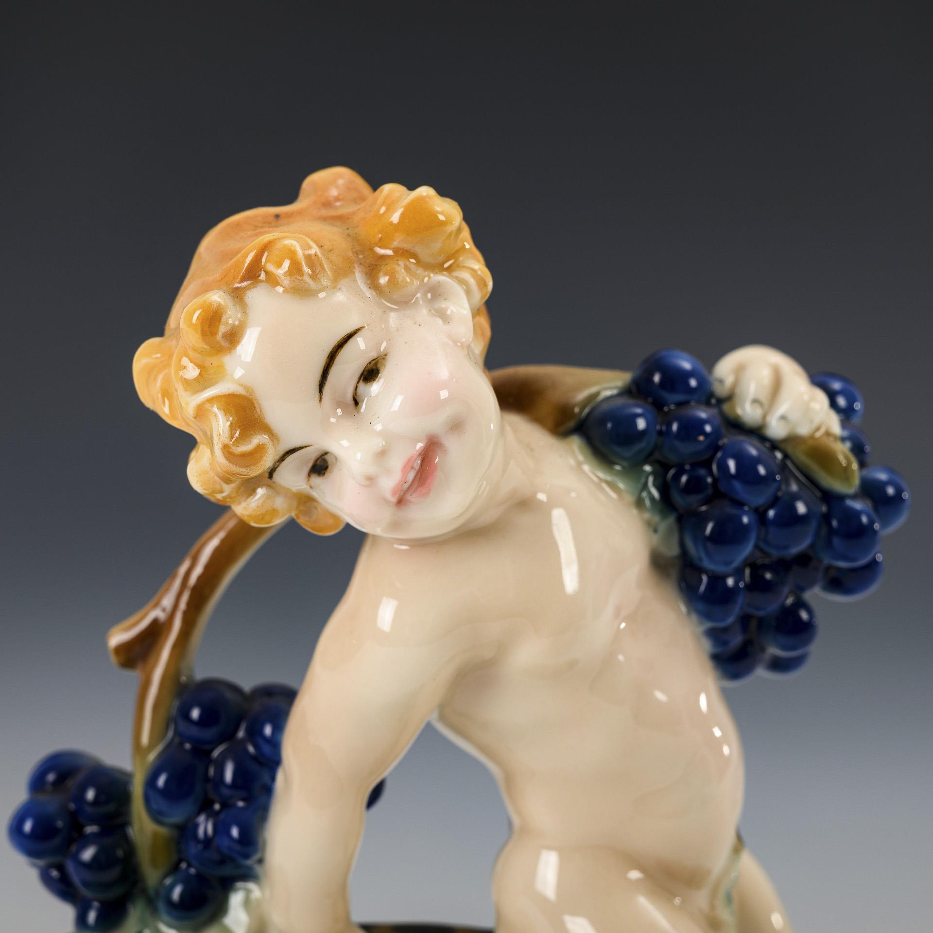 Auf einem Leoparden reitender, einen großen Traubenzweig tragender Putto.