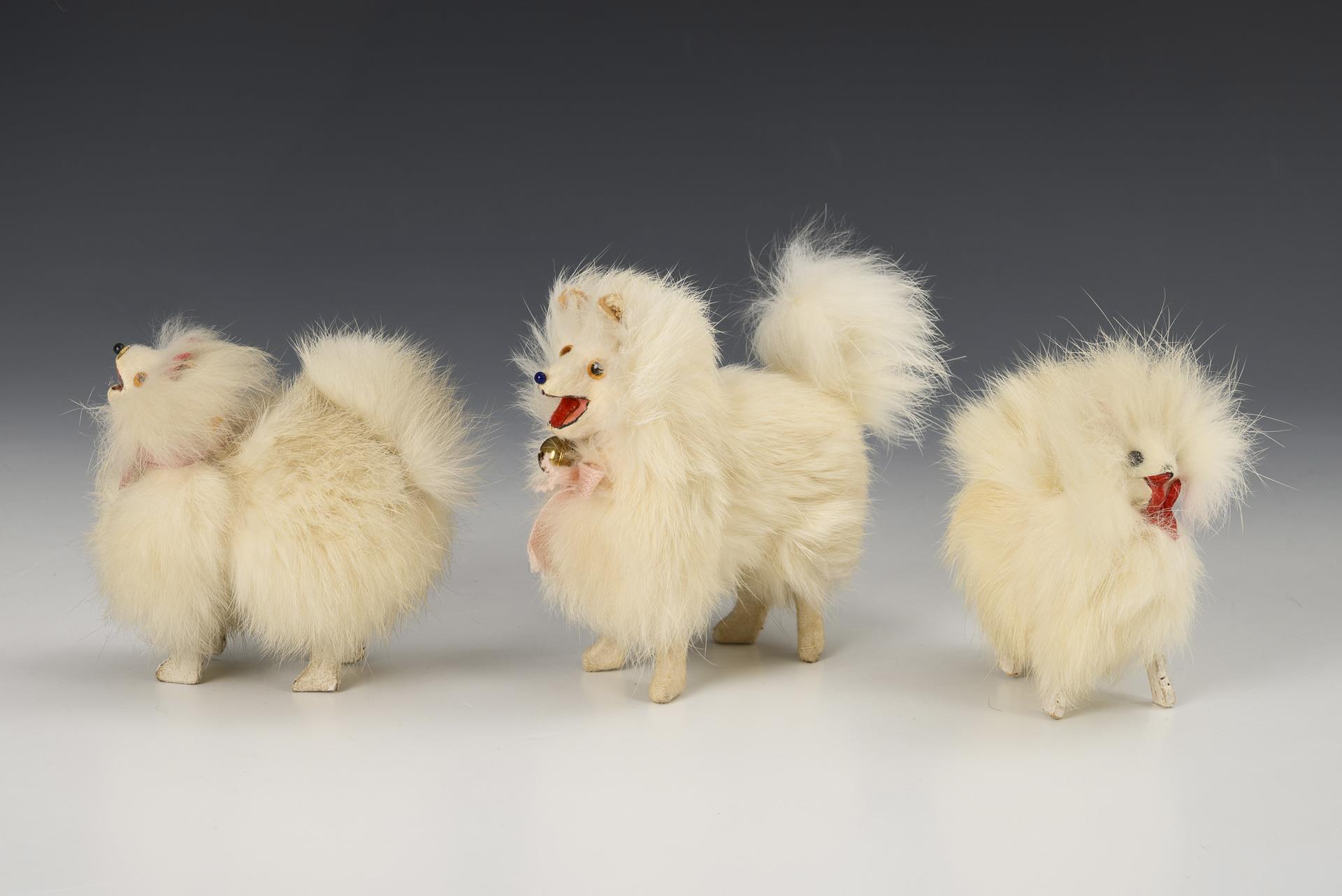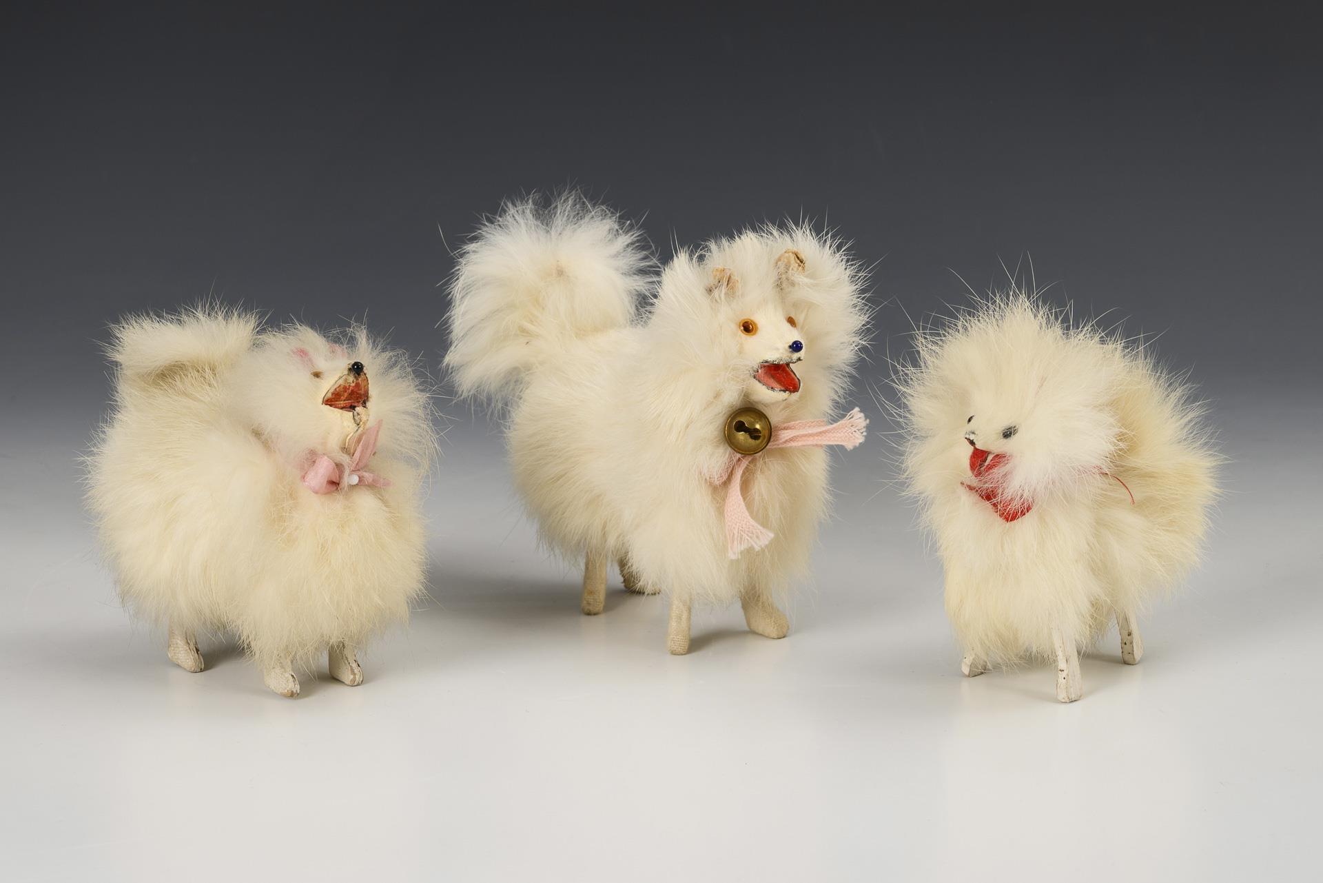 Weiße Spitze mit echtem Fell, Glasaugen und offenem Maul.