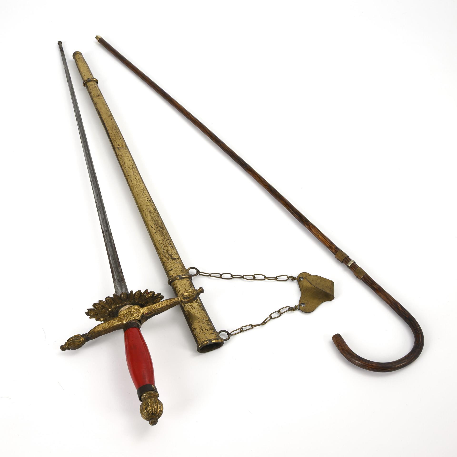 Florett mit Dreikantklinge und Messingscheide und rotem Griff sowie Gehänge. / Rattan-Spazierstock mit Rundhakengriff und 3 Manschetten sowie goldfarbener Metallspitze. Florettspitze und Parierstange geschweißt, Scheide mit Knickspur, Griff locker, mit gerissener Manschette. Stockspitze ergänzt.