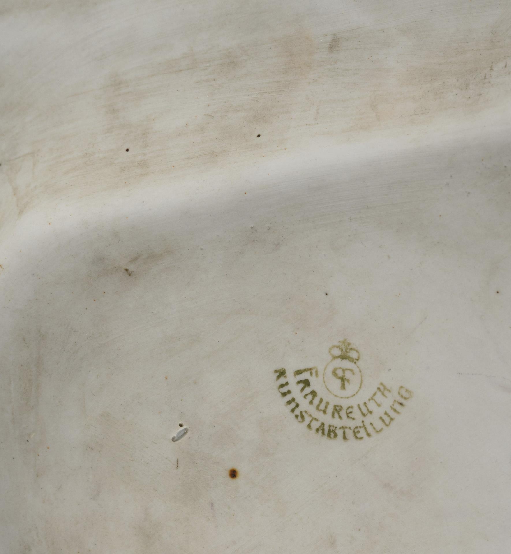 Motiv aus dem Märchen "Aschenputtel". 1x sitzende, ihren linken, unbeschuhten Fuß auf einem Kissen präsentierende Dame. / 1x stehender, auf den Fuß der Dame schauender Kavalier, einen Schuh in seiner linken Hand haltend. Fuß, linke Hand und Hals der Dame restauriert, Degengriff und -spitze des Herren fehlen, partieller Goldabrieb.