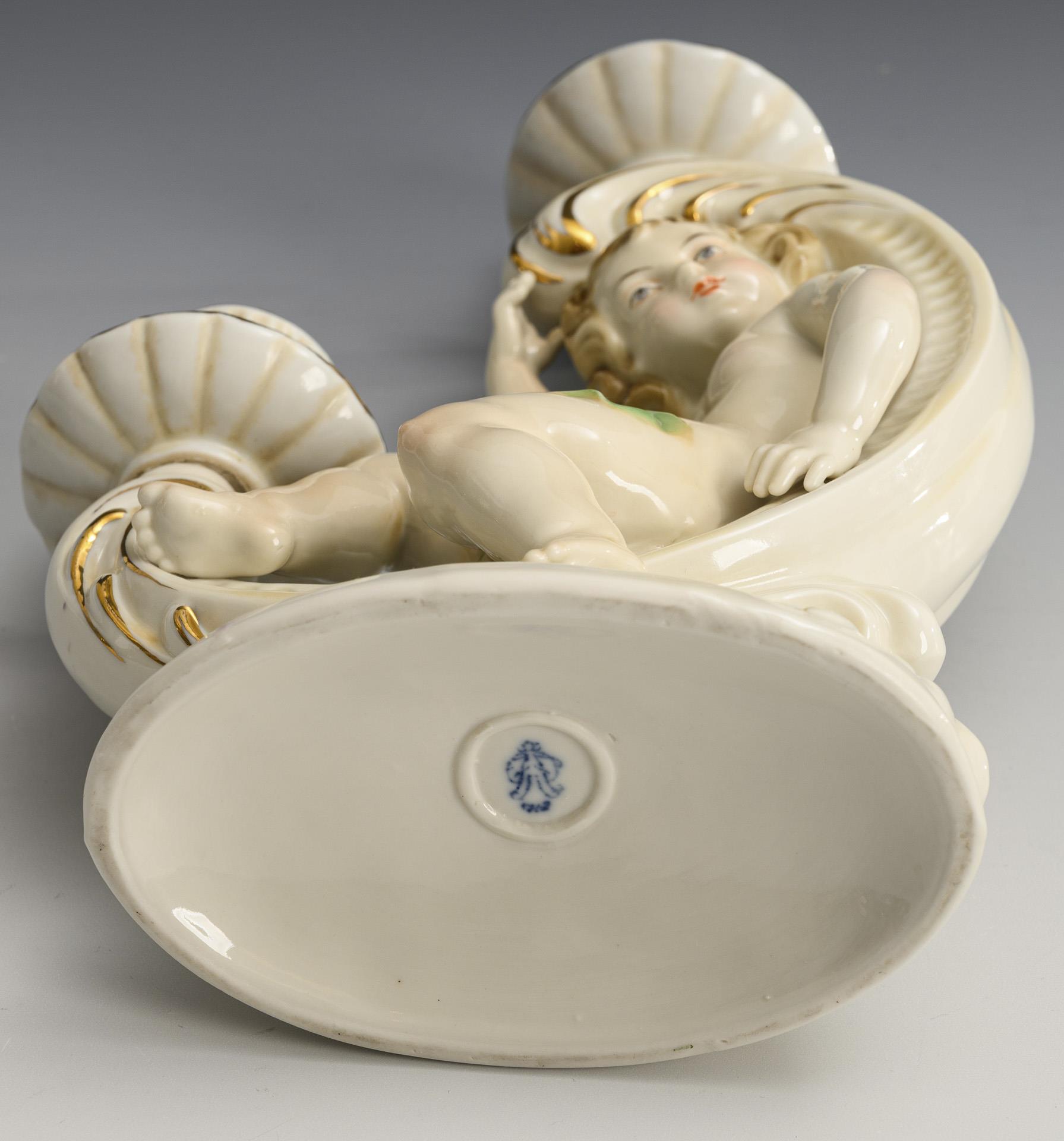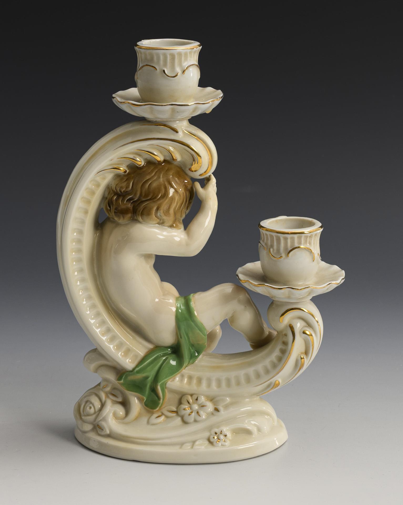 2-flammiger Leuchter mit einem in der Rocaille sitzenden Putto.