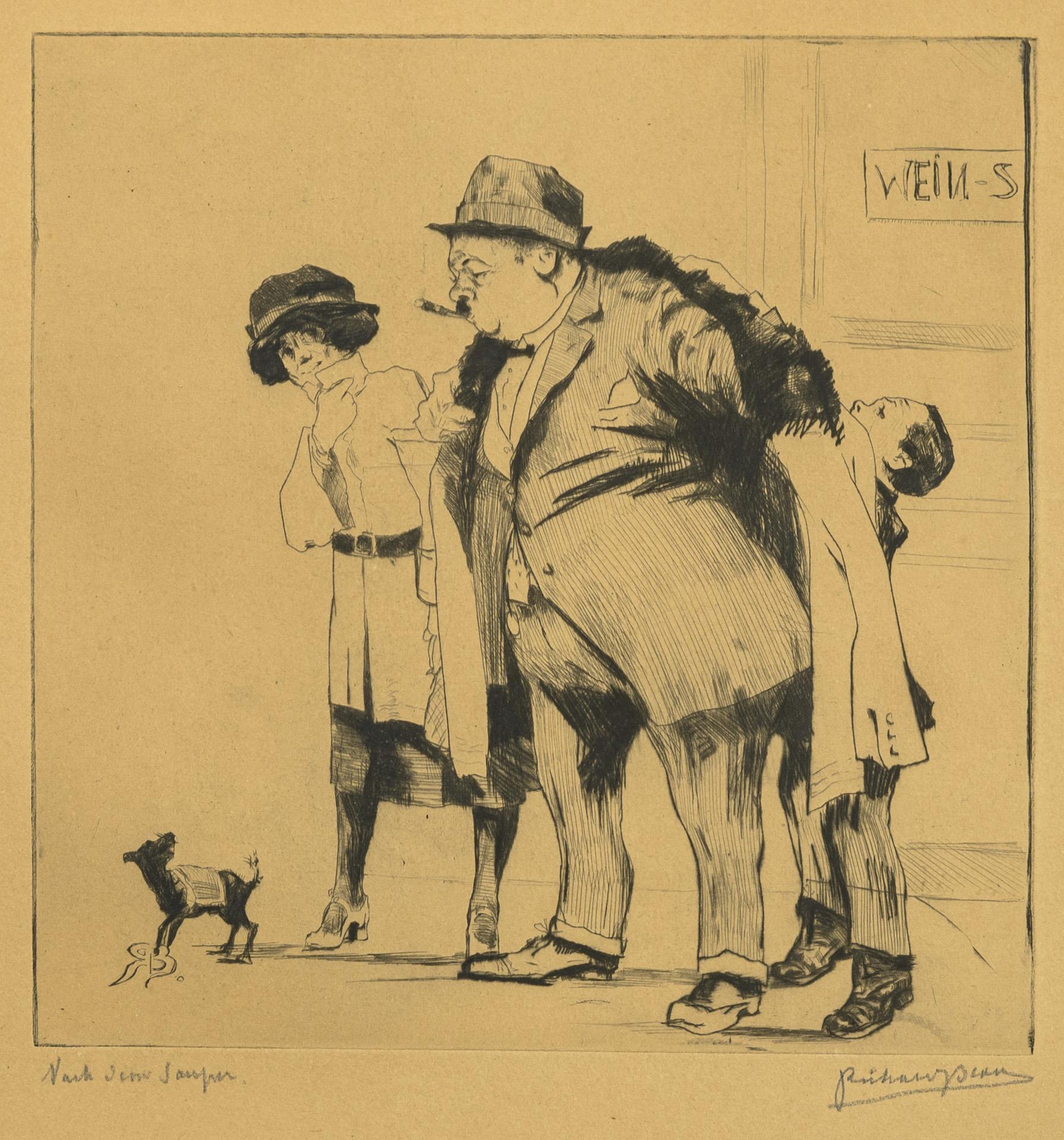 Ein beleibter Herr verlässt das Restaurant. Blatt rechts unten mit "No.3" bezeichnet.