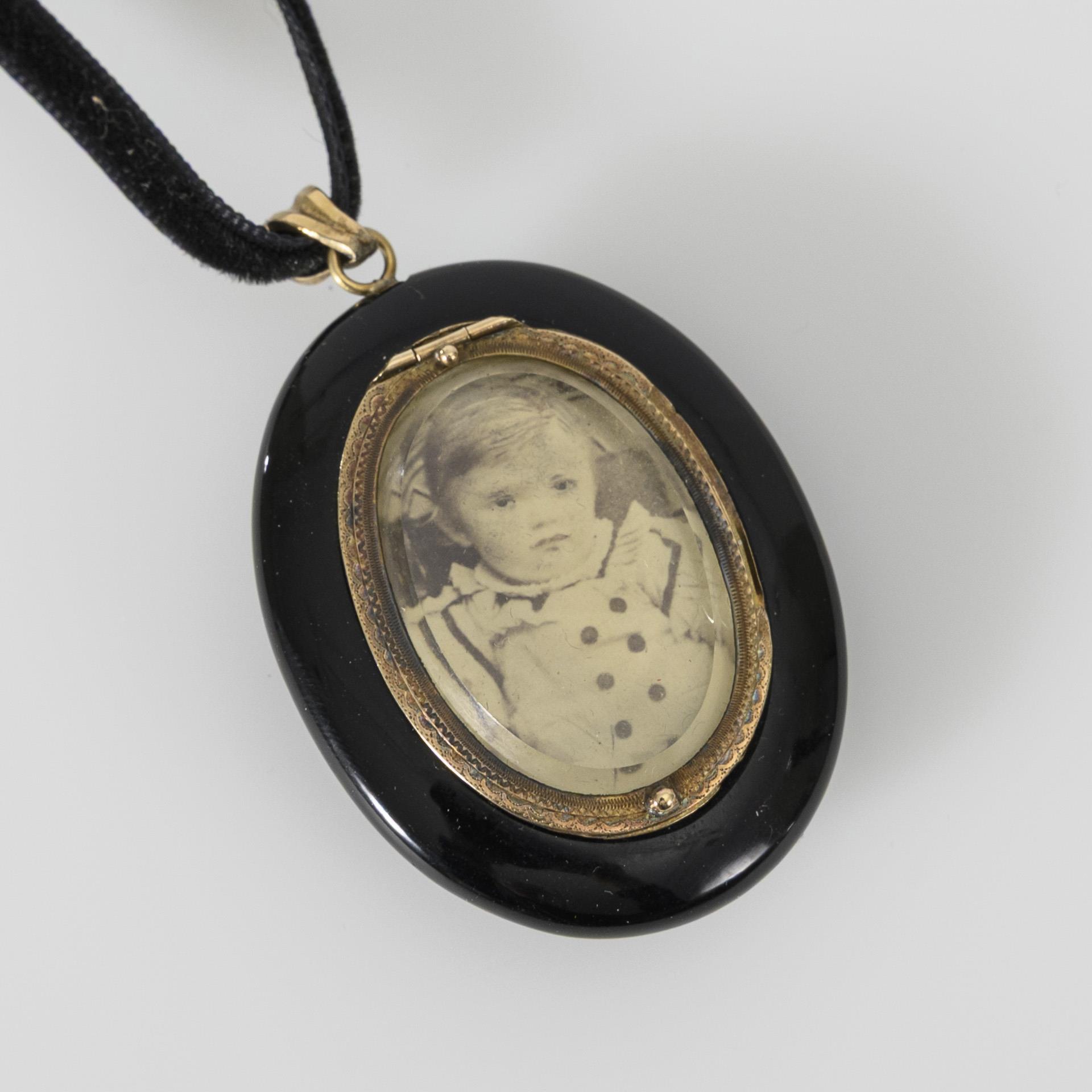 Historischer Medaillonanhänger an einem schwarzen Samtband, entstanden wohl in der späteren 2. Hälfte des 19. Jahrhunderts, darauf aufgesetzt ein Schmuckelement mit Saatperlenbesatz in Form einer Schwertlilien-ähnlichen Blüte und Blattwerk. Zeittypisch wohl ursprünglich als Trauerschmuck hergestellt (schwarzes Material und Perlen als Tränen- und Trauersymbolik). Rückseitig mit Verglasung zum Einlegen z. B. eines Fotos; derzeit eine ausgeschnittene historische Fotografie eines kleinen Jungen eingelegt. Leichte, altersgemäße Tragespuren: 4 halbe Saatperlchen fehlen, die Verglasung innen mit randseitigem Chip, dies von außen nicht zu sehen; das Glas hält sicher.