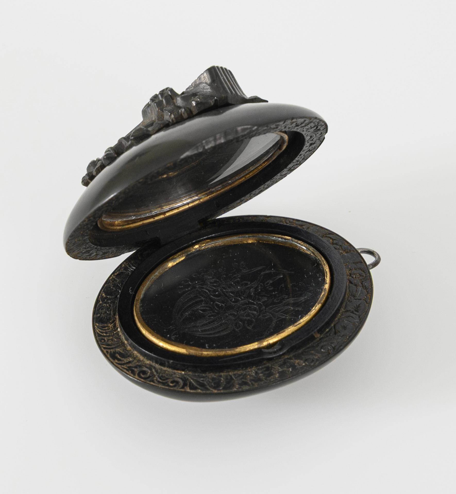 Modische Popularität über persönliche Trauerkontexte hinaus erreichte schwarzer Schmuck besonders nach dem Tod des britischen Prinzgemahls Albert von Sachsen-Coburg und Gotha (1861) im Zuge der von Königin Victoria (letztlich lebenslang) anhaltend getragenen Trauerkleidung, zu der auch schwarzer Schmuck gehörte. In Großbritannien meist aus Whitby Jet (Gagat) hergestellt, wurde bald zur Bedienung der hohen Nachfrage über alle Schichten hinweg auch Schmuck aus preisgünstigeren schwarzen Materialien angefertigt, z. B. aus schwarzem Glas, aber auch frühen Kunststoffen. Ebonit wurde 1851 von Charles Goodyear patentiert und fand in der Herstellung von schwarzem Schmuck in der 2. Hälfte des 19. Jahrhundert häufig Anwendung. Leichte, altersgemäße Tragespuren, beide verglaste Innenrahmen intakt.