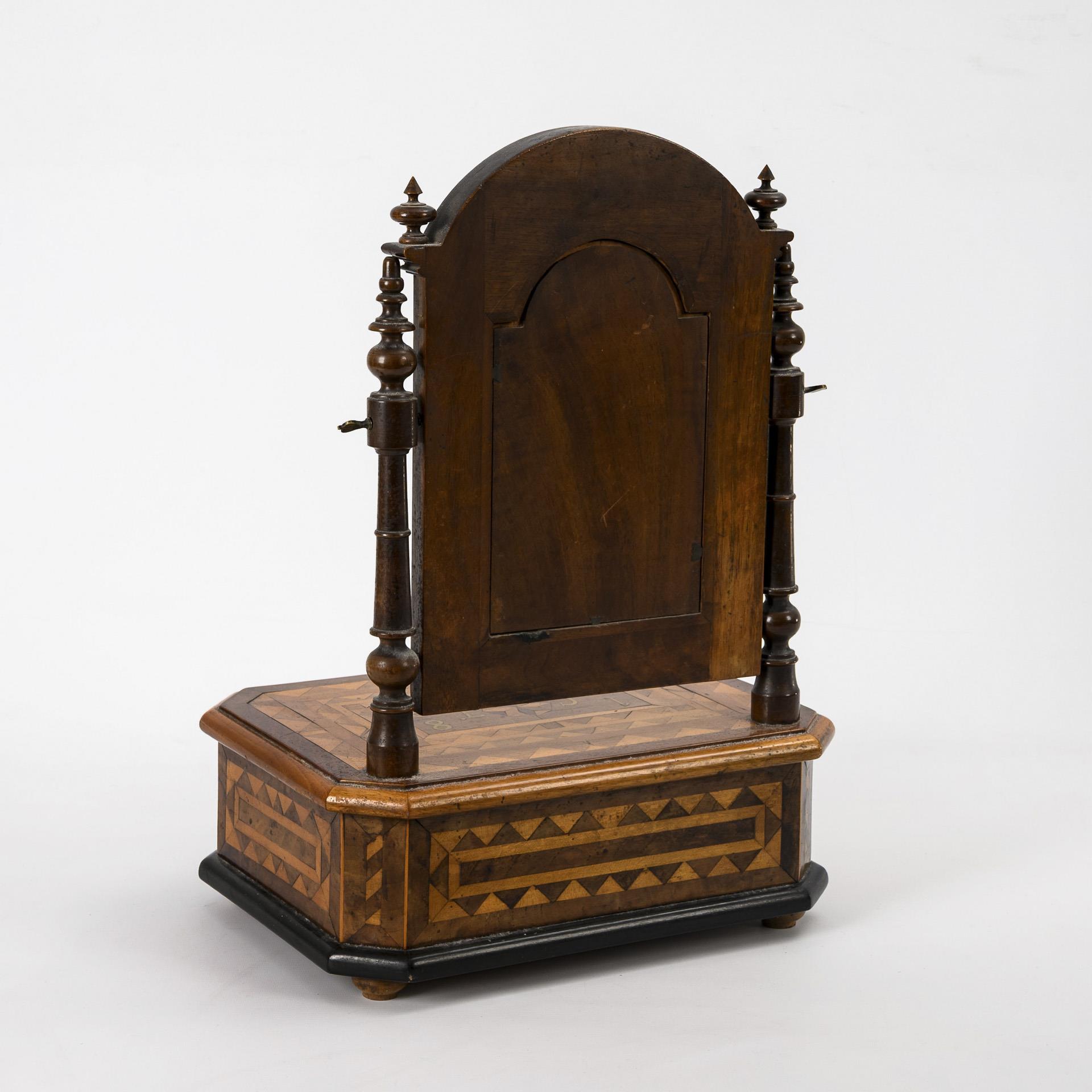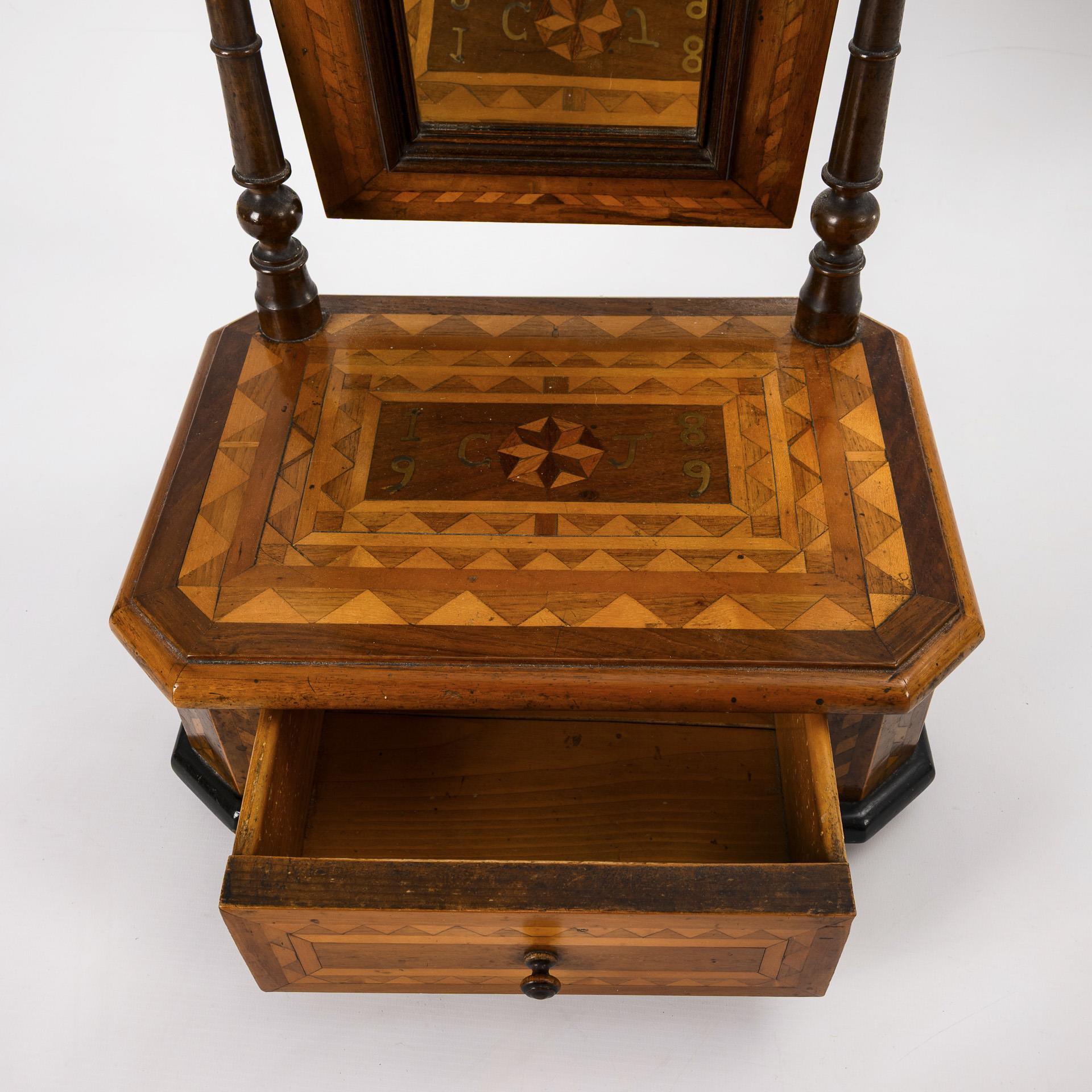 Sockel mit abgeschrägten Frontecken und Schub sowie Marketerien als Scheinkassetten; auf dem Decke zentraler Marketerie-Stern, flankiert von Messingeinlagen: "CJ 1899". Zwischen den Drechselsäulen drehbar gelagerter Spiegel mit Marketerie-Rahmen und Rundbogenabschluss. Minimale Alters-/Gebrauchsspuren.