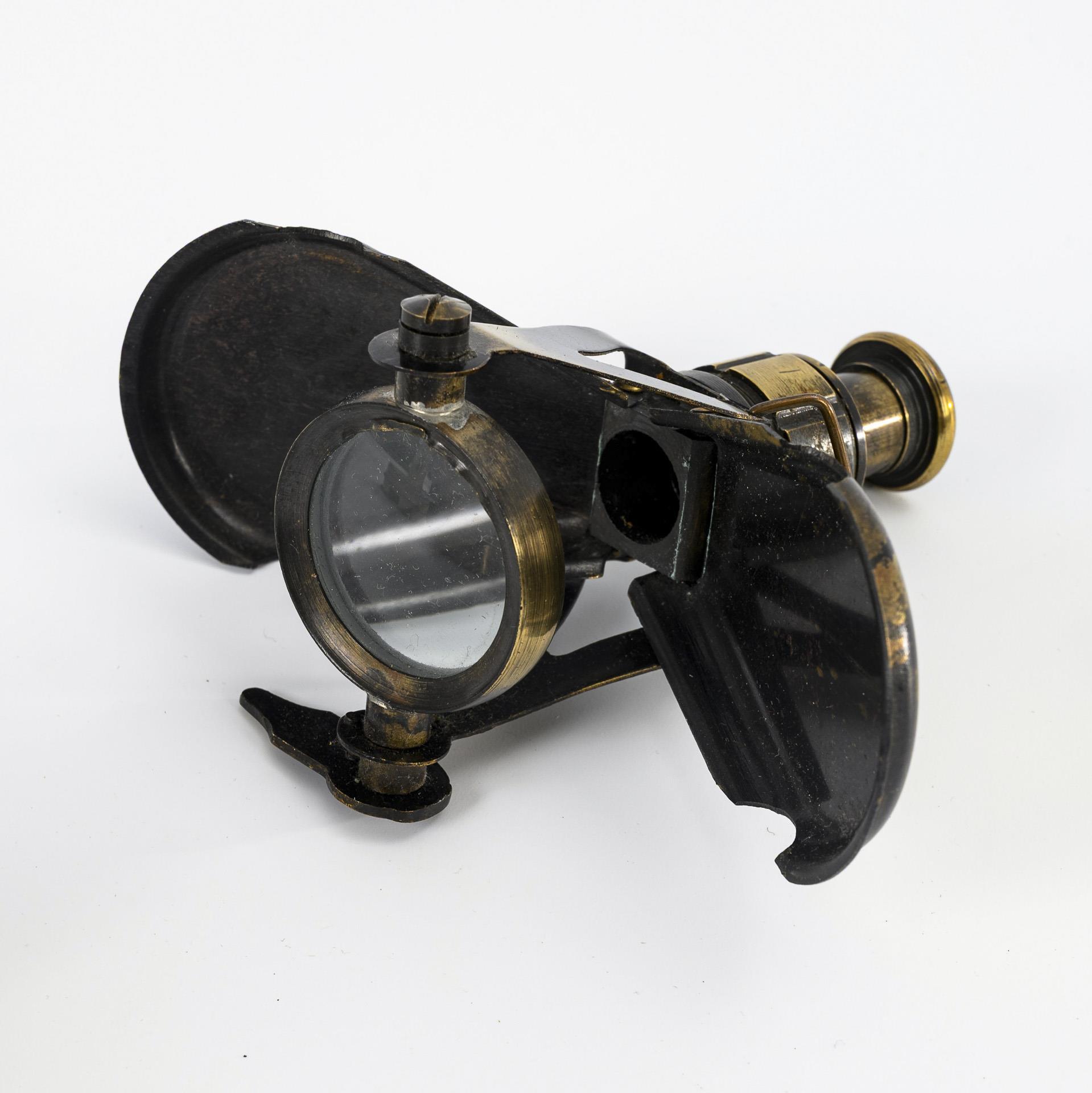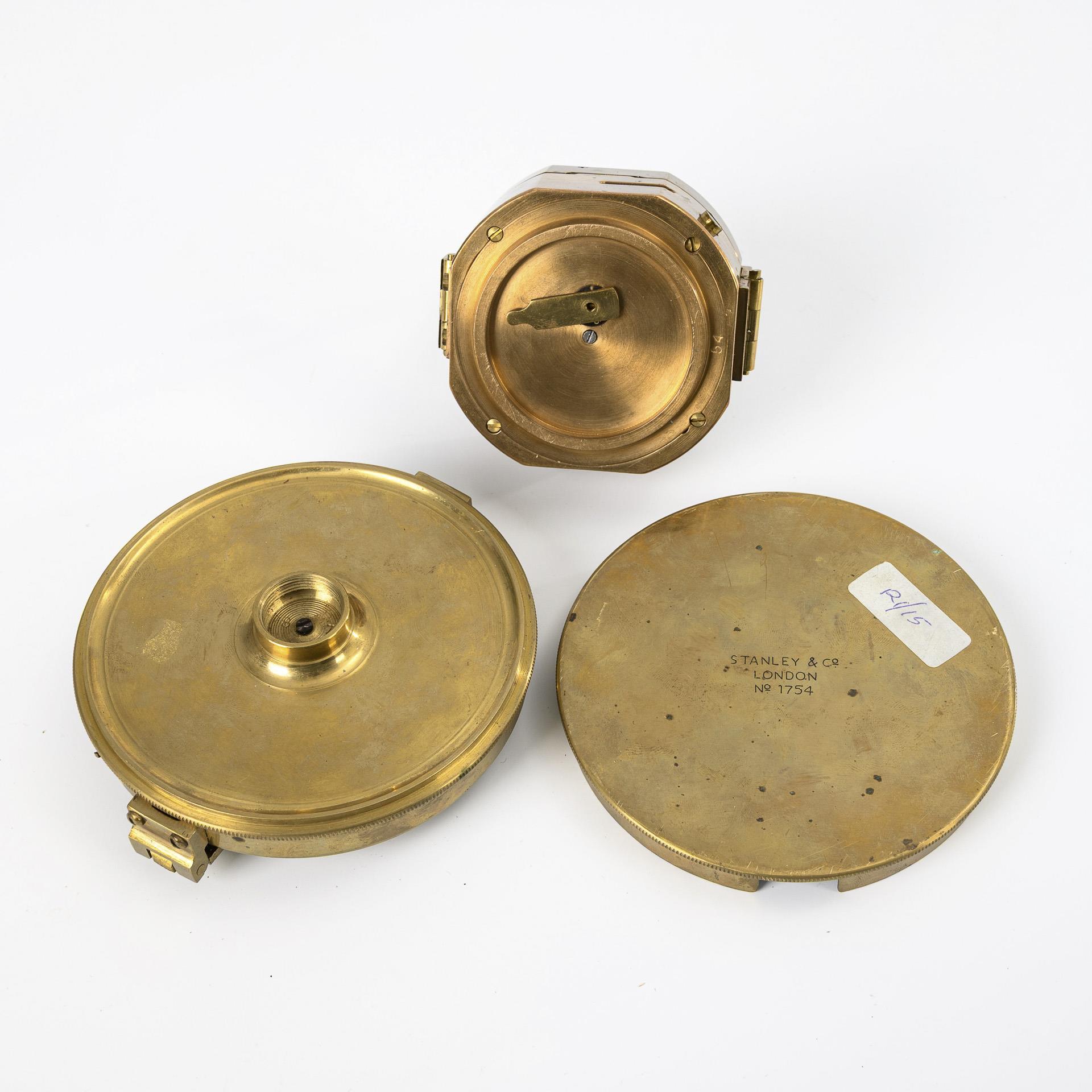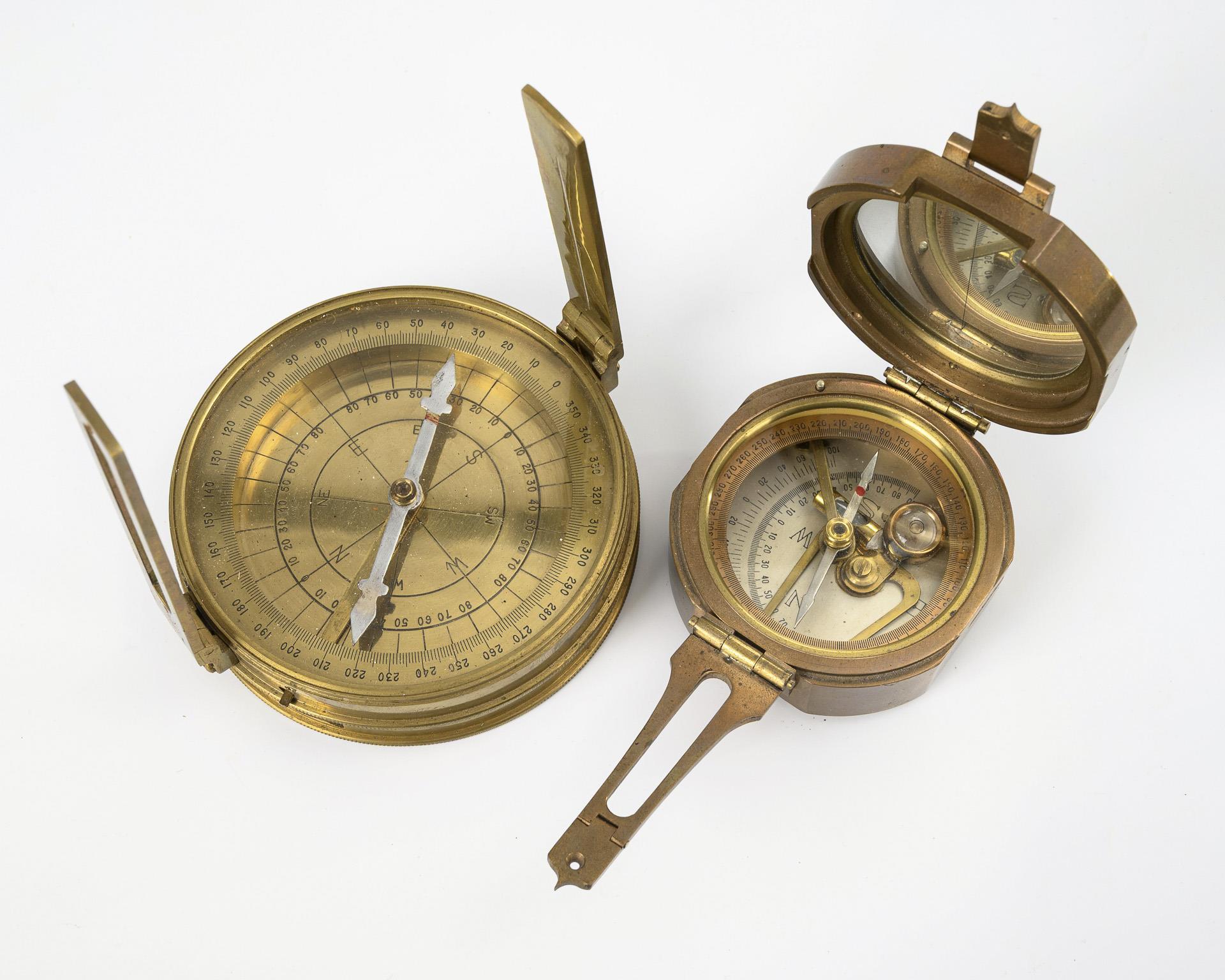 Wohl britischer Peilkompass mit ausklappbarem Peilstab und Spiegel im Scharnierdeckel. Unter der Verglasung Kompass mit automatischer Nadelarretierung, 2 Libellen und drehbarer Nonius über 2 Quadranten. / Großer Peilkompass (Geologenkompass) auf dem Passdeckel "Stanley & Co. London" gemarkt mit Nr."1754". Auf dem Boden Gewinde für ein Stativ, 2 Skalen: 360° bzw. 4 Quadranten a 90°, Dioptervorrichtung bestehend aus zwei klappbaren Visieren (Deckel schwergängig, Nadelarretierung defekt). / Taschenkompass mit aufklappbarem Objektiv zwischen den Schutzdeckeln sowie Riemenöse.