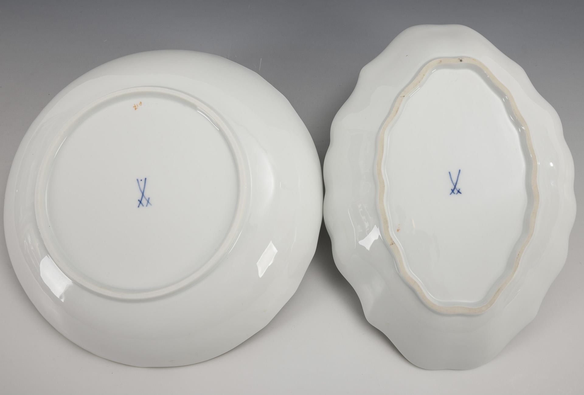 1x ovale Schale mit einer Irisblüte im Spiegel (L 26 cm). / 1x runde Schale, Modell "Neubrandenstein" mit Blumen- und Insektenmalerei (Ø 24,5 cm).