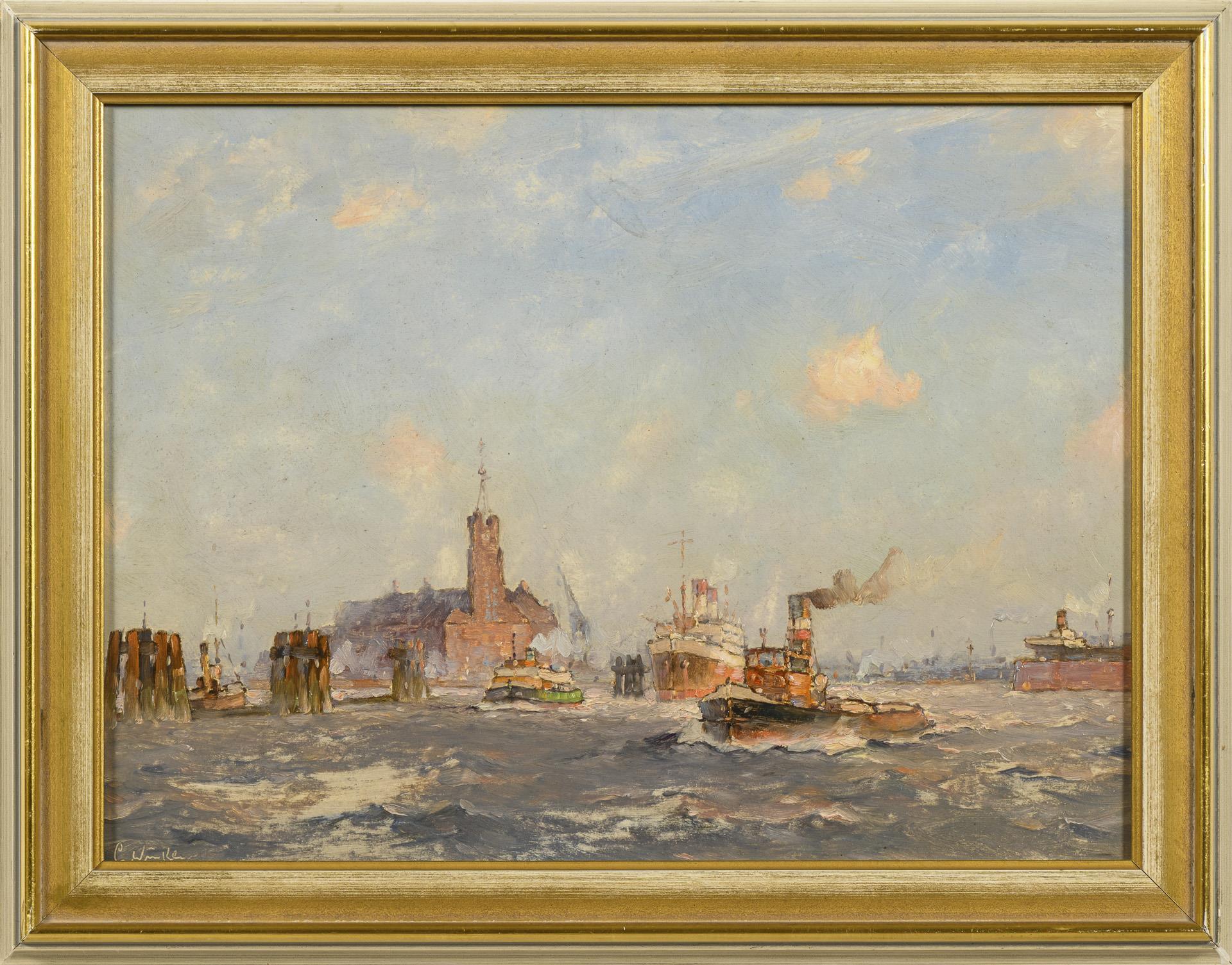 Viele Schiffe im Sonnenschein vor dem Hafen .