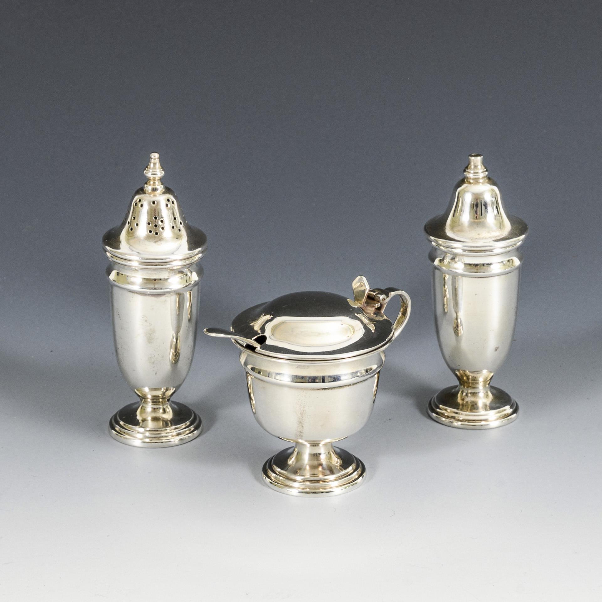 4-teiliges Set bestehend aus: 2 Streuern und Senfgefäß mit Glaseinsatz und Löffel. In schwarzem Originaletui. Gebrauchsspuren, teils kleine Dellen.