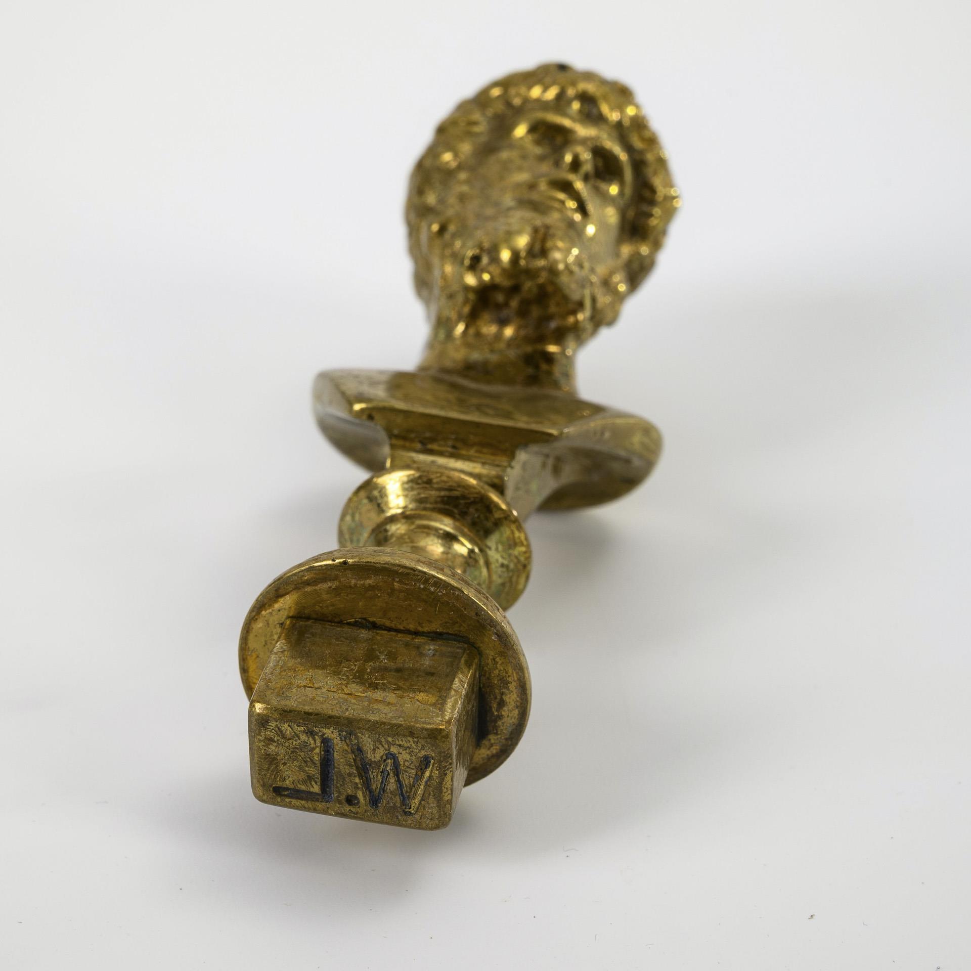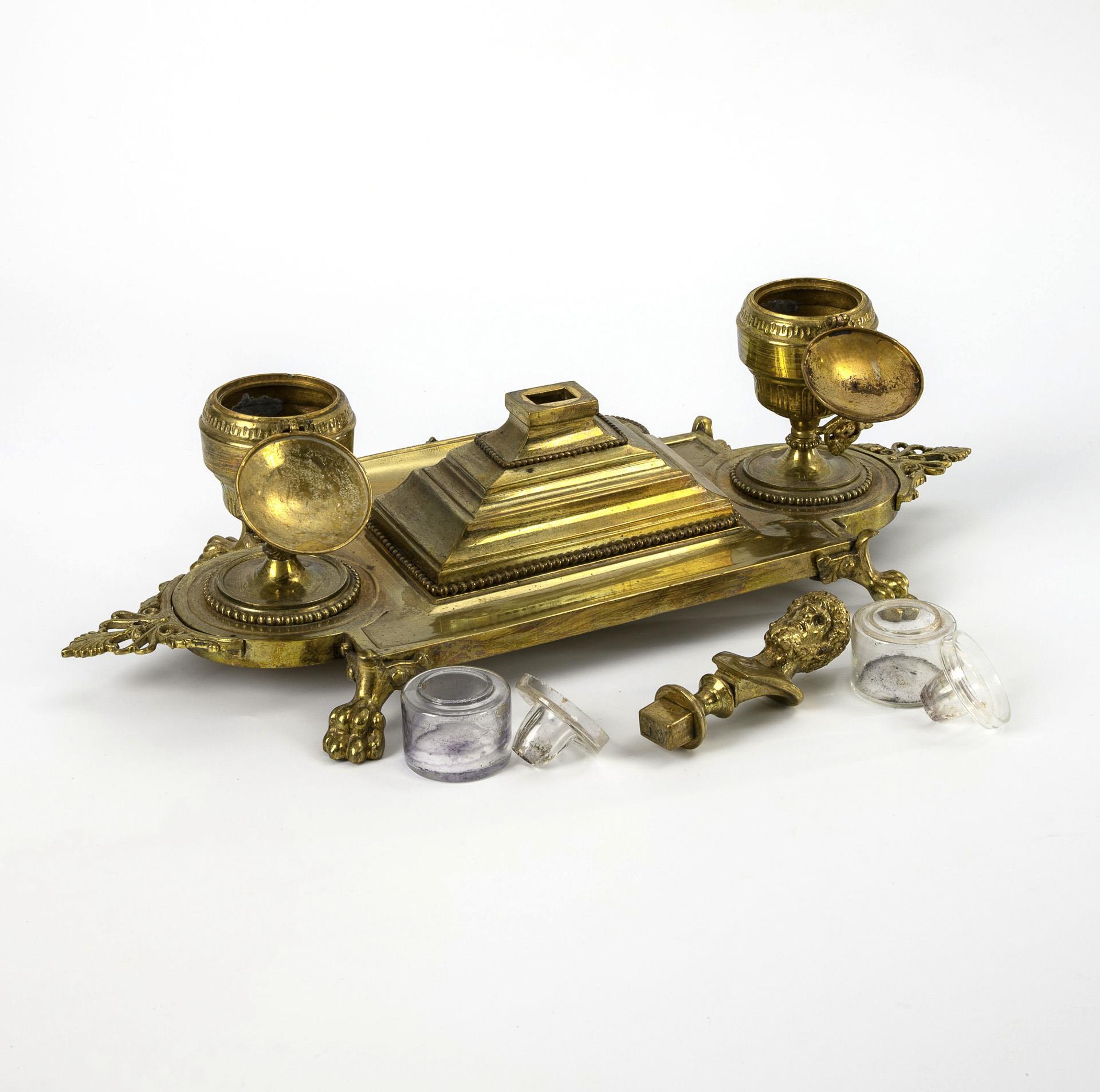 Auf Tatzenfüßen stehendes Schreibzeug mit Stiftablage und zentraler stufenförmiger Erhöhung mit aufgesteckter Petschaft in Form einer Büste des römischen Kaisers Lucius Verus (graviertes Monogramm "W.L."). Seitlich 2 Vasen mit Scharnierdeckel, darin 2 Tintenfässer aus Glas. Glas-Tintenfässer wohl ergänzt.