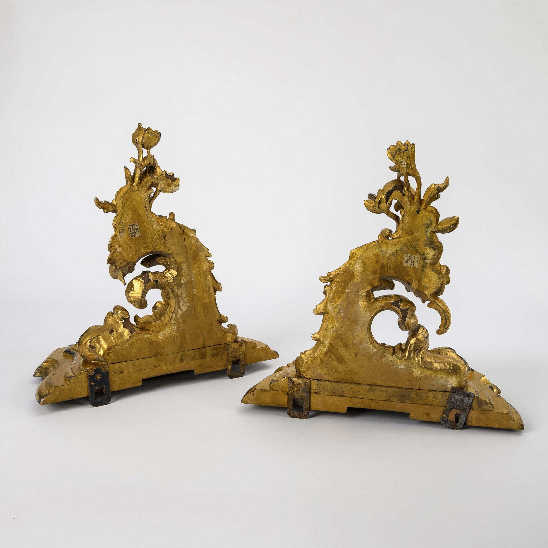 Voluminöse Rocaillen mit Blumenbesatz als Stützen für die geschweiften Konsolbretter mit oktogonaler Vertiefung. Vergoldung berieben, einige Stuckabplatzer, 1 minimale Fehlstelle.