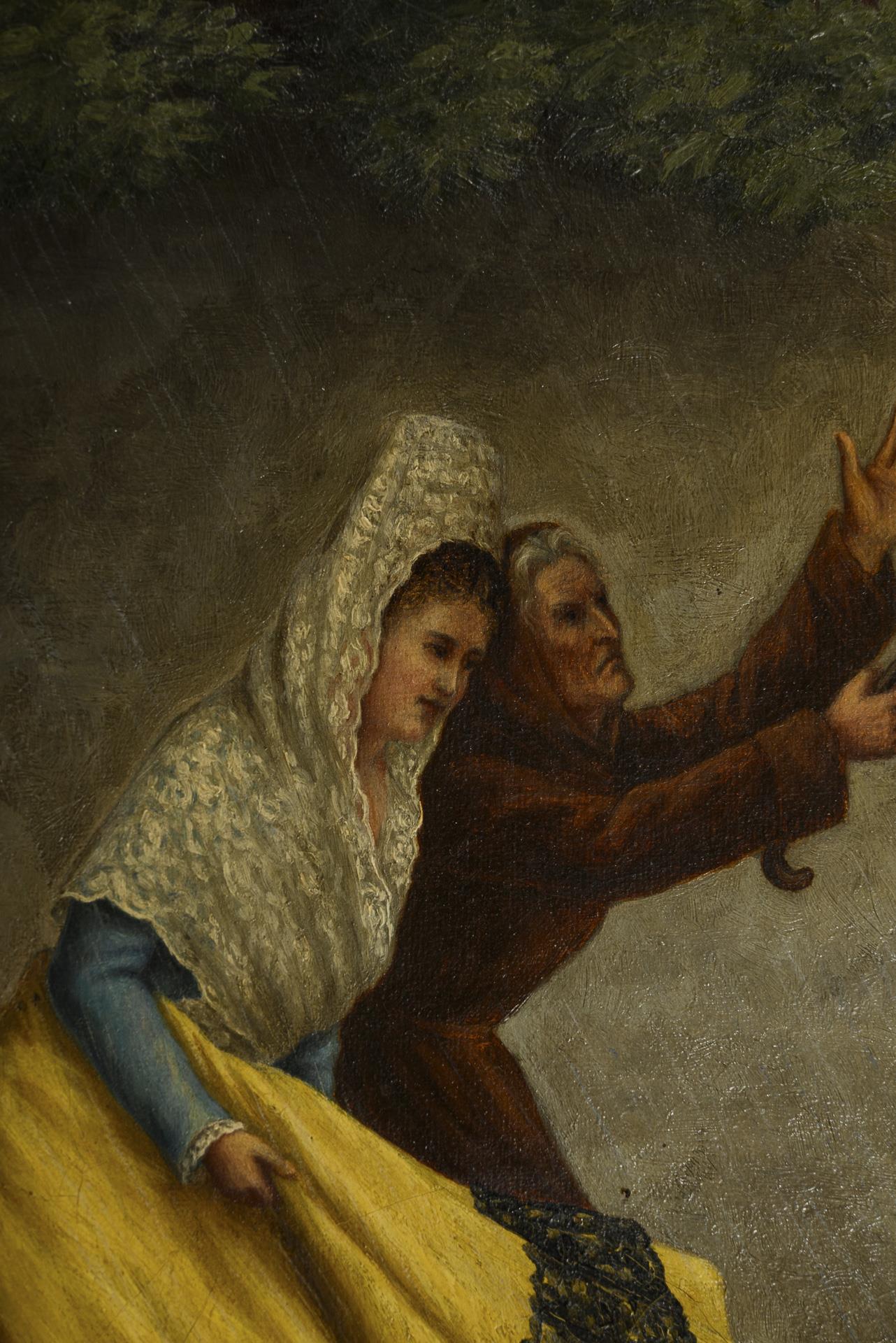 Genreszene mit junger Braut und alter Frau bei stürmischem Wetter mit dem vom Sturm bewegten Schirm auf der Straße. Minimale Altersspuren.
