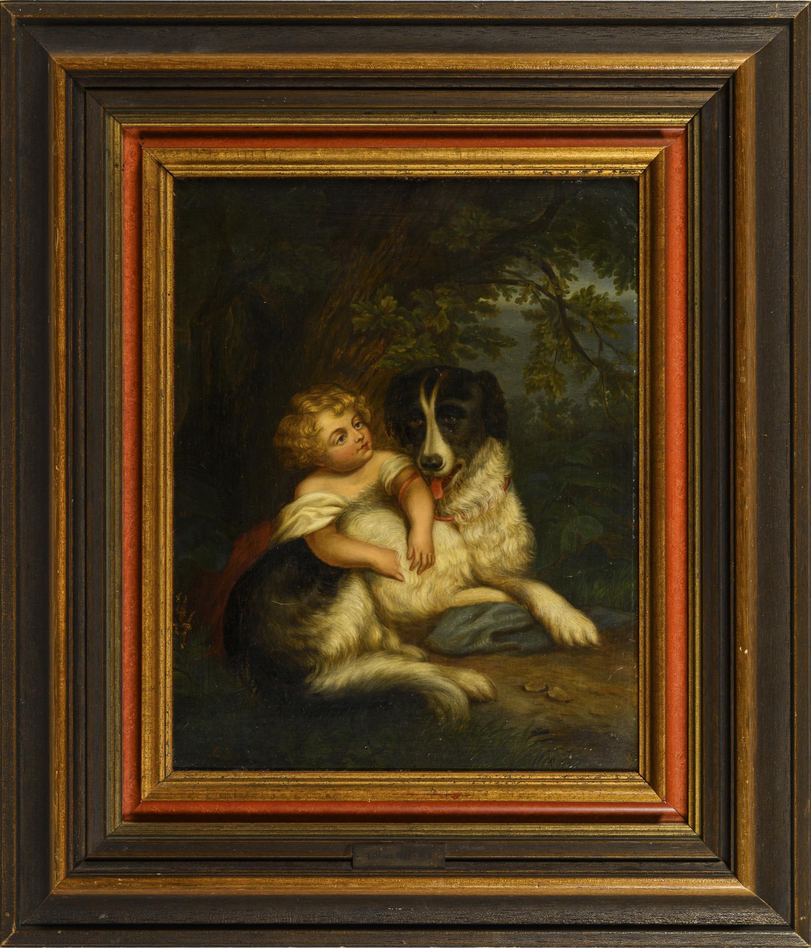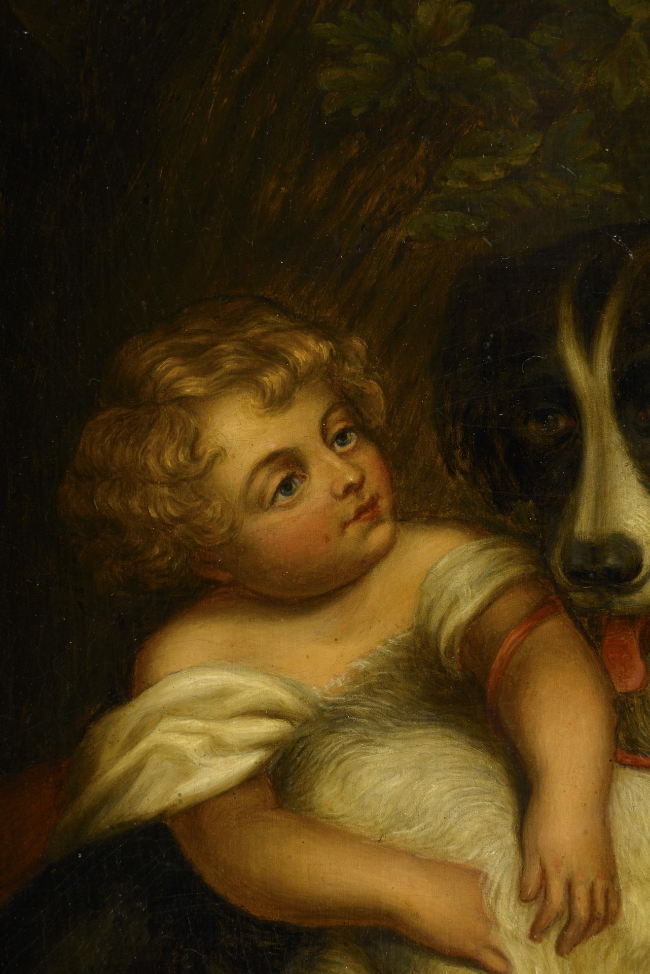 Kleines Mädchen mit dem Hund unter einem Baum im Sonnenschein.