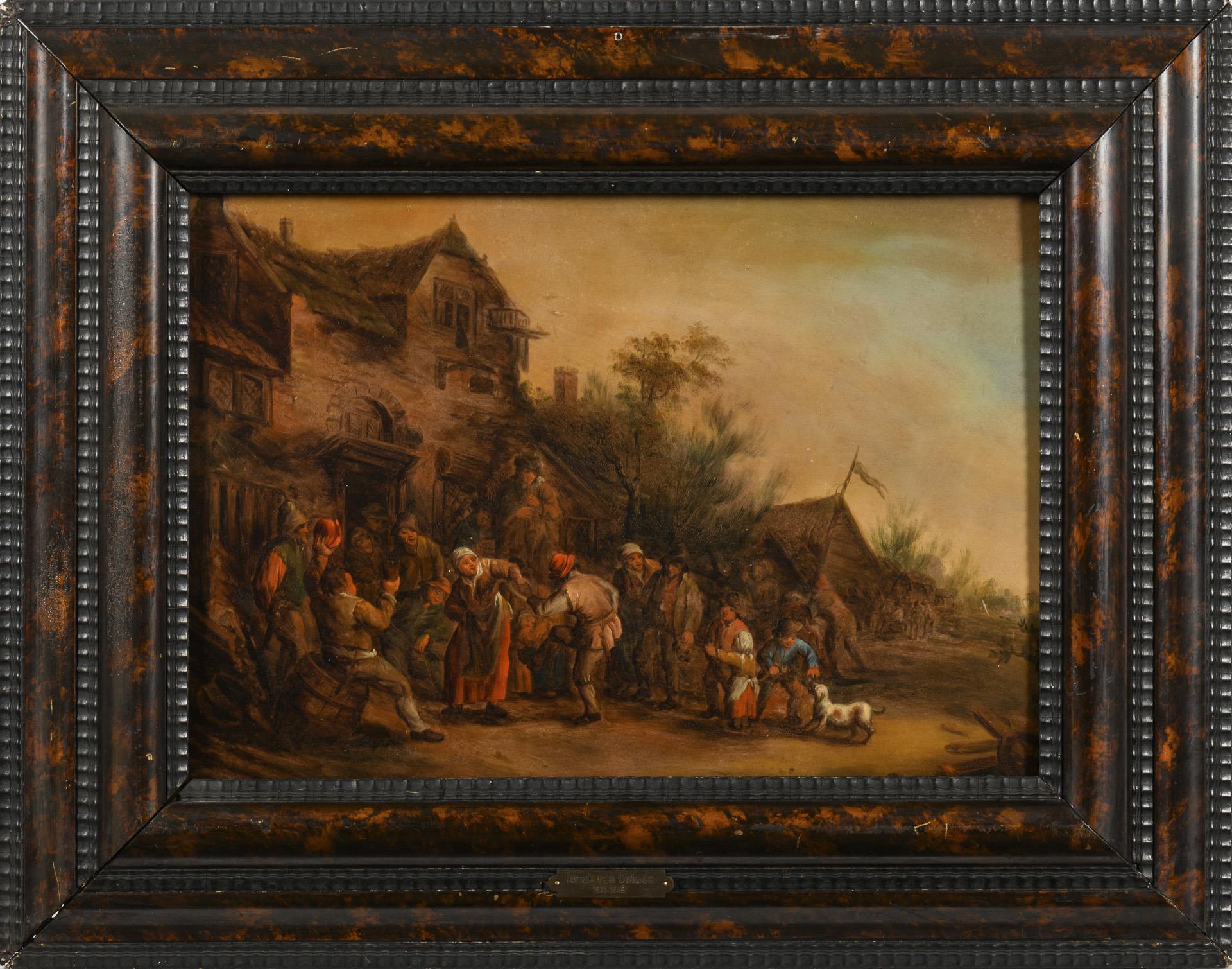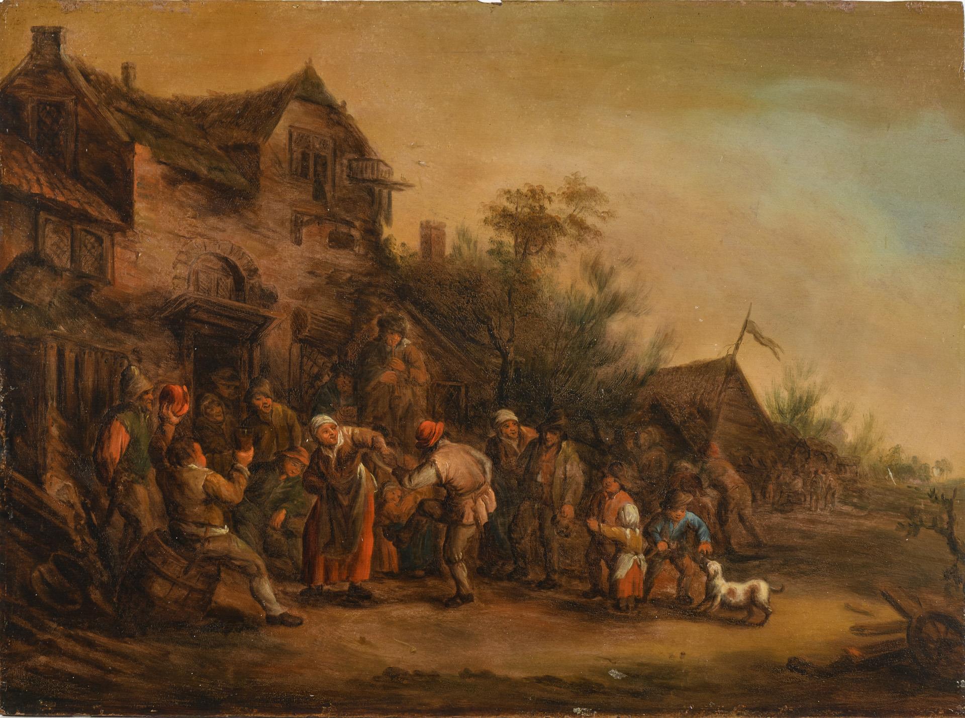 Typisches Werk des holländischen Malers mit einem durch Diagonalen geprägten Bildaufbau, der die Häuser steil in den Hintergrund fluchten lässt und somit dem ausgelassen Geschehen des feiernden Bauernvolks im Sonnenschein vor der Wirtsstube einen Rahmen und eine Bühne gibt. Altersspuren.