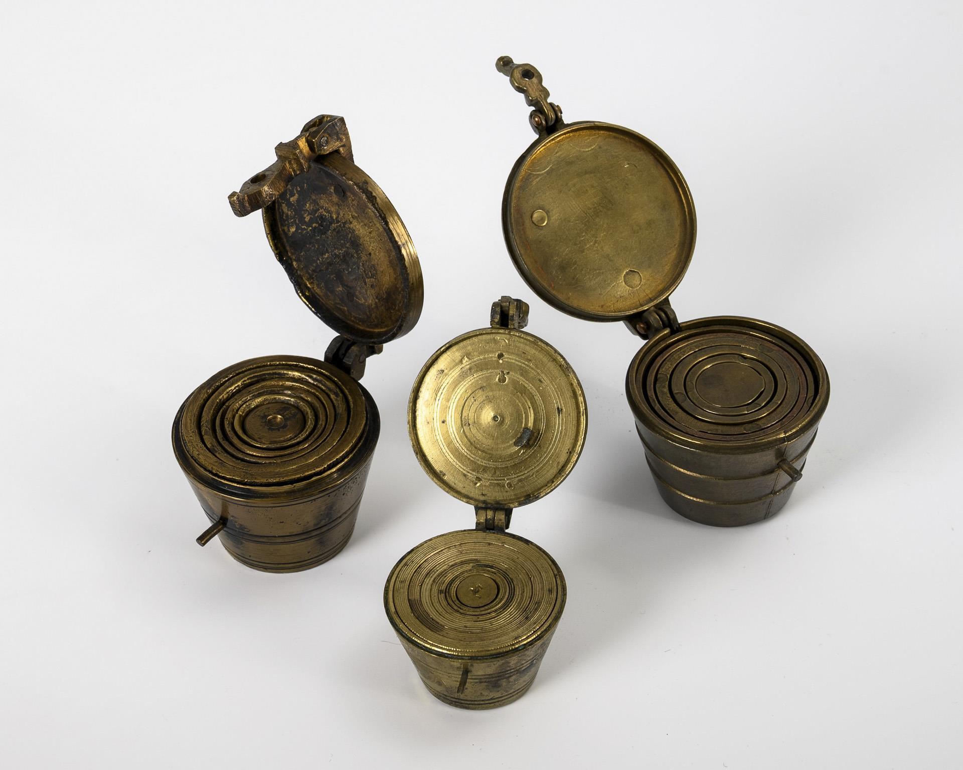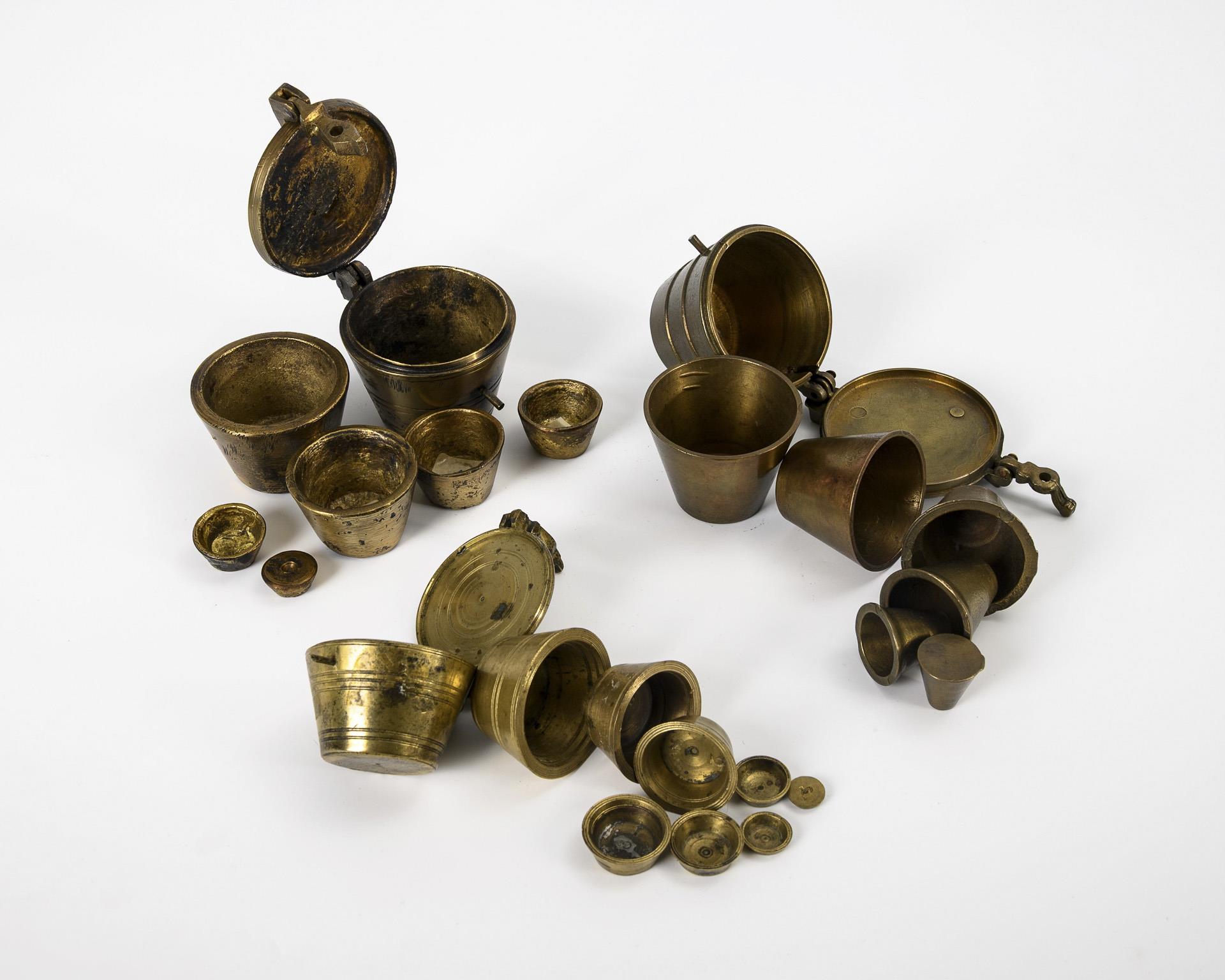 Kleines Nürnberger Pfundgewicht (467 g) mit Punze "C 1" (1 Pfund, wohl Köln) sowie Hahnenmarke (wohl Christoph Jobst Rothenberger, Meister ab 1787); innen vollständiger Gewichtssatz von 7 originalen "Bechergewichten" und 1 (wohl ergänztem) Knopf. / 2 jüngere Nachgüsse. Pfundgewicht leichte Alters-/Gebrauchsspuren, sonst starke Alters-/Gebrauchsspuren und Gussfehler.