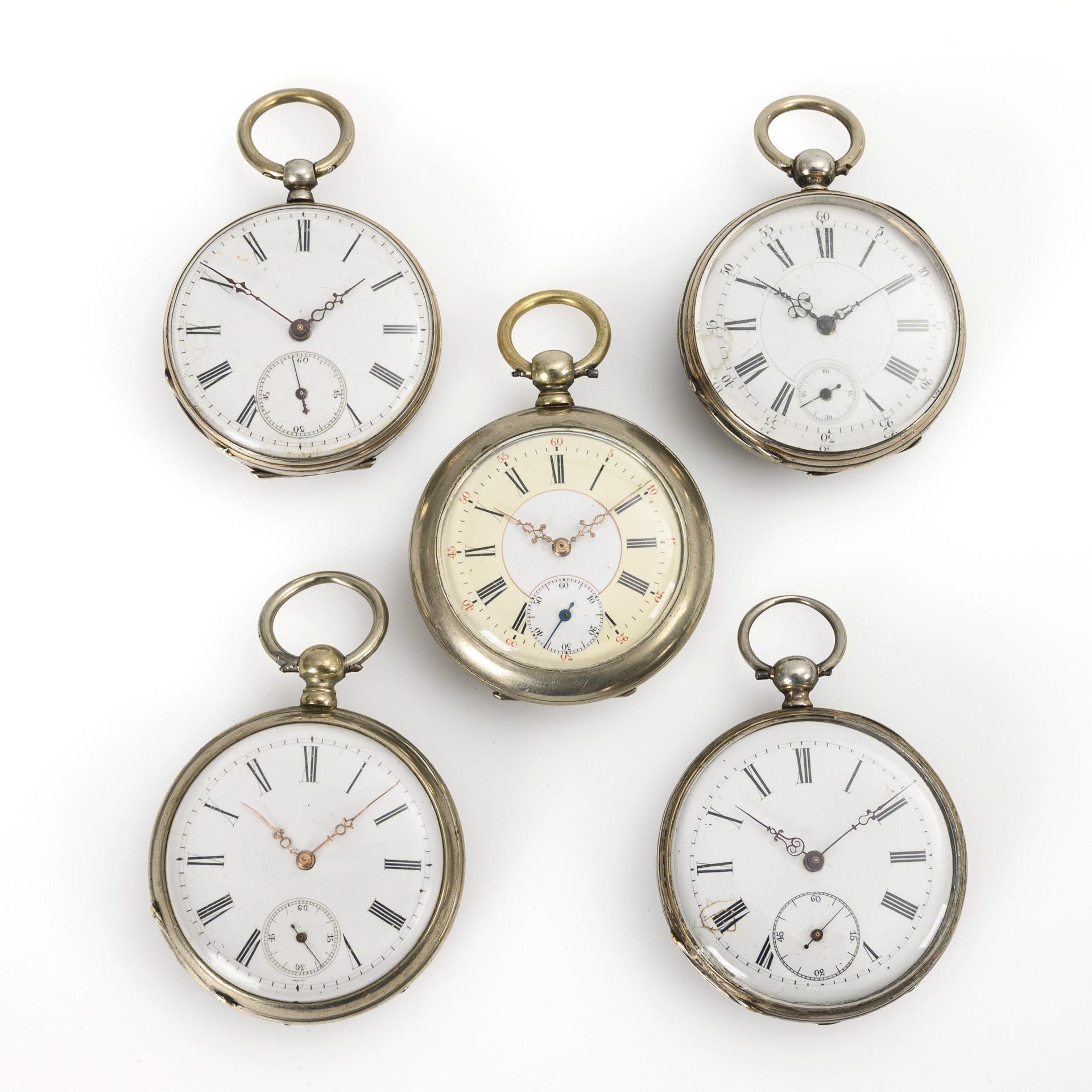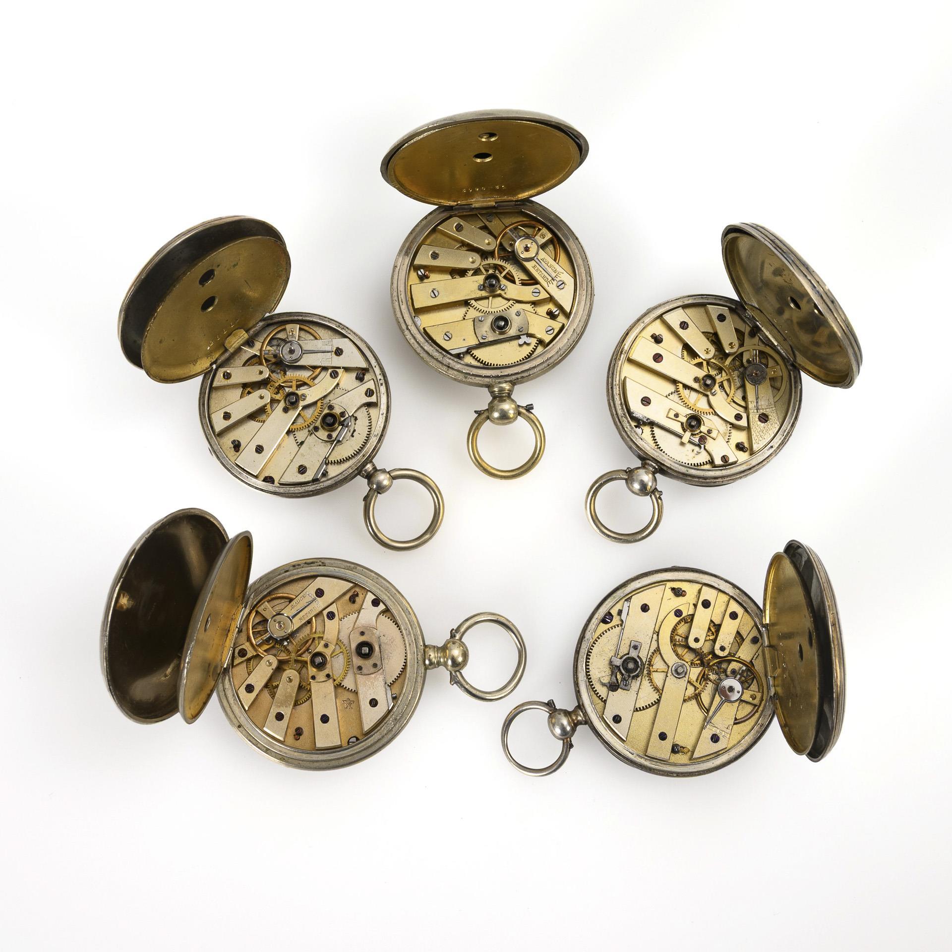 Brückenwerke mit Zylinderhemmung und Schlüsselaufzug. 4 Werke im Kurzzeittest funktionstüchtig, 1 Werk läuft nicht. Weiße Emailzifferblätter mit römischen Zahlen, Minutenkranz und kleiner Sekunde.