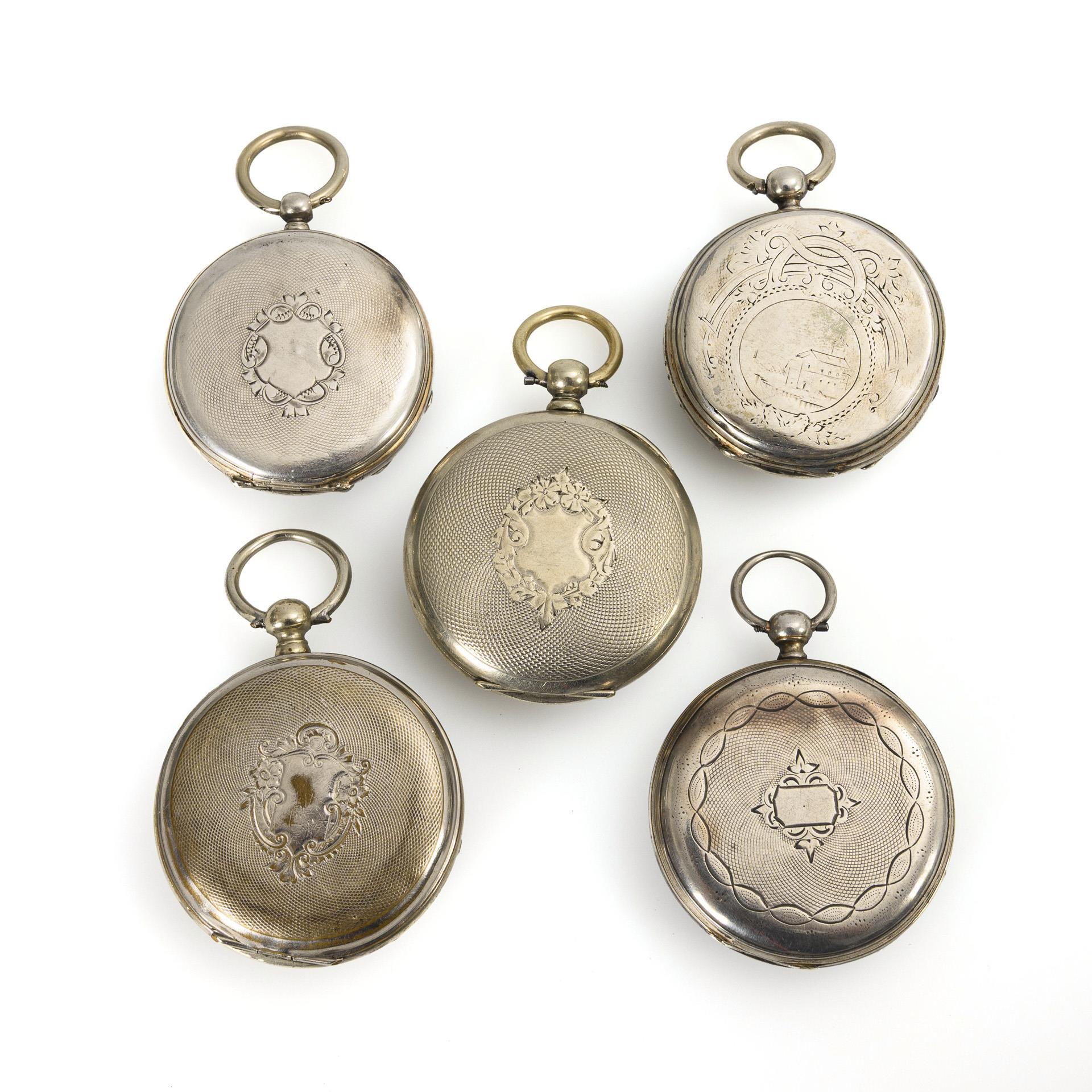 Lépine-Gehäuse, 4x mit guillochiertem Rückdeckel und leerer Wappenreserve, 1x graviert mit Architektur in Rundmedaillon. Alters- und Gebrauchsspuren, jeweils mit Defekten.