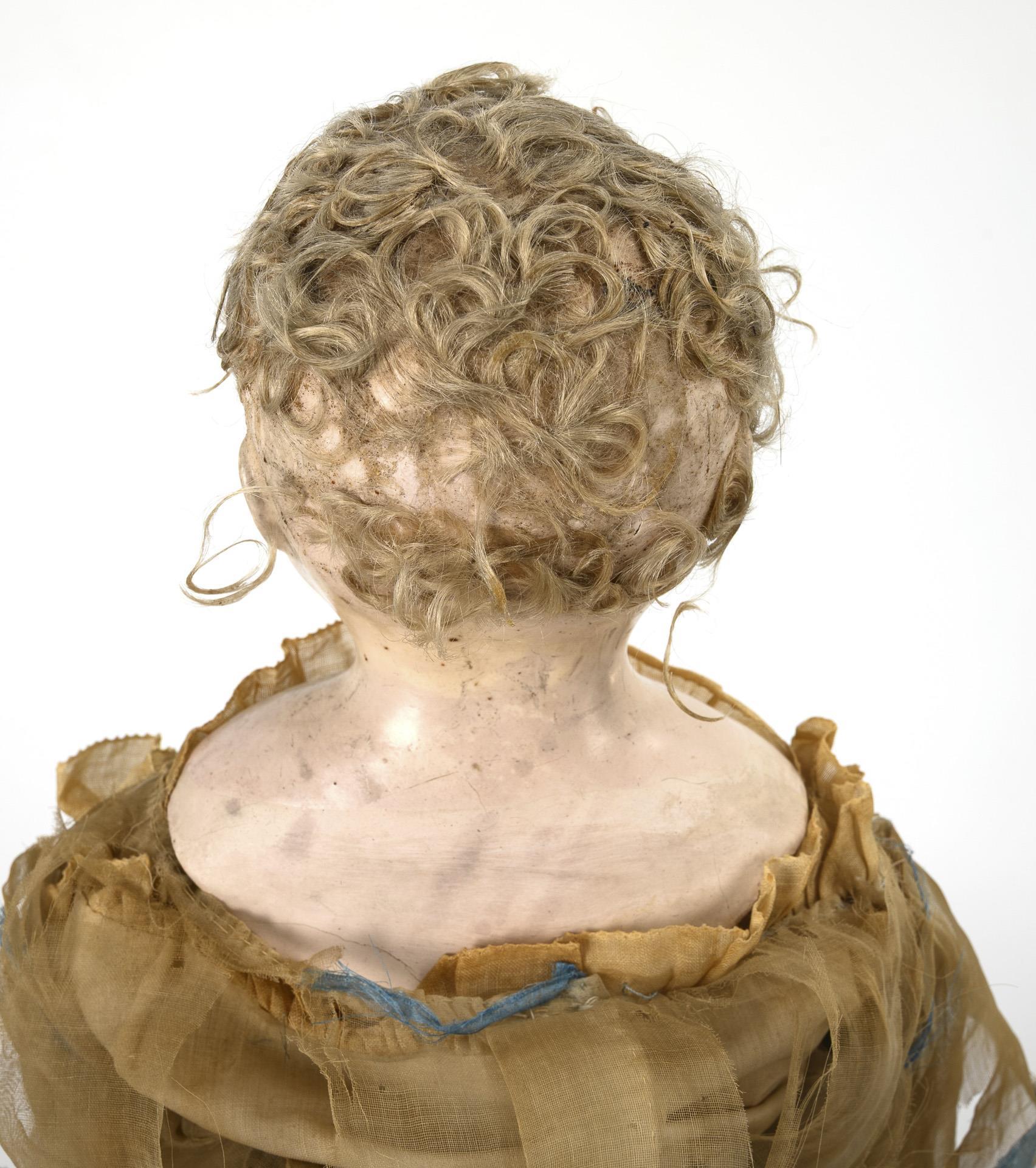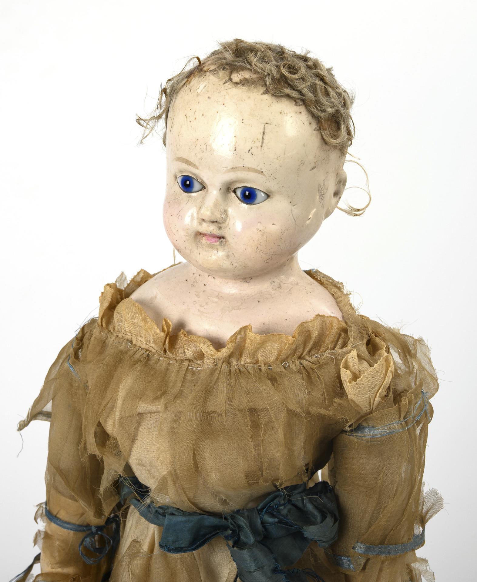 Wachsierter Brustkopf, feste blaue Augen, aufgeklebte blonde Locken. Holzwollegestopfter Stoffkörper mit Massearmen, wachsierte Beine mit anmodellierten Stiefelchen. Vermutlich originales, zerschlissenes Tüll-Oberkleid, passende Haube, ergänztes, weißes Unterkleid. Altersspuren. Nase und Kinn retuschiert, rechtes Bein mit Pflaster geklebt.