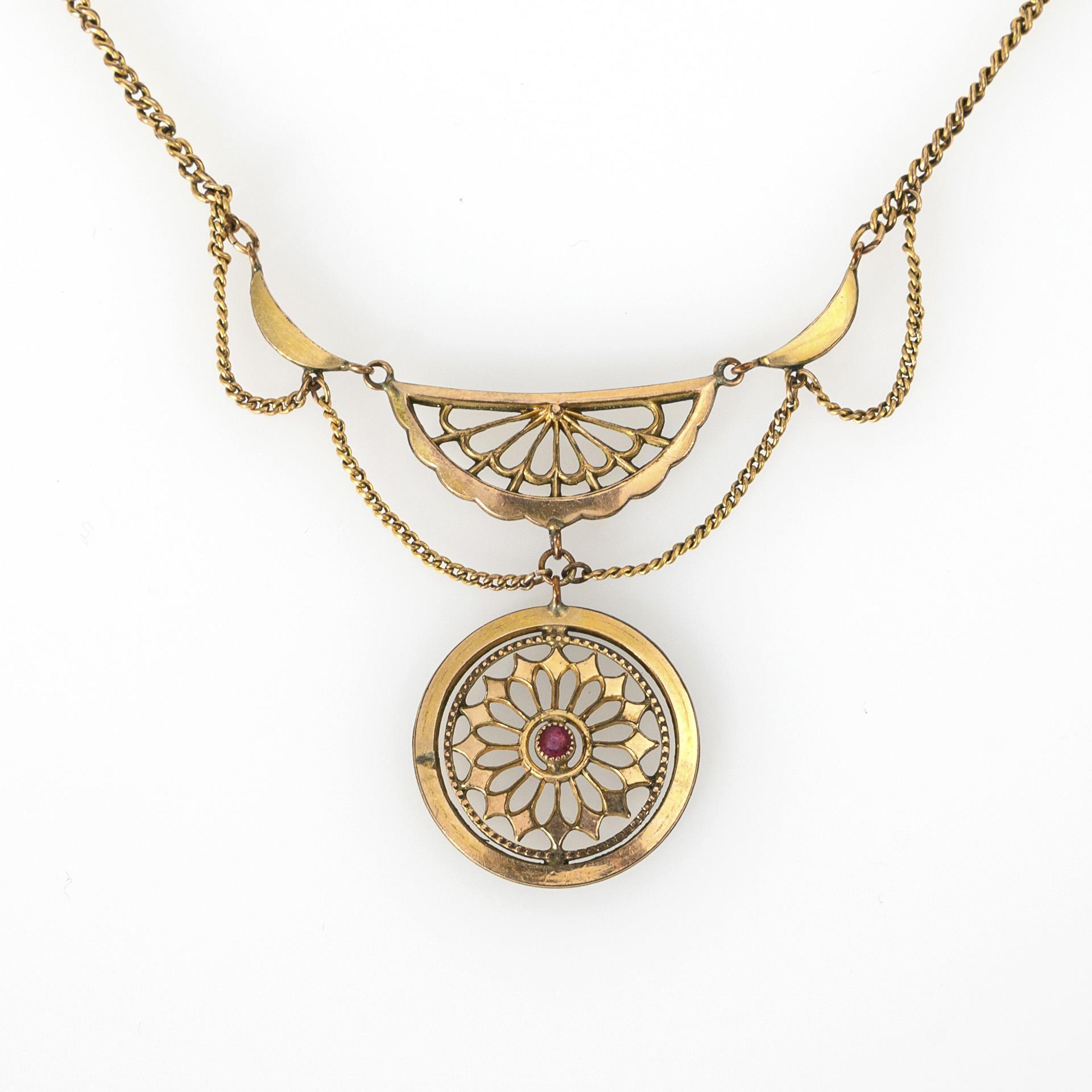 Zeittypisches Collier mit Kettenabhängungen und rundem Anhängerelement, besetzt mit einem kleinen, roten Schmuckstein, wohl Glas, an originaler Kette. Leichte altersgemäße Tragespuren: Vergoldung mit punktuellen Bereibungen.