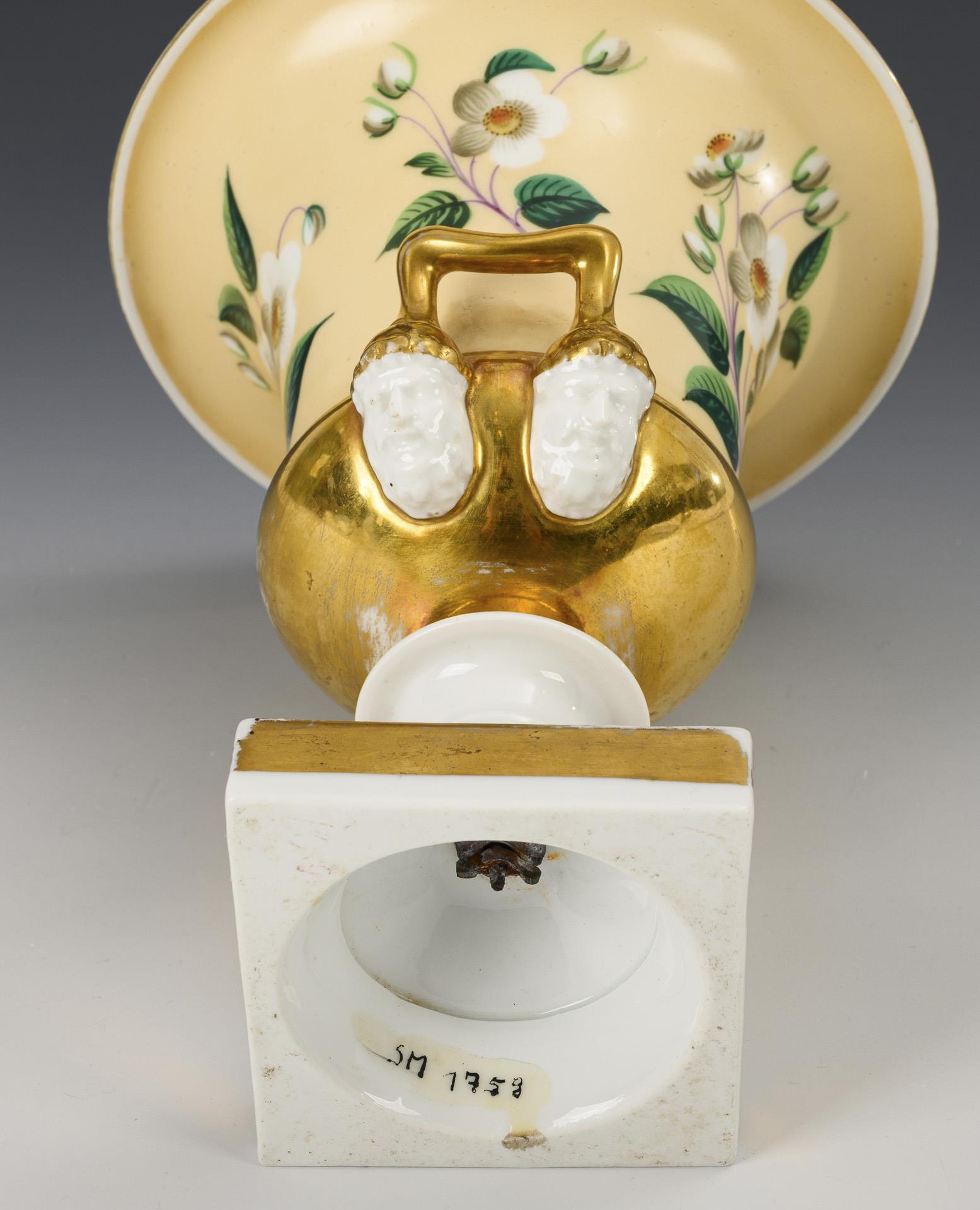 Polychrome Blumenmalerei auf champagnerfarbenem Fond, reiche Goldstaffage. H 24,5 cm. 1,6 kg.