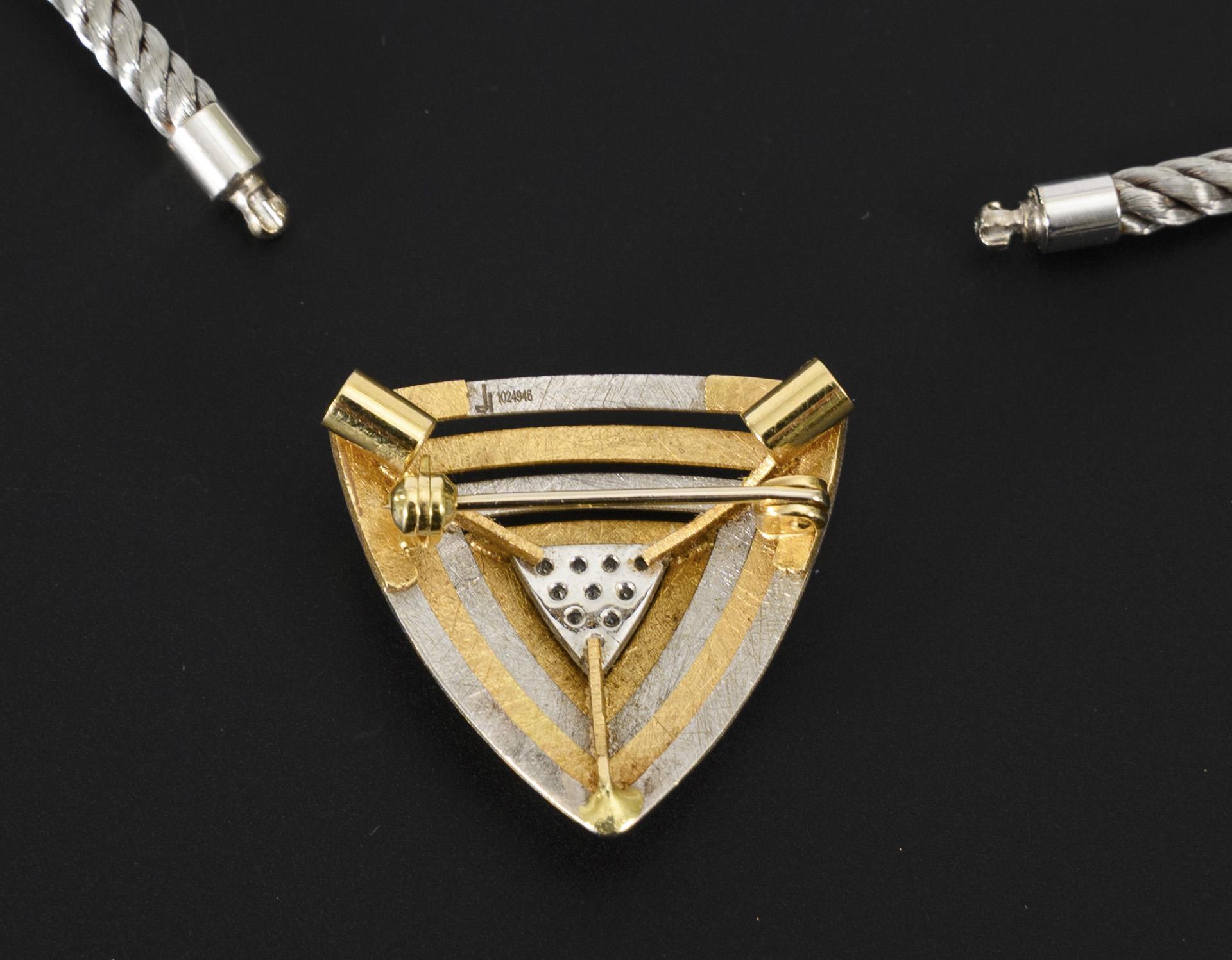Kurzes Collier aus einer gedrehten Edelstahl-Kordel mit variablem Bicolor-Verschlusselement in Gold mit kleinem Diamantbesatz der Marke Jörg Heinz. Das mit einem Drehmechanismus herausnehmbare Verschlusselement ist rückseitig broschiert und kann so auch unabhängig als Brosche getragen werden.