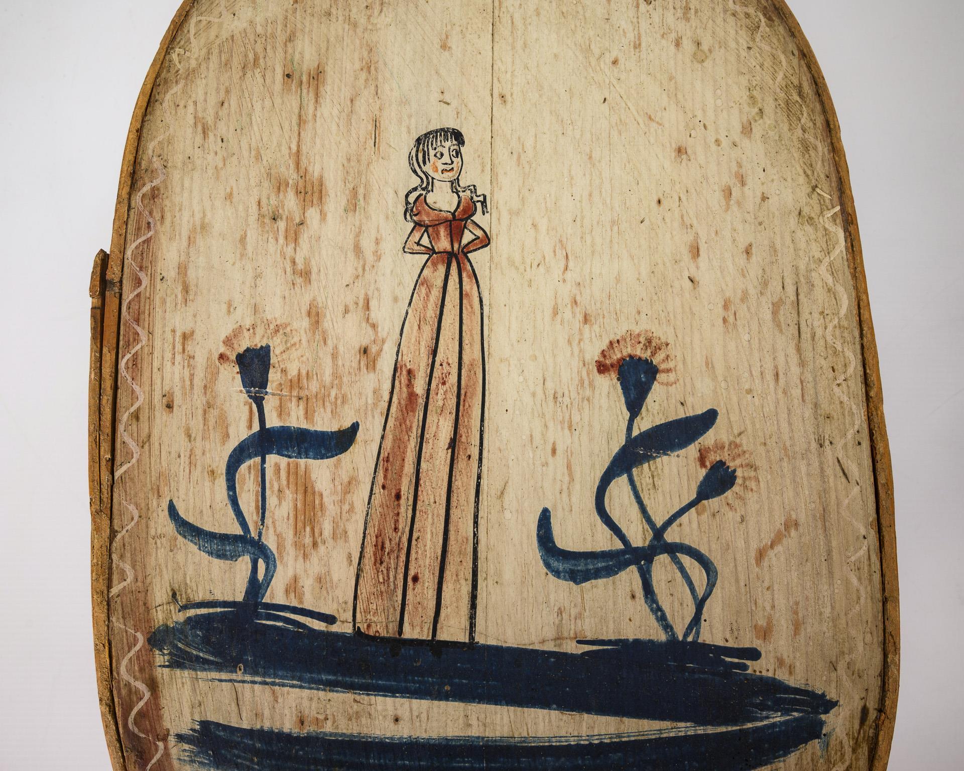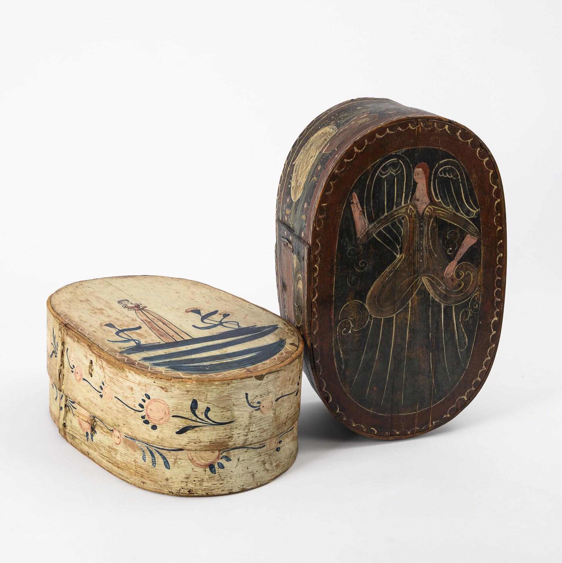 Weißgrundige Spanschachtel: Auf dem Deckel gemalte Jungfrau zwischen Blumen; auf der Wandung umlaufende kleine Blumen. / In rotbrauner Rahmung dunkelgrün grundierte Schachtel: Engel auf dem Deckel sowie auf der Wandung große umlaufende Blumen. Je teils fehlende Nahtspäne, je Fehlstellen an den Wandungen, 1 Boden mit alt geklebtem Trockenriss, je Alters-/Gebrauchsspuren.