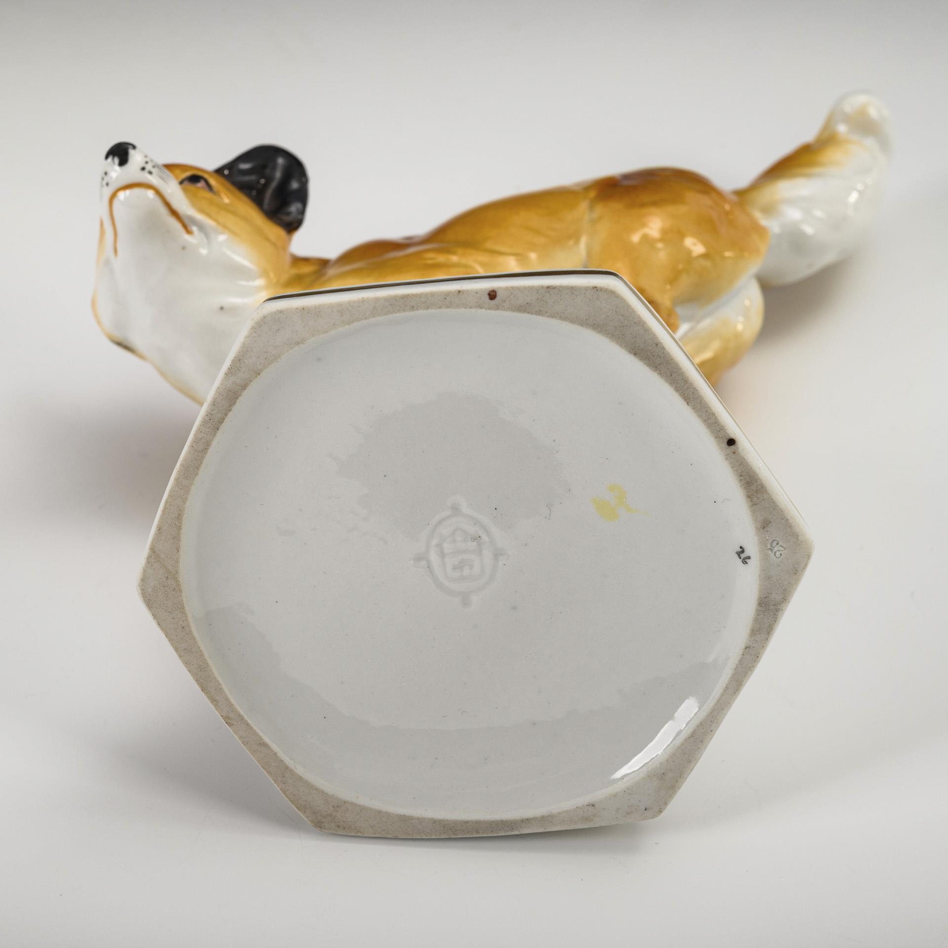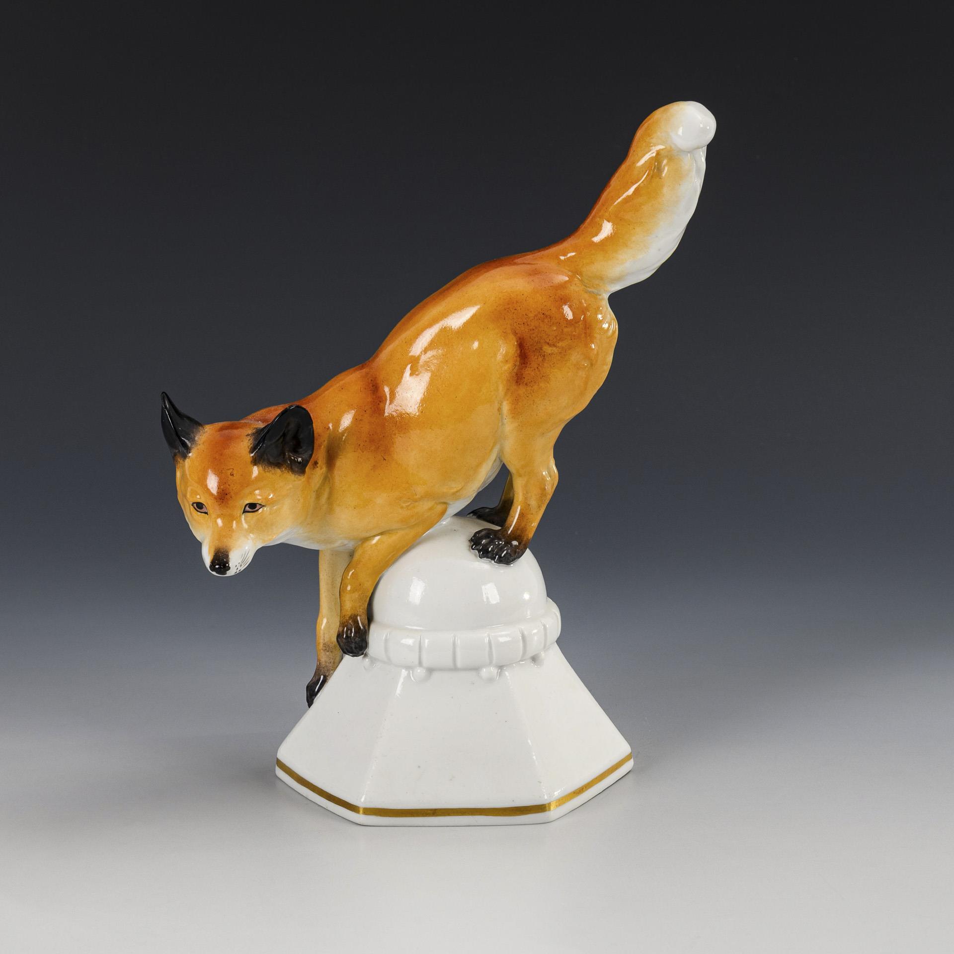 Auf einem sechseckig-konischem Sockel stehender Rotfuchs.