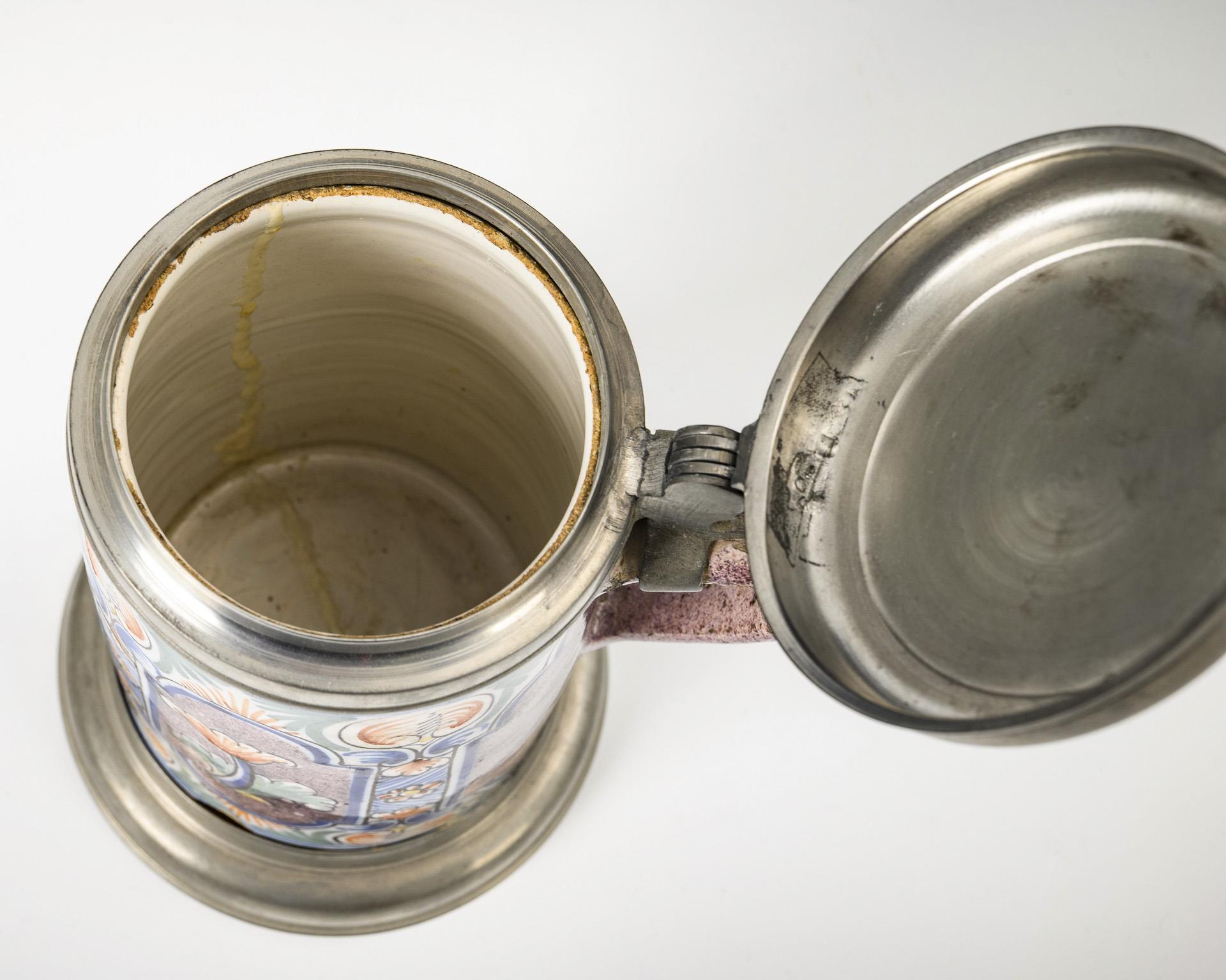 Zylindrischer Korpus mit Bandhenkel, schauseitig 3 blumengefüllte, manganjaspierte Barockreserven, umlaufend Floraldekor. Zinndeckel mit Kugeldrücker, hoher Zinnstand. Wandungsriss (innen geklebt), bodenrissig, partiell bestoßen.