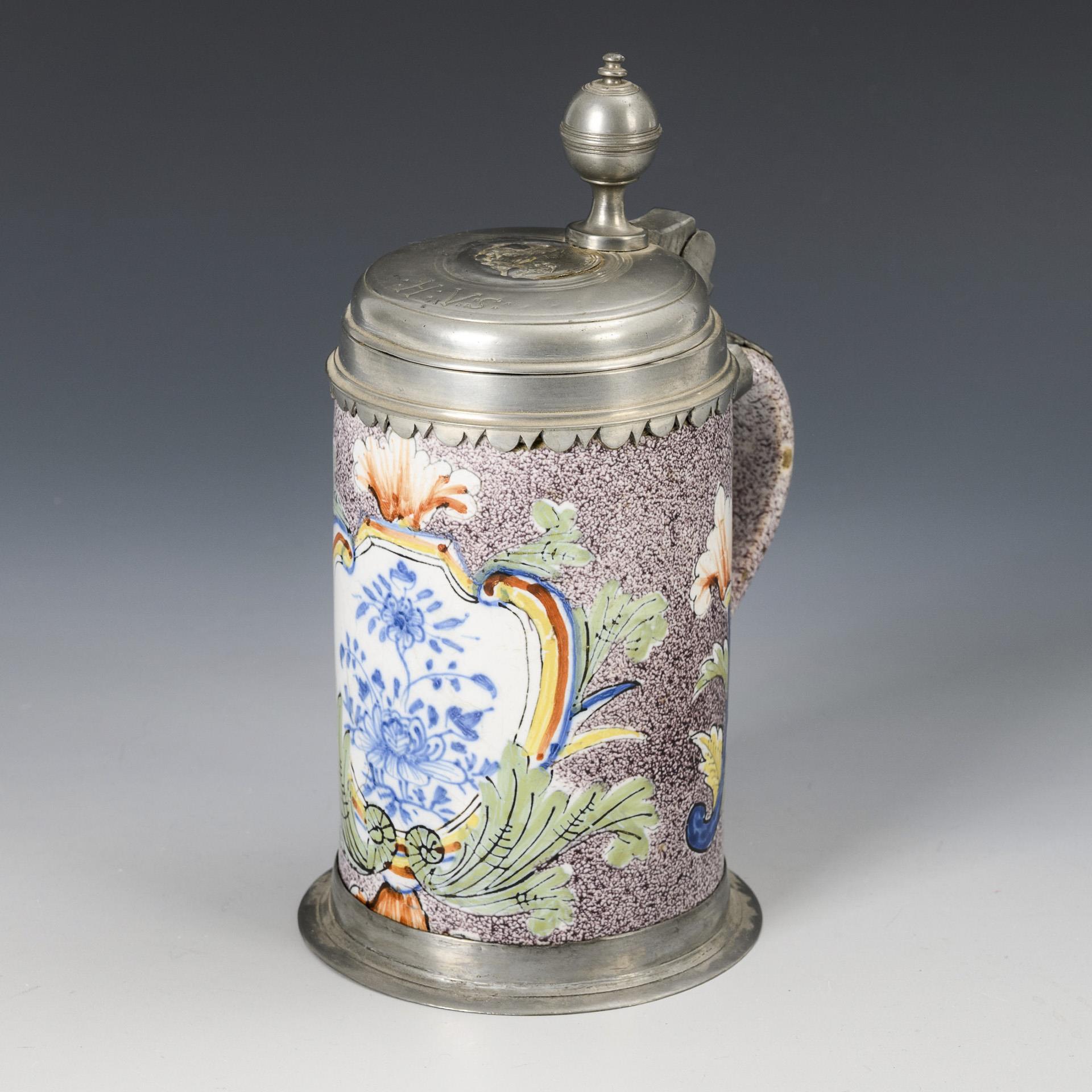 Zylindrischer Korpus mit Bandhenkel, manganjaspierte Wandung mit schauseitiger Kartusche und Blumenmalerei in Blau. Profilierter Zinndeckel mit Reliefplakette und Kugeldrücker, graviert "HVS", Zinnstandring. Wandungsrissig, partiell leicht glasurbestoßen.