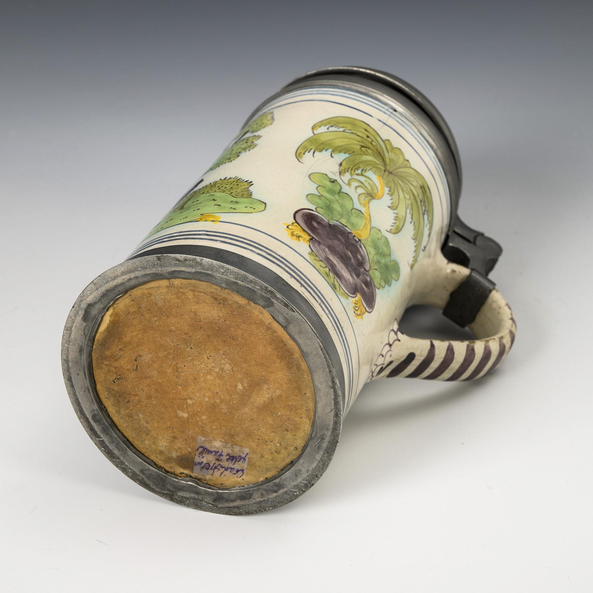 Zylindrischer Korpus mit strichverziertem Bandhenkel, schauseitig ein Chalumeau spielender Herr inmitten einer Landschaft, darüber bezeichnet. Profilierter Zinndeckel mit Kugeldrücker, graviert "Heiden", innen gepunzt, Zinnstandring. Wandungsrissig, partiell bestoßen, teils repariert.