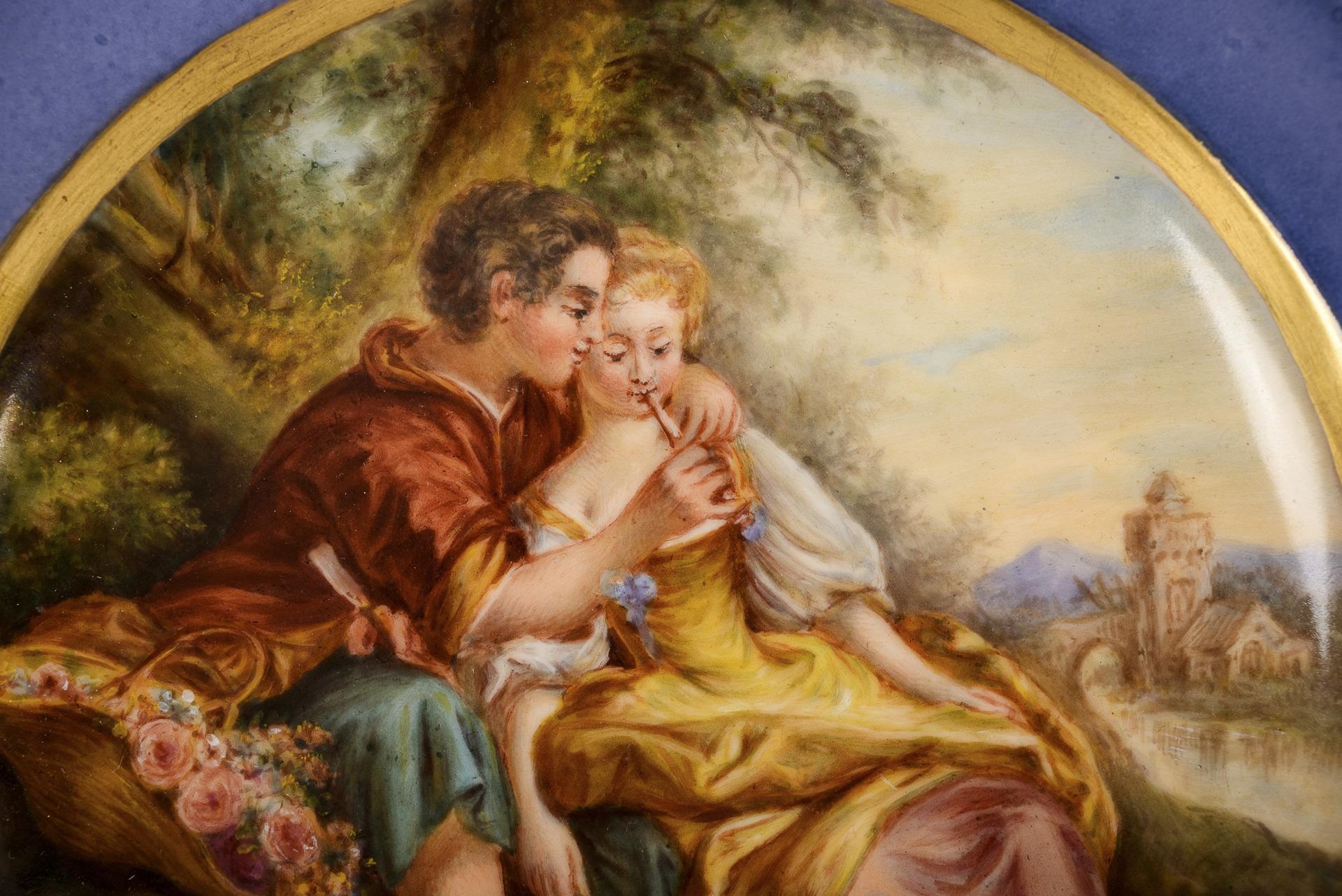 Form "Neuer Ausschnitt". Im Spiegel die Darstellung eines unter einem Baum sitzenden jungen Schäferpaares.