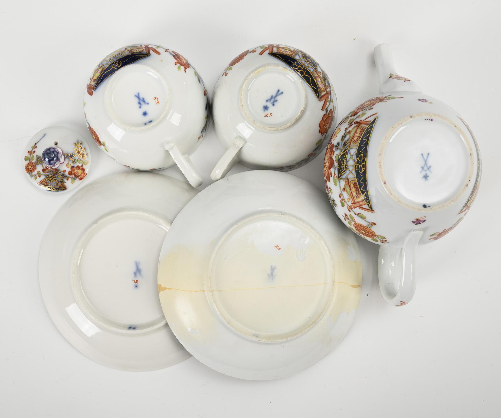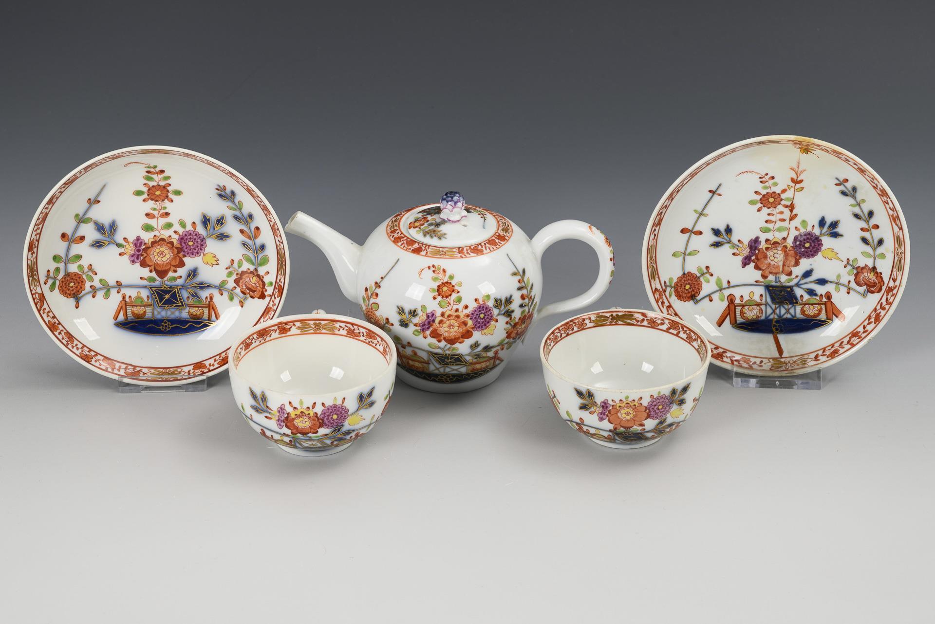 Unterglasurblau und polychrom bemalt, goldstaffiert. Teekännchen (H 9 cm), 2 Tassen (H 4,5 cm) und 2 Untertassen (Ø 12,5 cm). 640 g.