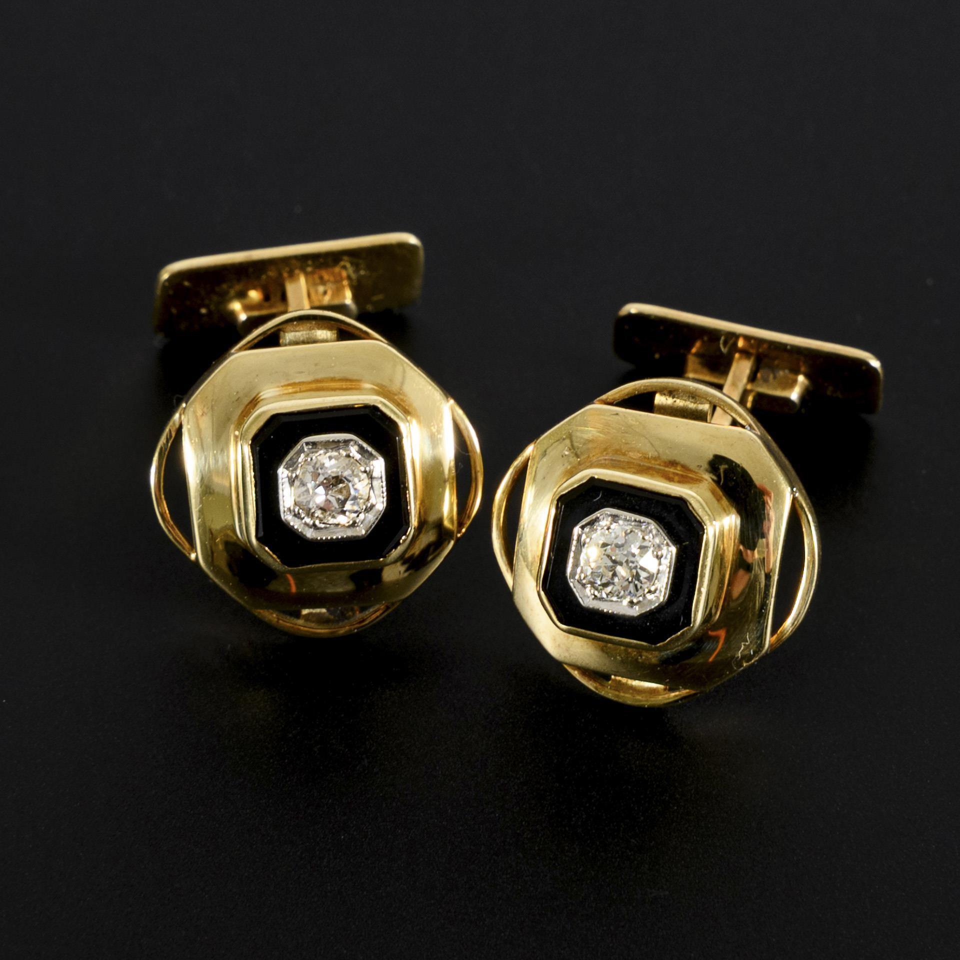 Klassische Manschettenknöpfe des Art déco mit schwarzer Onyxeinlage und je einem Altschliff-Brillanten.
