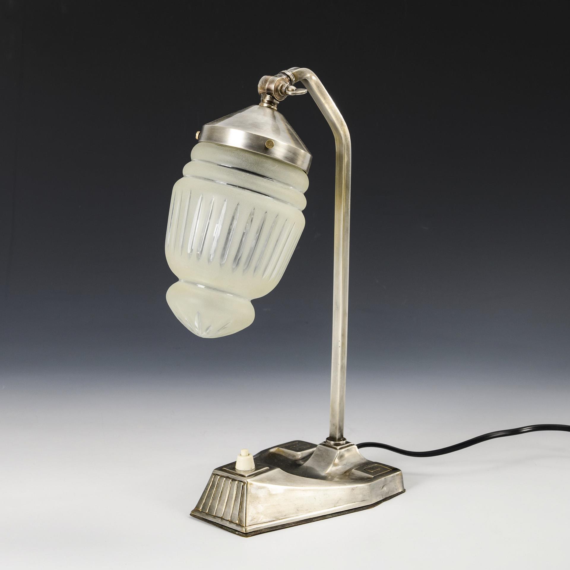 Beschwerter Fuß mit stilisierter Zier und Druckschalter, Vierkant-Bogenschaft, drehbare Fassung mit geschlossenem Glasschirm. Restauriert, kaum Alters-/Gebrauchsspuren, jünger elektrifiziert, funktioniert.