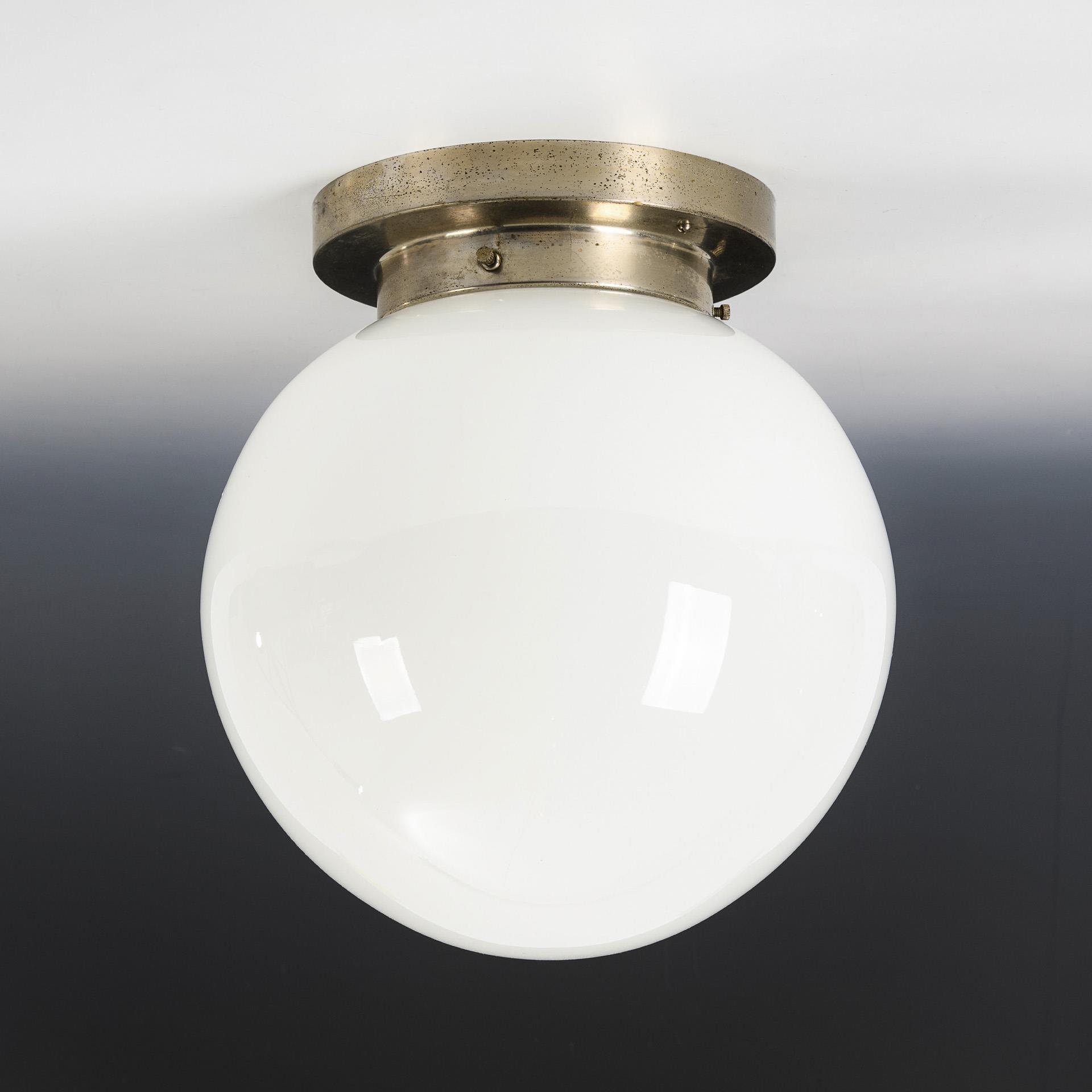 Plafoniere mit gestufter Halterung, Kugelglasschirm. Metall etwas eloxiert, funktioniert.