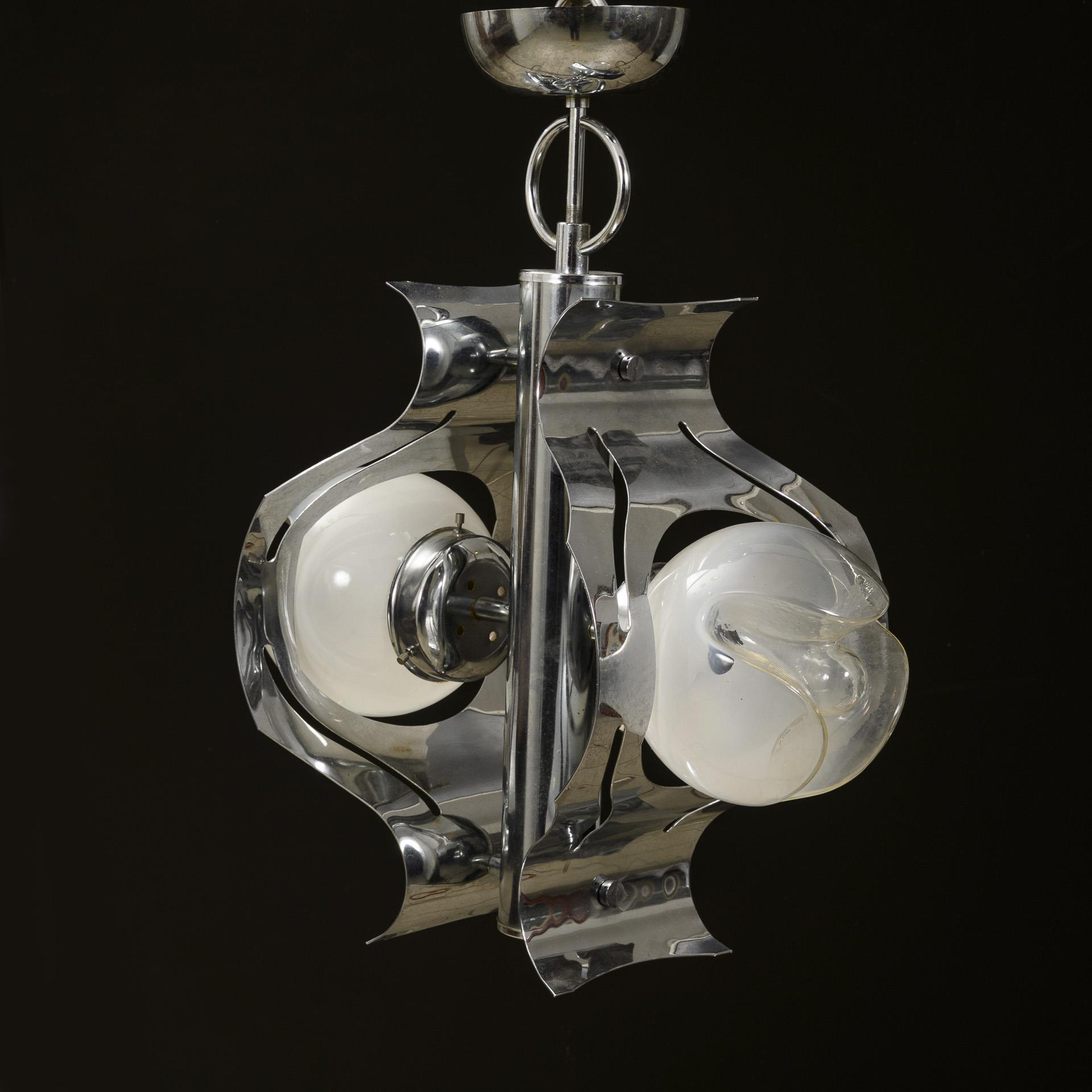 Eisenblech verchromt, farbloses Glas und Milchglas im Verlauf, Elektrifizierung mit Schraubfassungen. H 56 cm, B 45 cm. 3,9 kg.