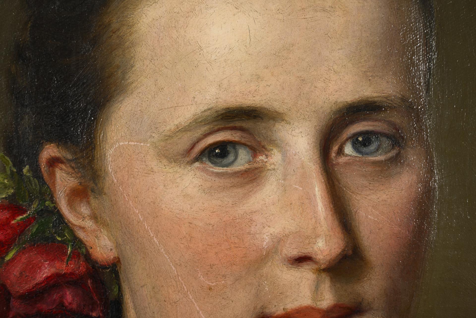 Porträt einer jungen Frau im schwarzen Kleid mit Goldschmuck und Rose im Haar. Dazu einige Rahmenteile. Kratzer.