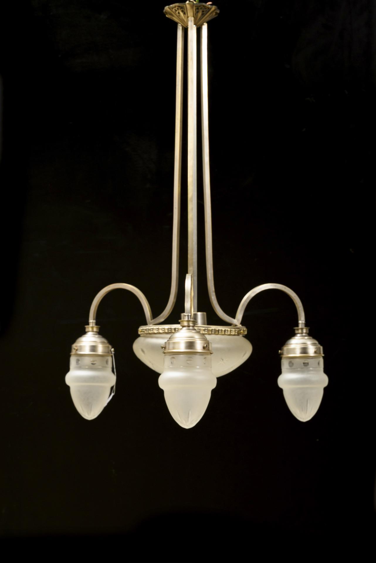 Baldachin mit abstraktem Reliefornament, Vierkant-Zentralschaft zur zentrale Lampenschale. 3 Vierkant-Schäften für die Bogenarme mit tropfenförmigen Gläsern; die Gläser je mit Ornamentschliff. Funktion nicht geprüft.