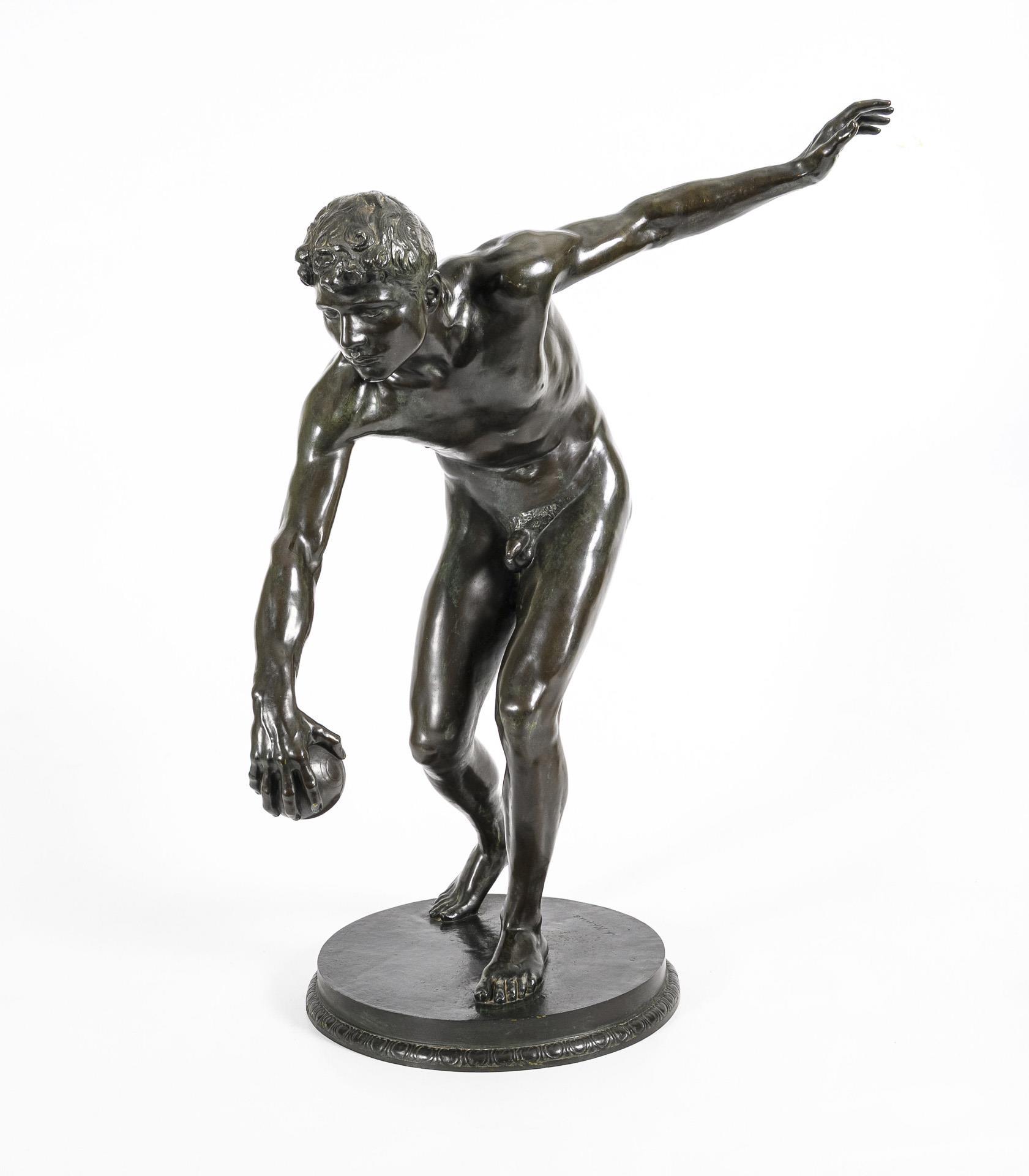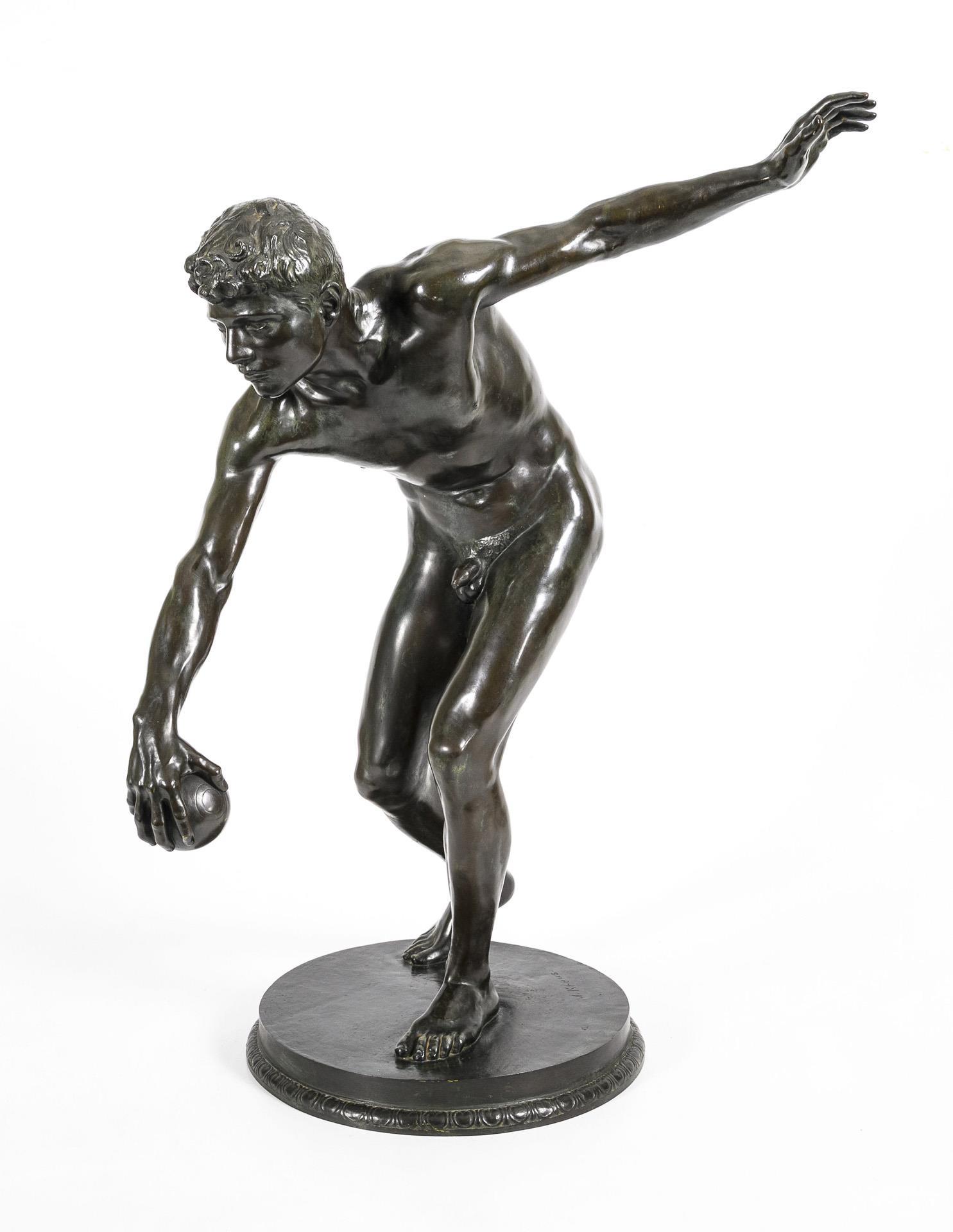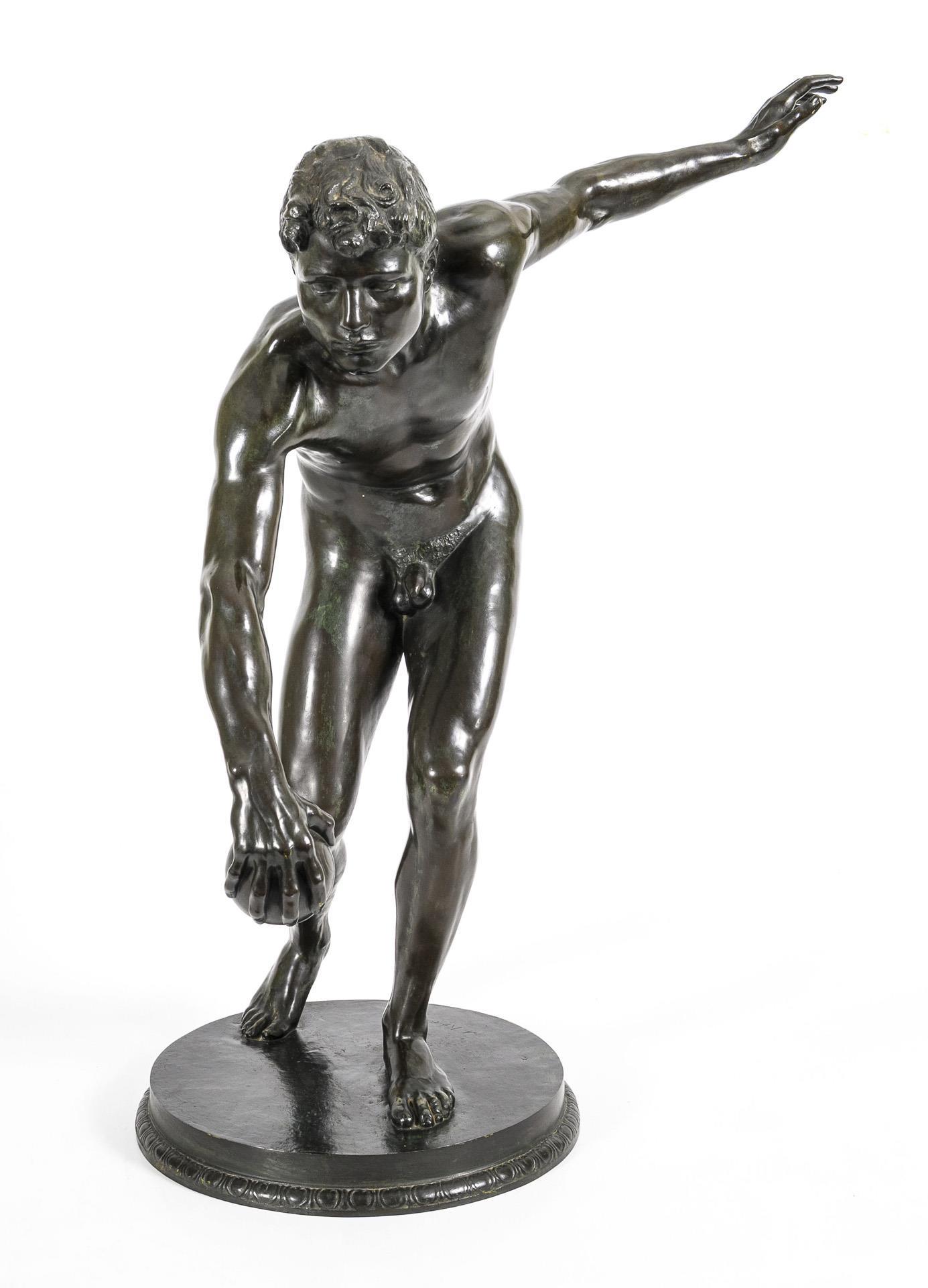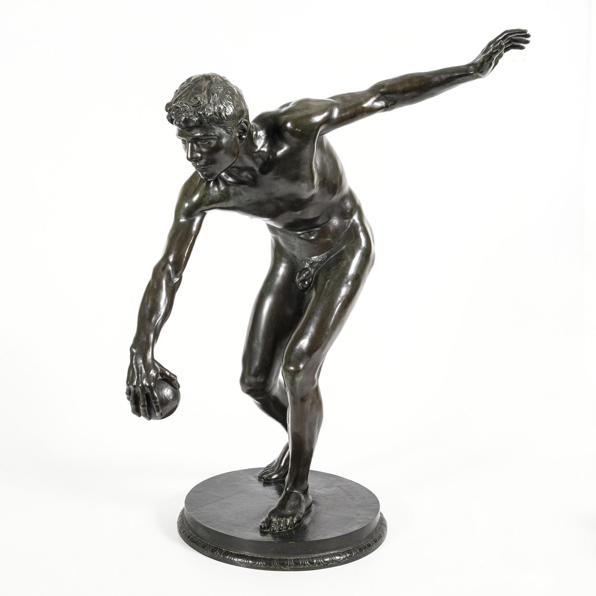 Akt eines athletischen jungen Mannes, der mit ausgreifender Geste bei voller Konzentration im Begriff ist, den Ball abzuwerfen. Thematisch erinnert dieser Moment an den berühmten Diskobolos des Myron aus der Antike. Patina berieben, teils grünlich korrodiert.