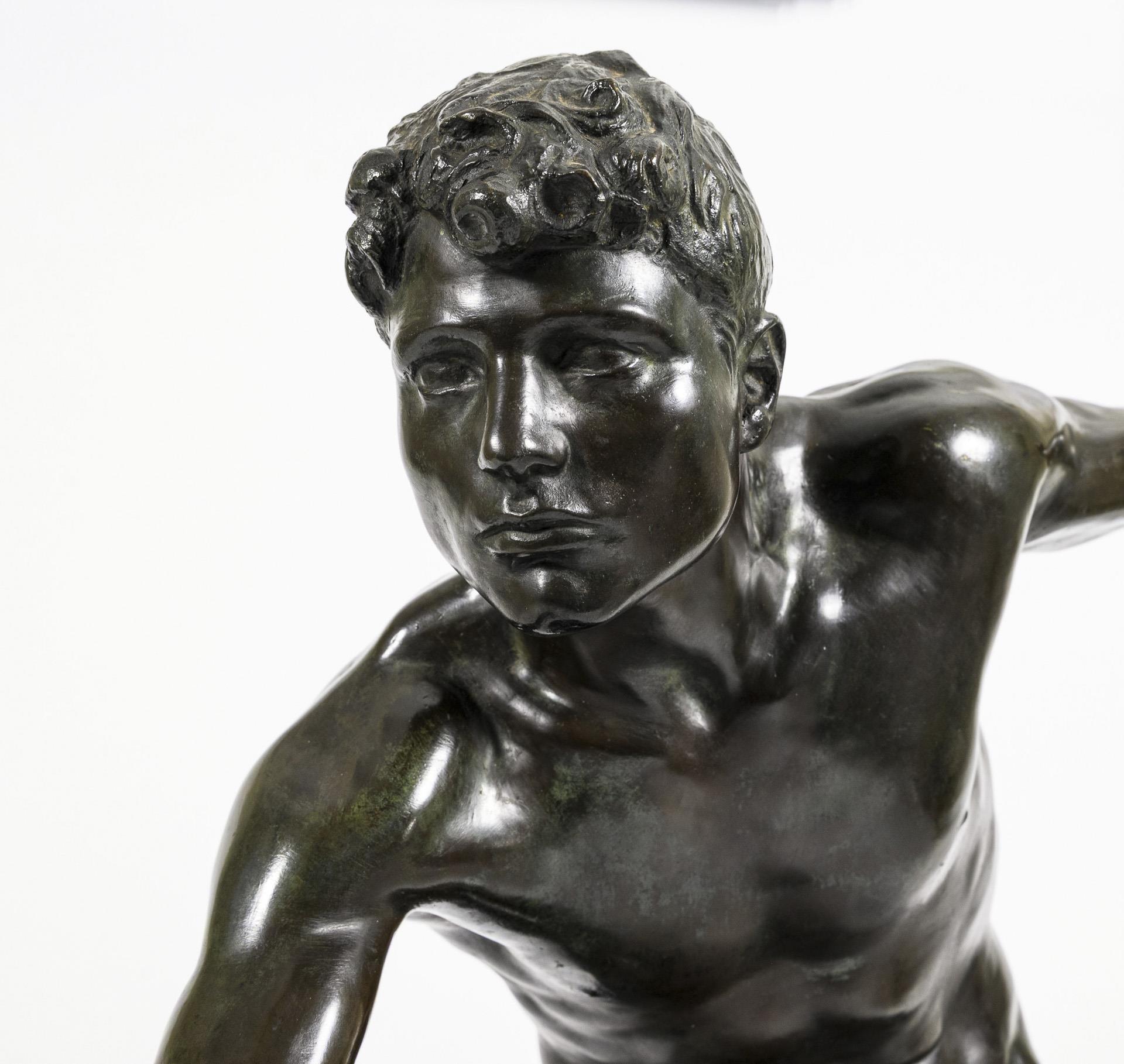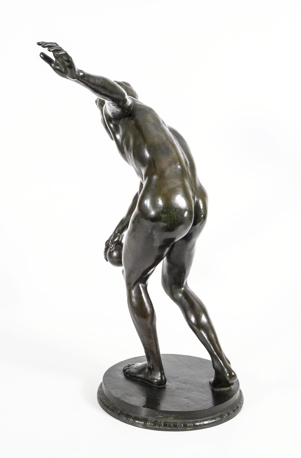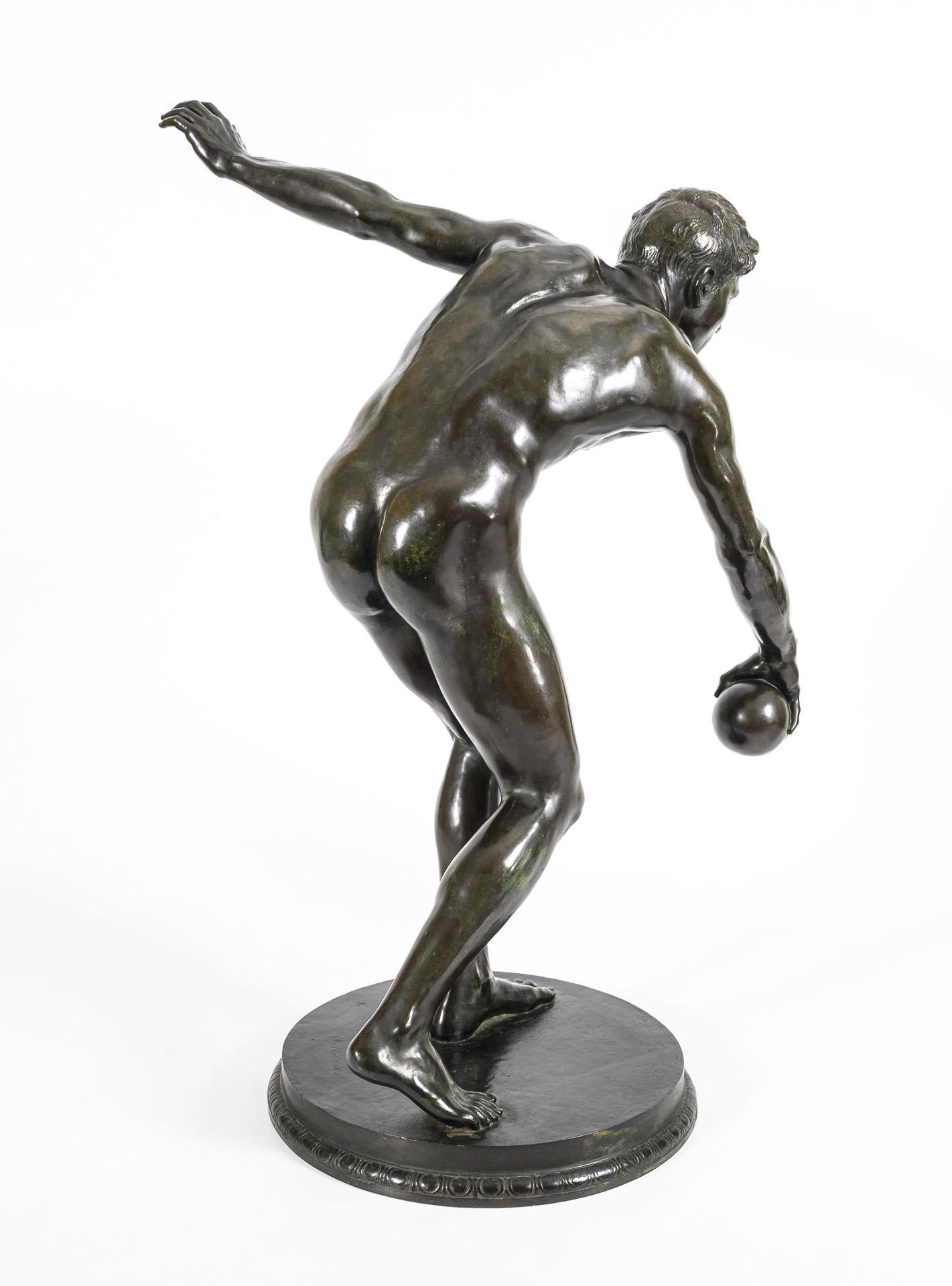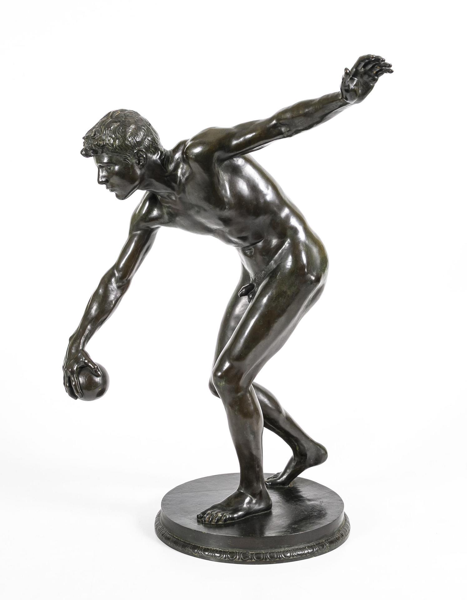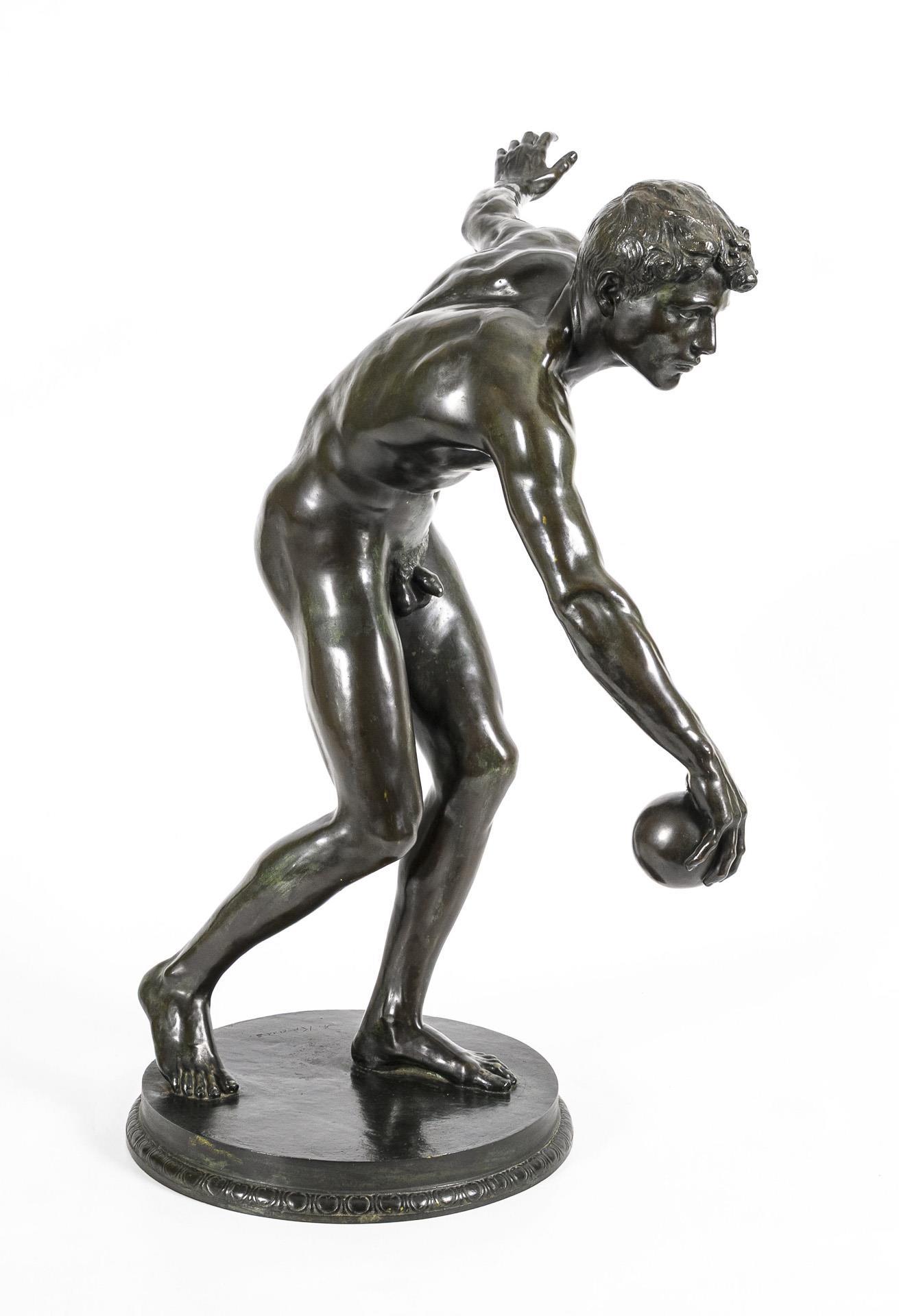 Akt eines athletischen jungen Mannes, der mit ausgreifender Geste bei voller Konzentration im Begriff ist, den Ball abzuwerfen. Thematisch erinnert dieser Moment an den berühmten Diskobolos des Myron aus der Antike. Patina berieben, teils grünlich korrodiert.