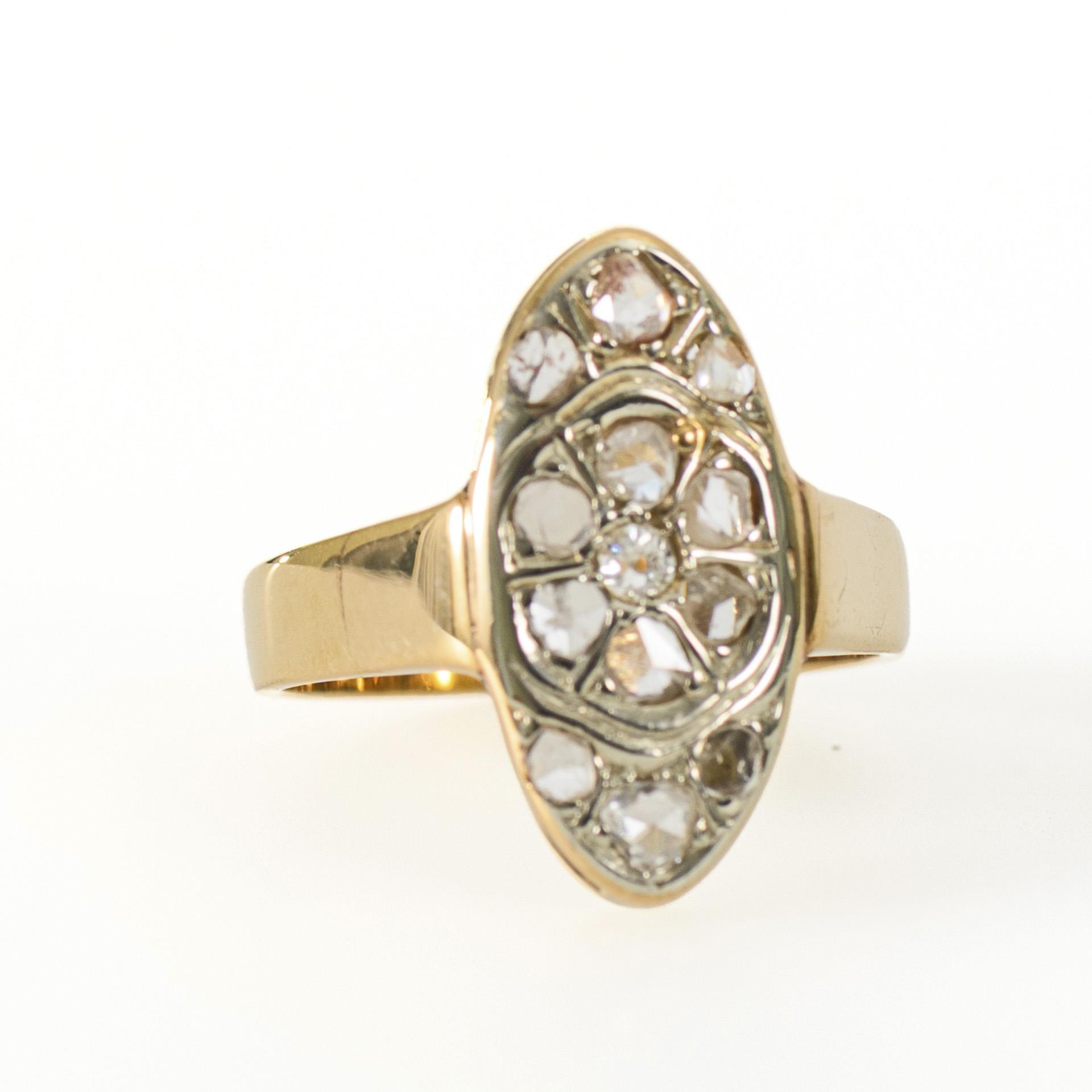 Historisierend gearbeiteter Navette- oder Schiffchenring mit Diamanten in historischem oder historisierend-grobem Schliff. Zentral ein blütenförmiges Element mit einem kleinen Altschliff-Brillanten.