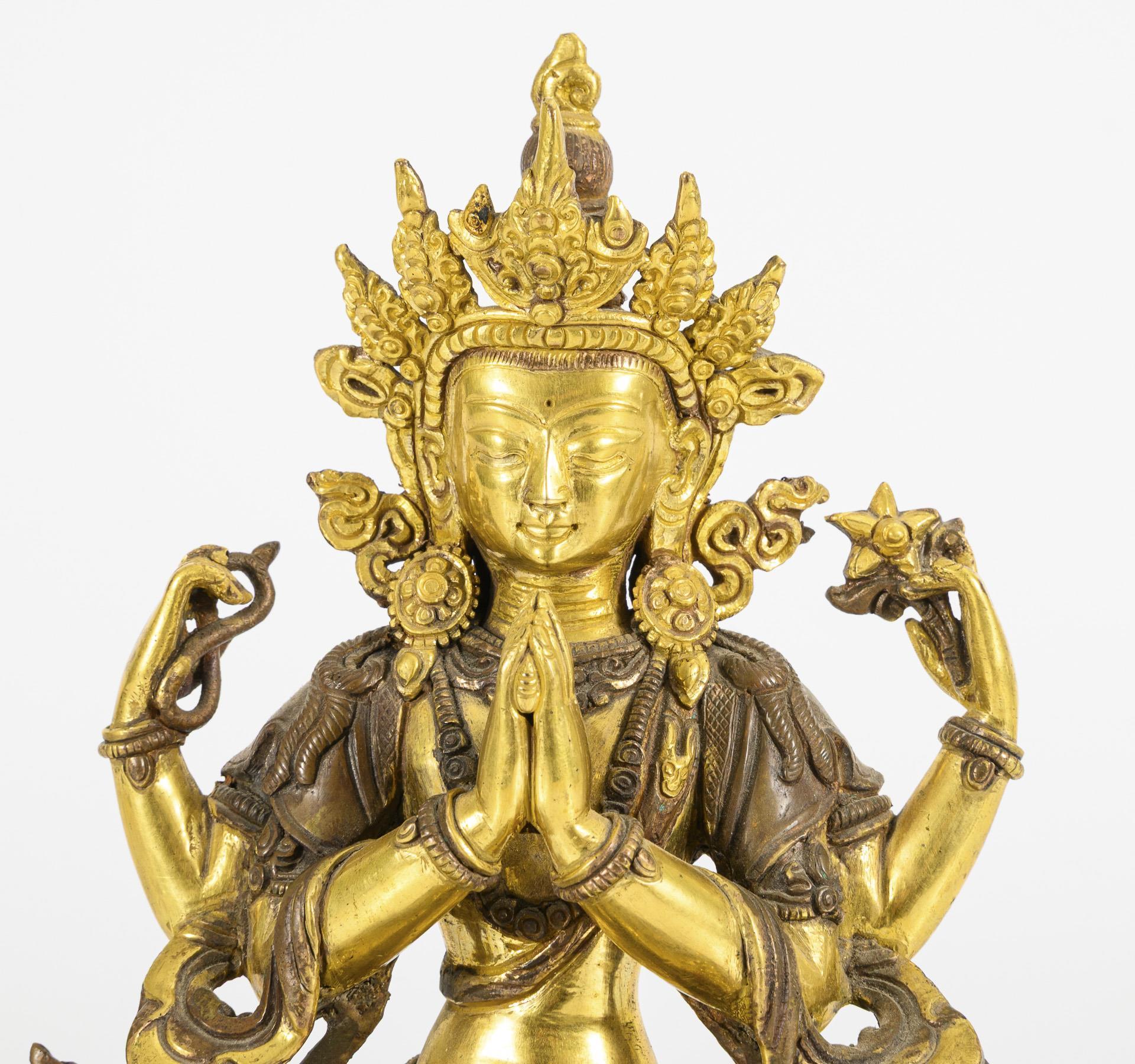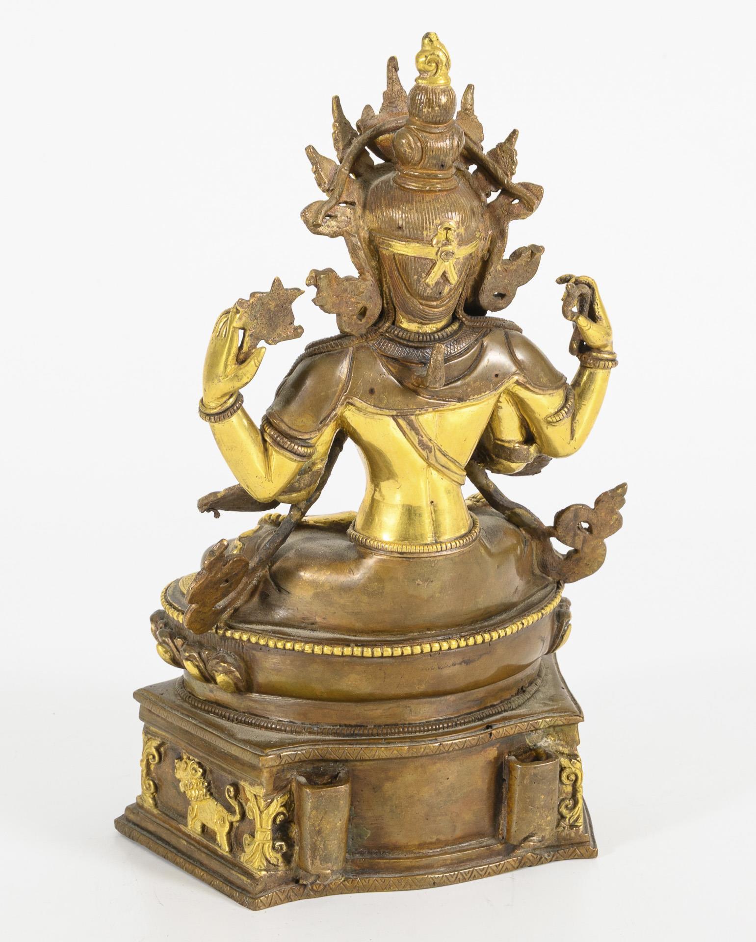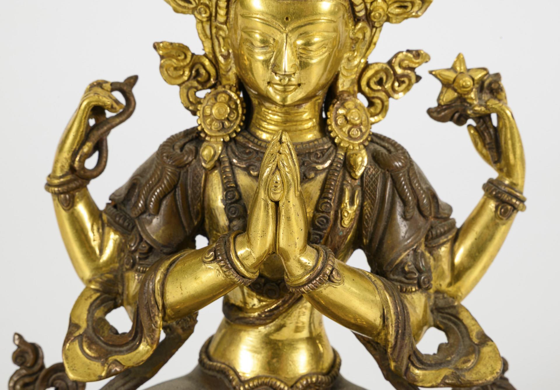 Auf geschmücktem Sockel und Lotosthron sitzende, vierarmige Figur, im Verschränkungssitz. Mit dem mudra der Verehrung (oder 'halten des Juwels') und in den anderen Händen Blüte und Schlinge haltend. Sockel seitlich mit Löwenapplikationen verziert. Gute Verarbeitung, rückseitig Halterung für fehlenden Aurakranz und ein Haken.