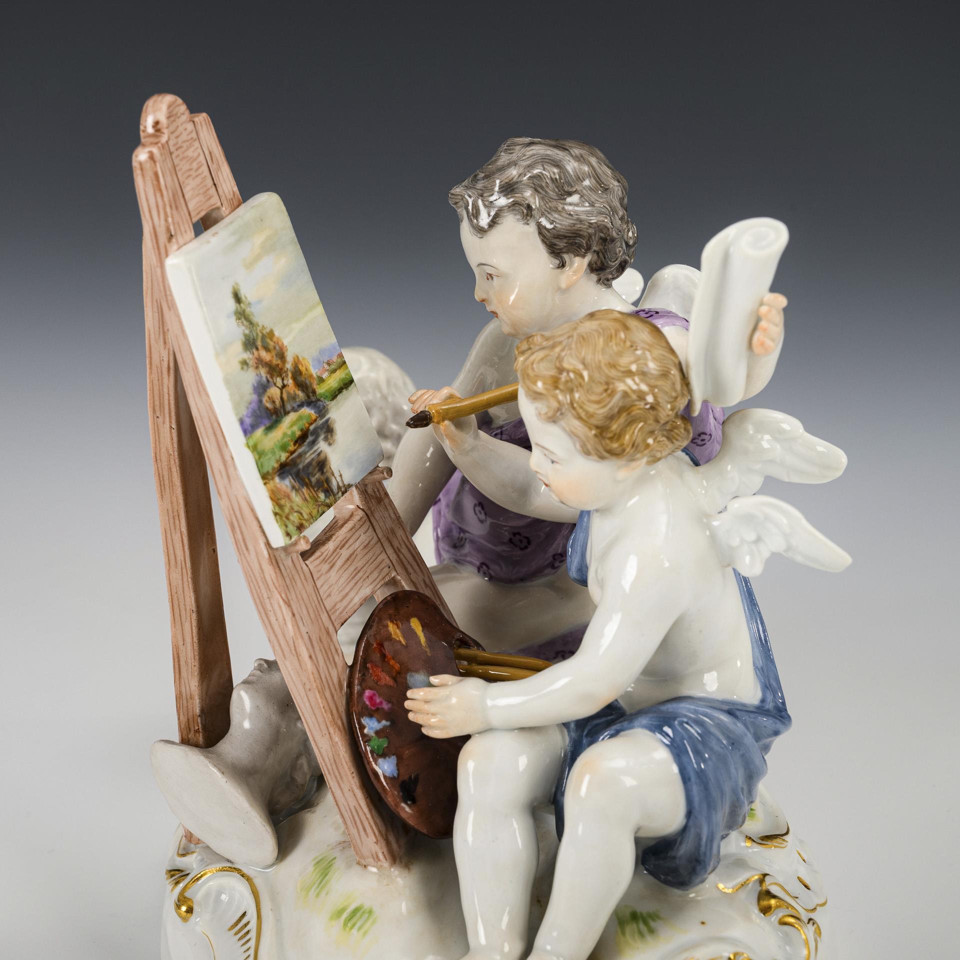 Zwei, vor einer Staffelei sitzende Putten mit Palette und zwei Büsten. 3 Pinsel und 1 Zeh restauriert.