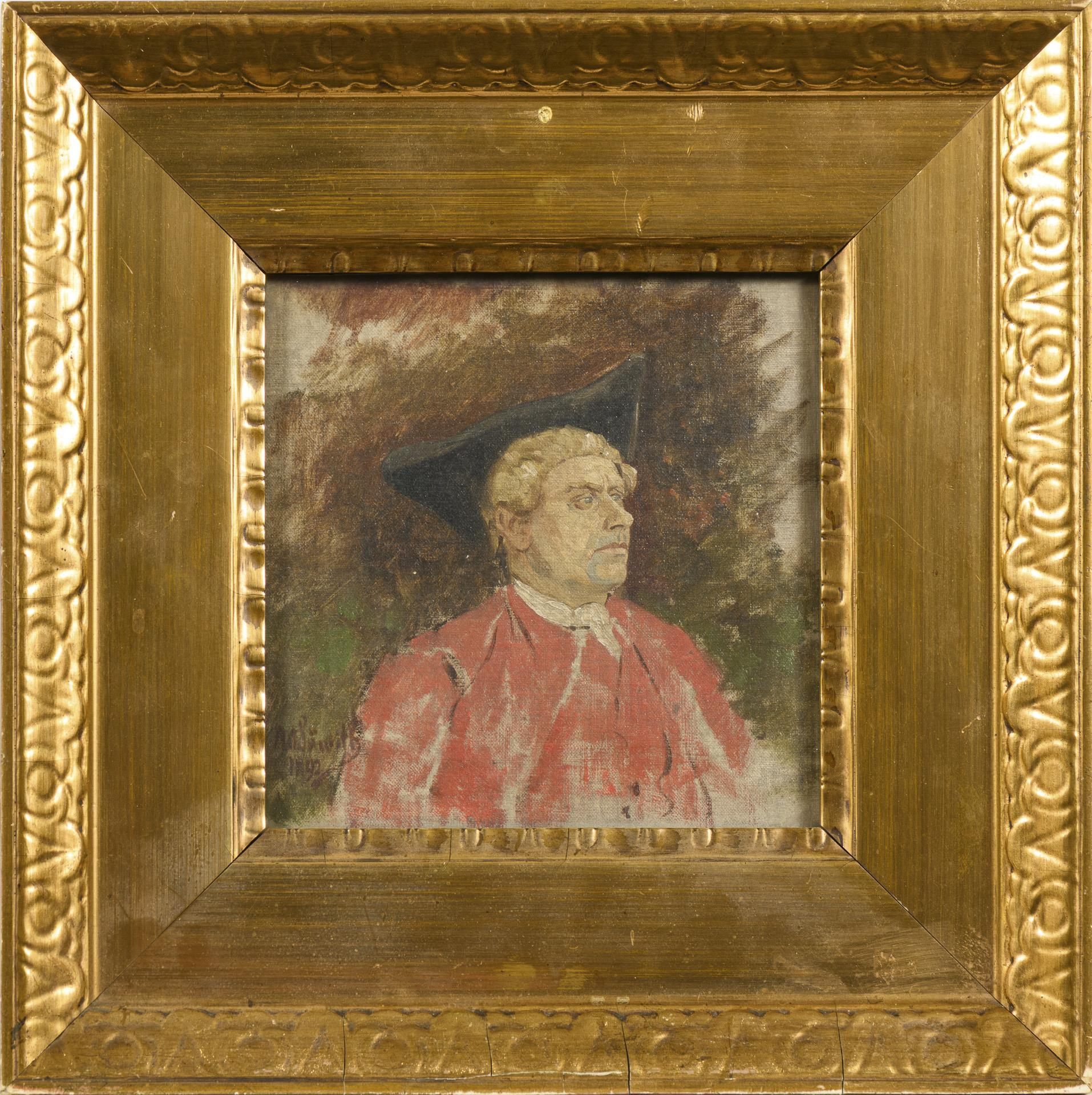 Porträt eines Mannes in der Kleidung des 18. Jahrhunderts mit rotem Gehrock und schwarzem Dreispitz.